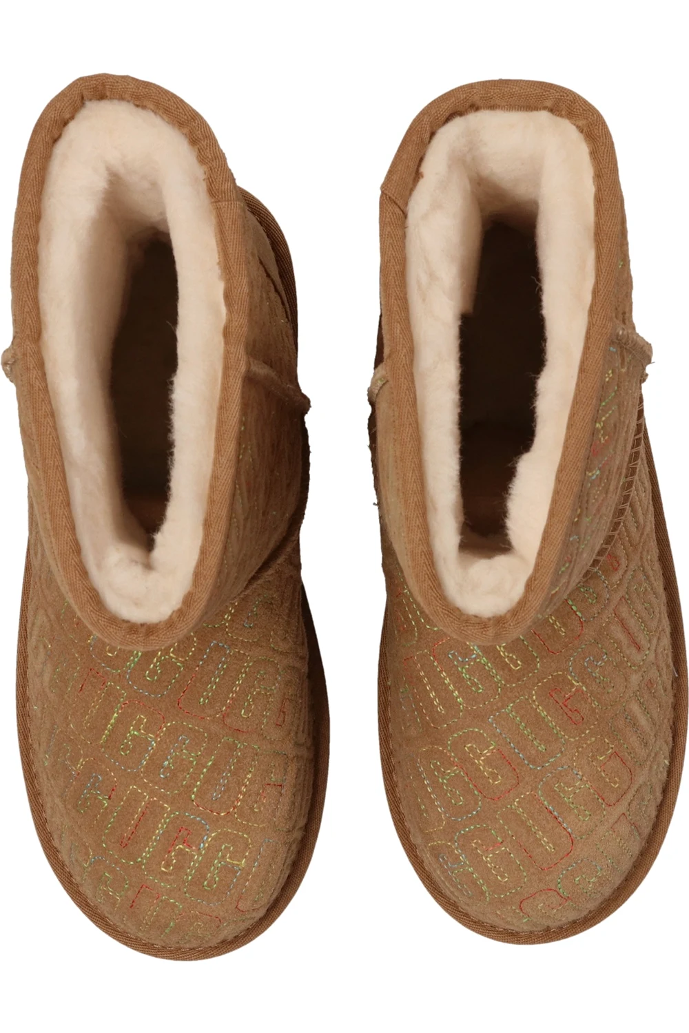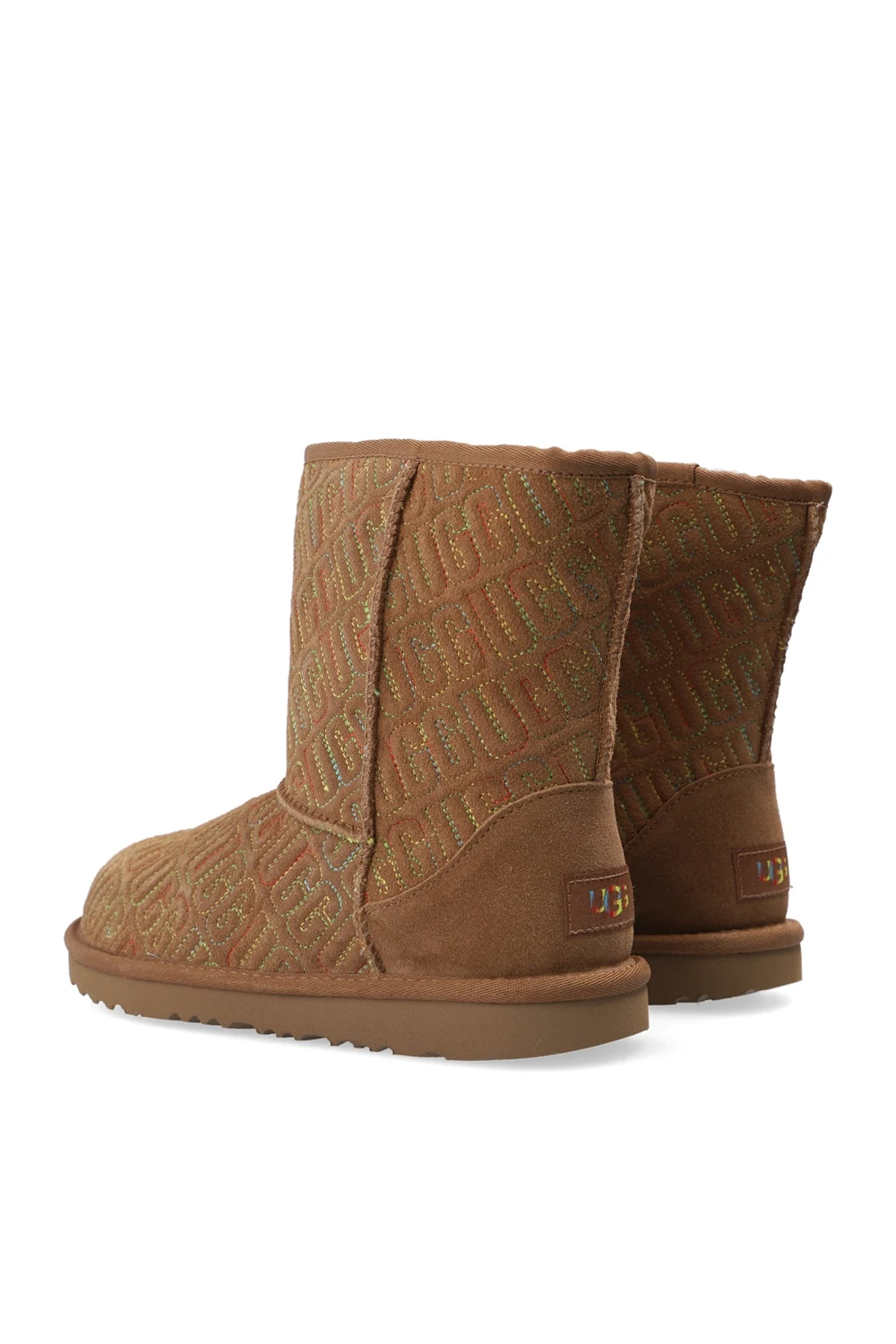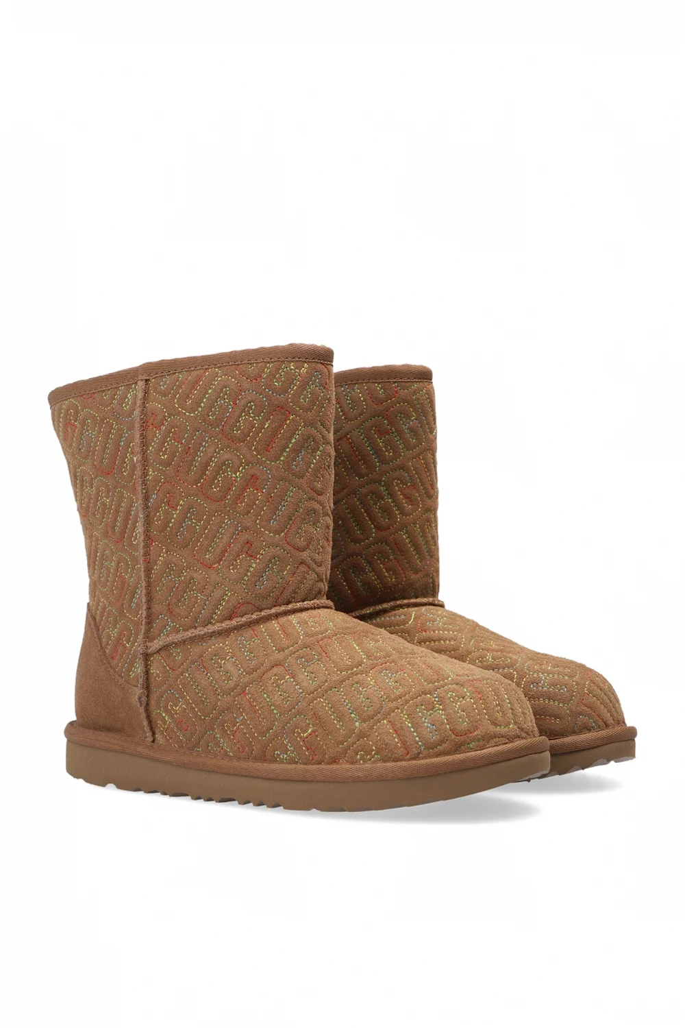 Beige ‘Classic II Graphic Stitch’ snow boots from UGG Kids. Crafted from suede and lined with sheep wool, this model is complete with an embossed logo with colorful stitching details, a logo appliqué sewn on at the heel and a textured EVA sole in light brown.
