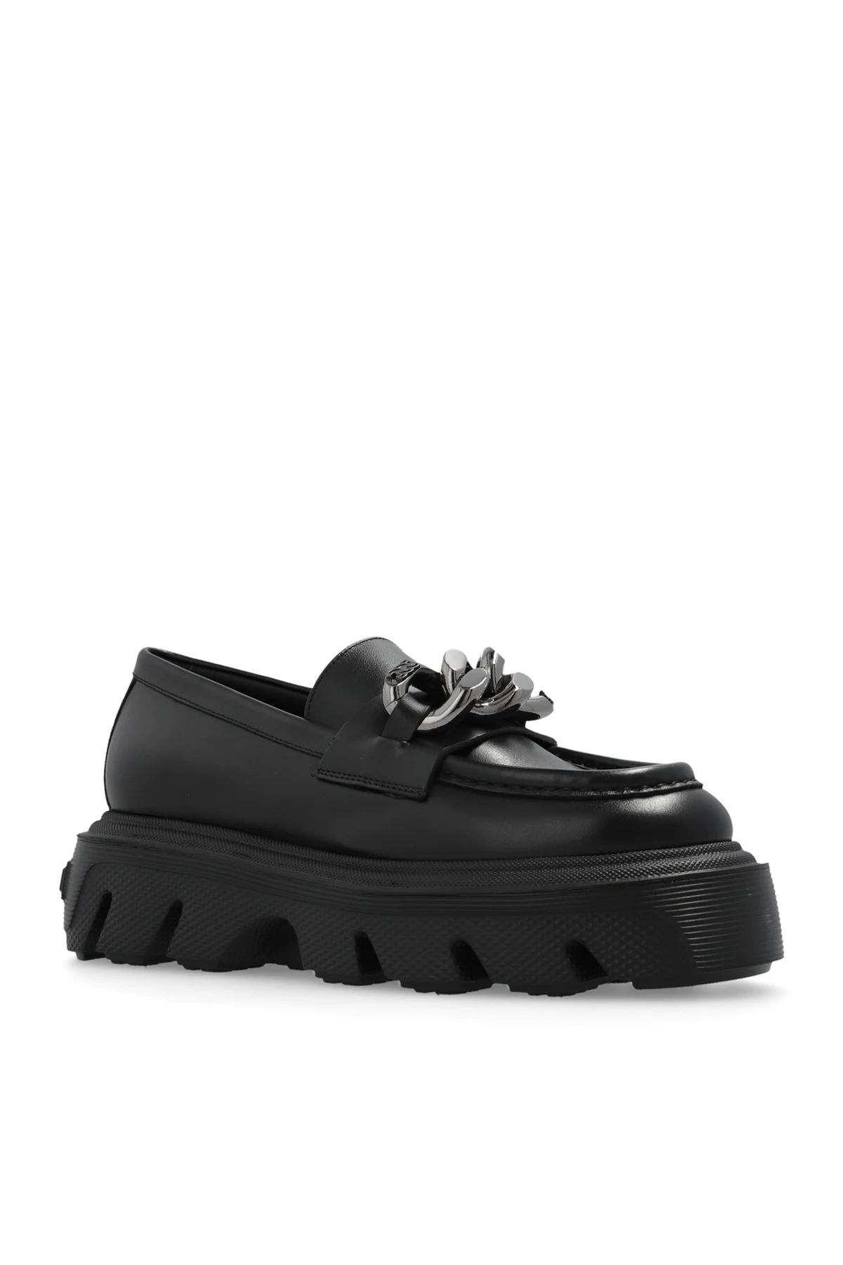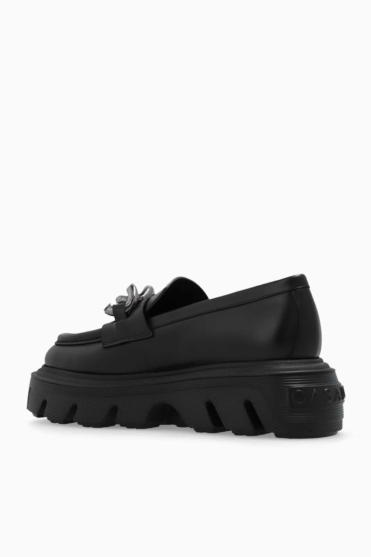 Black ‘Generation C’ platform loafers from Casadei. Made of leather, this model sits on a black rubber sole and features a frontal strap with silver-tone chain hardware with the brand's logo.
