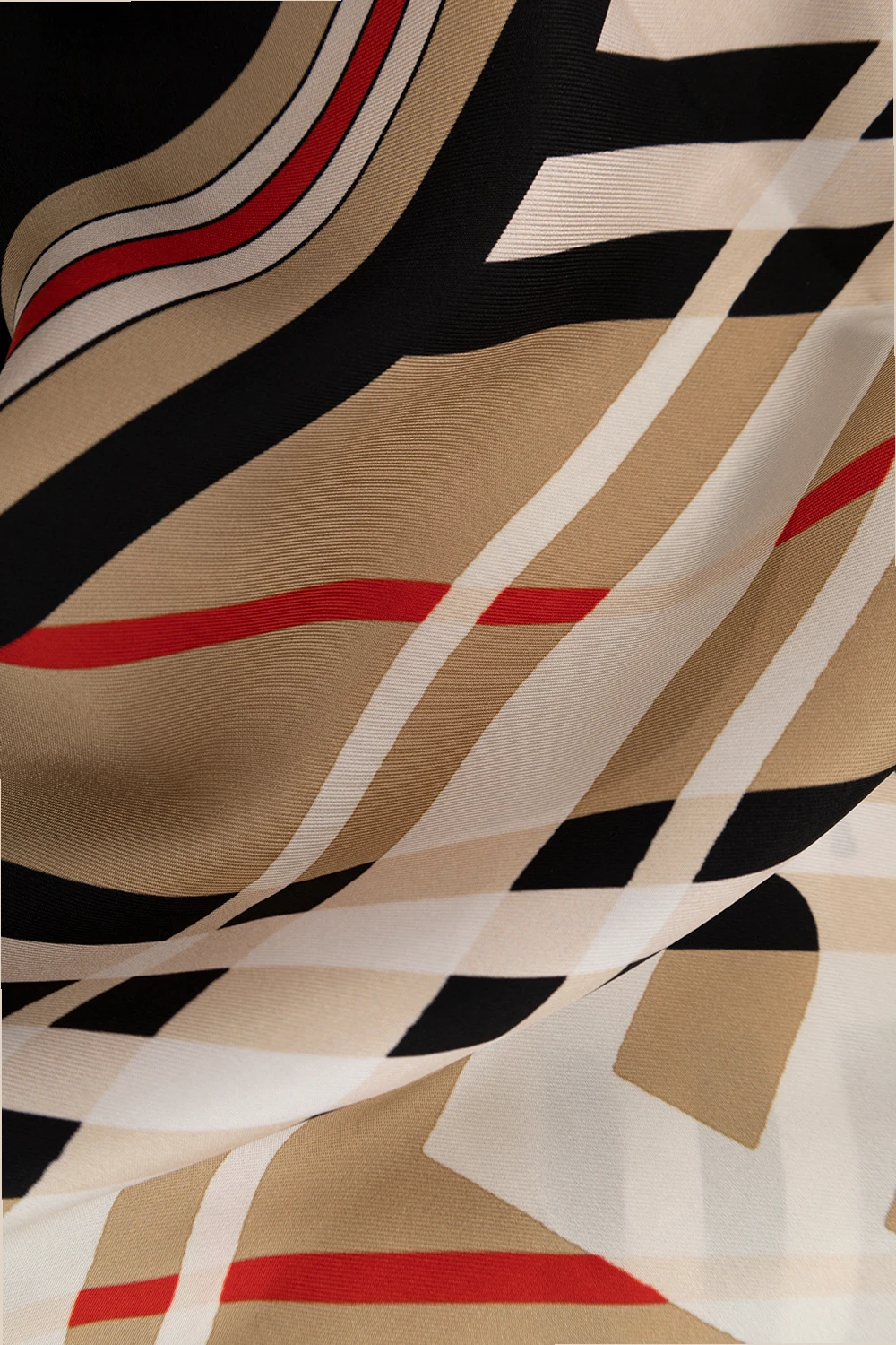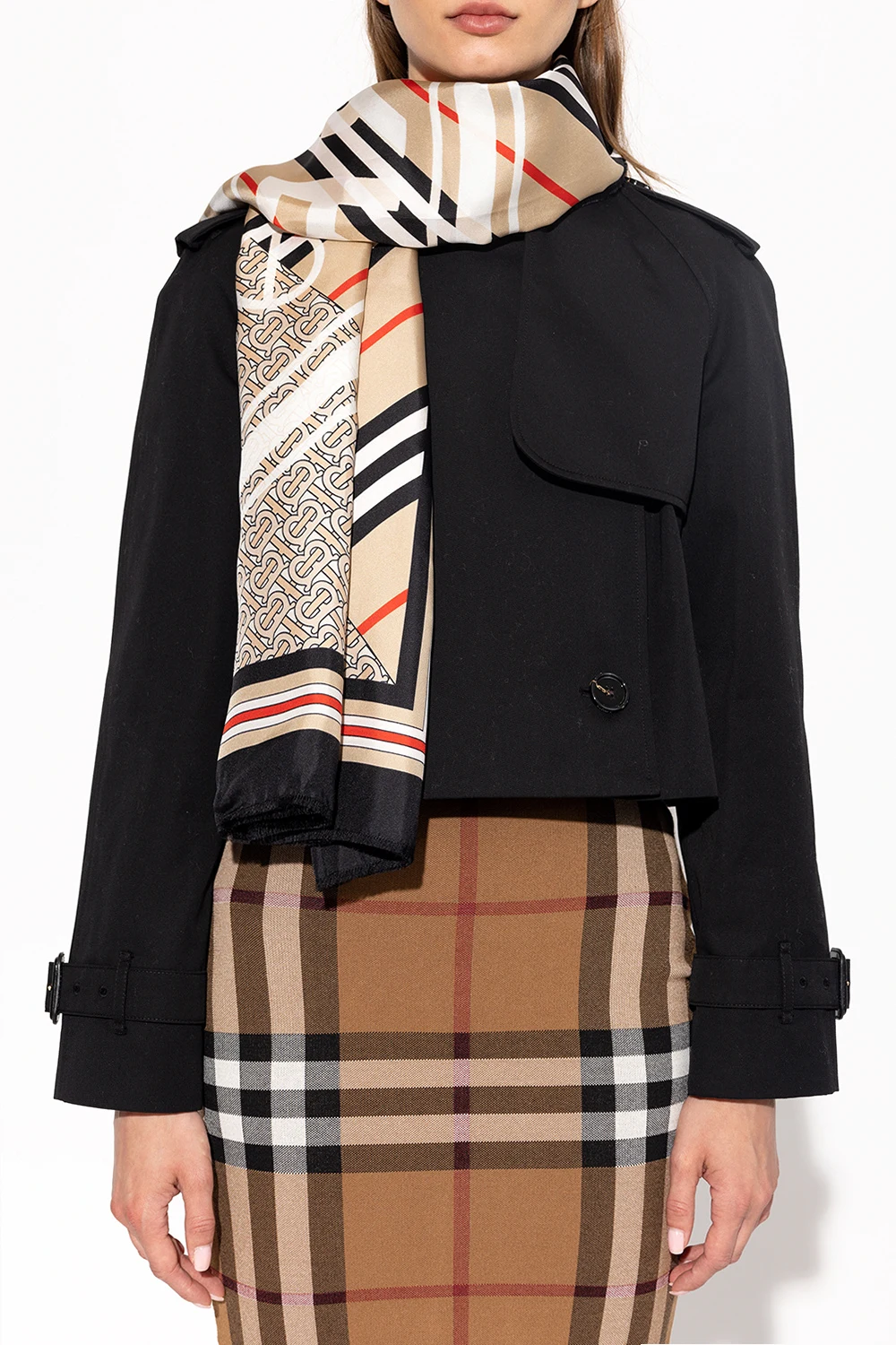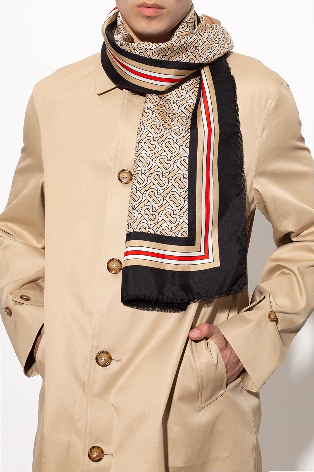 Beige, black and red scarf from Burberry. Made of silk, this design features a printed monogram pattern, white logo and raw cut edges.