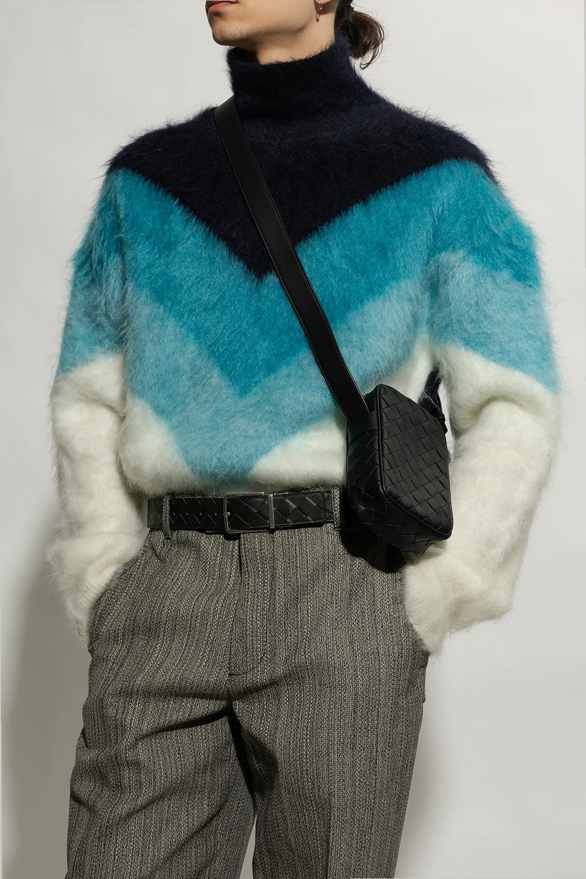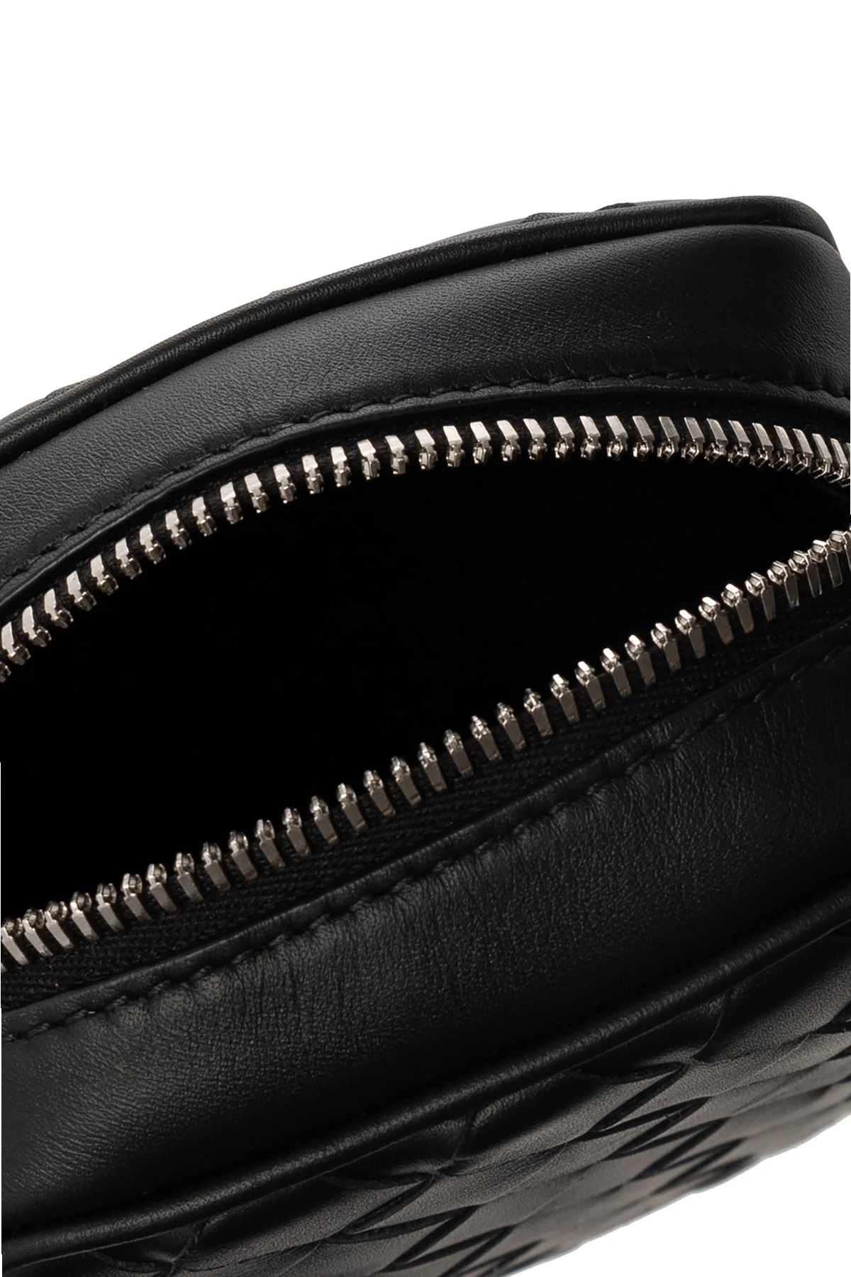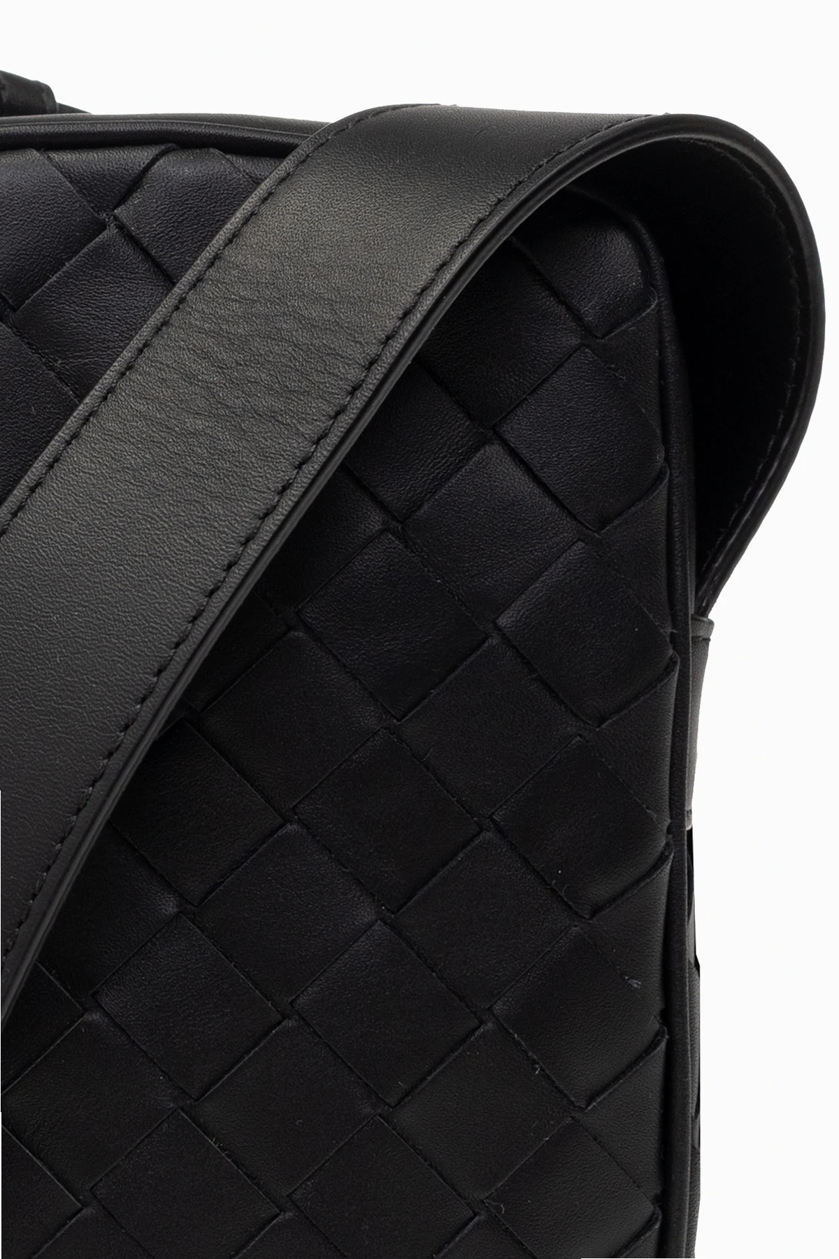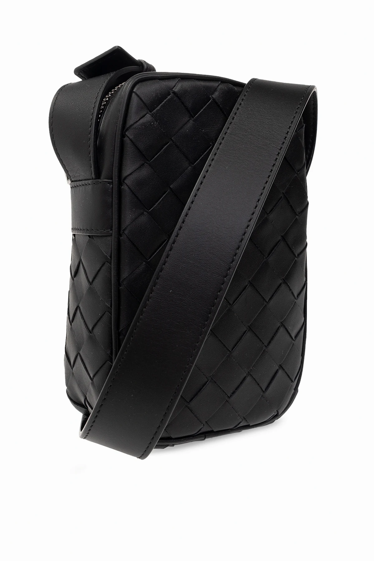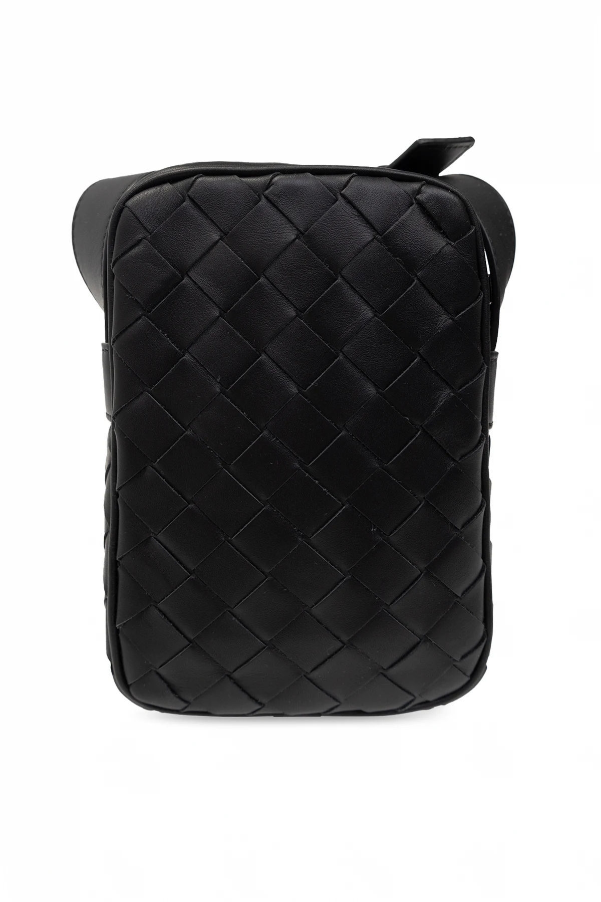 Schwarze Handytasche von Bottega Veneta. Aus Kalbsleder gefertigt. Mit Reißverschluss. Verziert mit dem markentypischen 'Intrecciato'-Geflecht. Verstellbarer Schultergurt. Innen ein Fach mit drei Kartenfächern. Metallische Verzierungen in Silberfarbe.