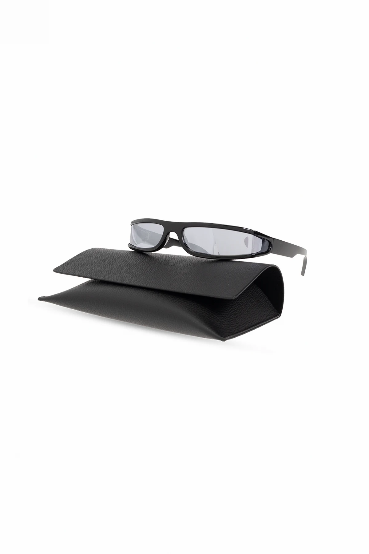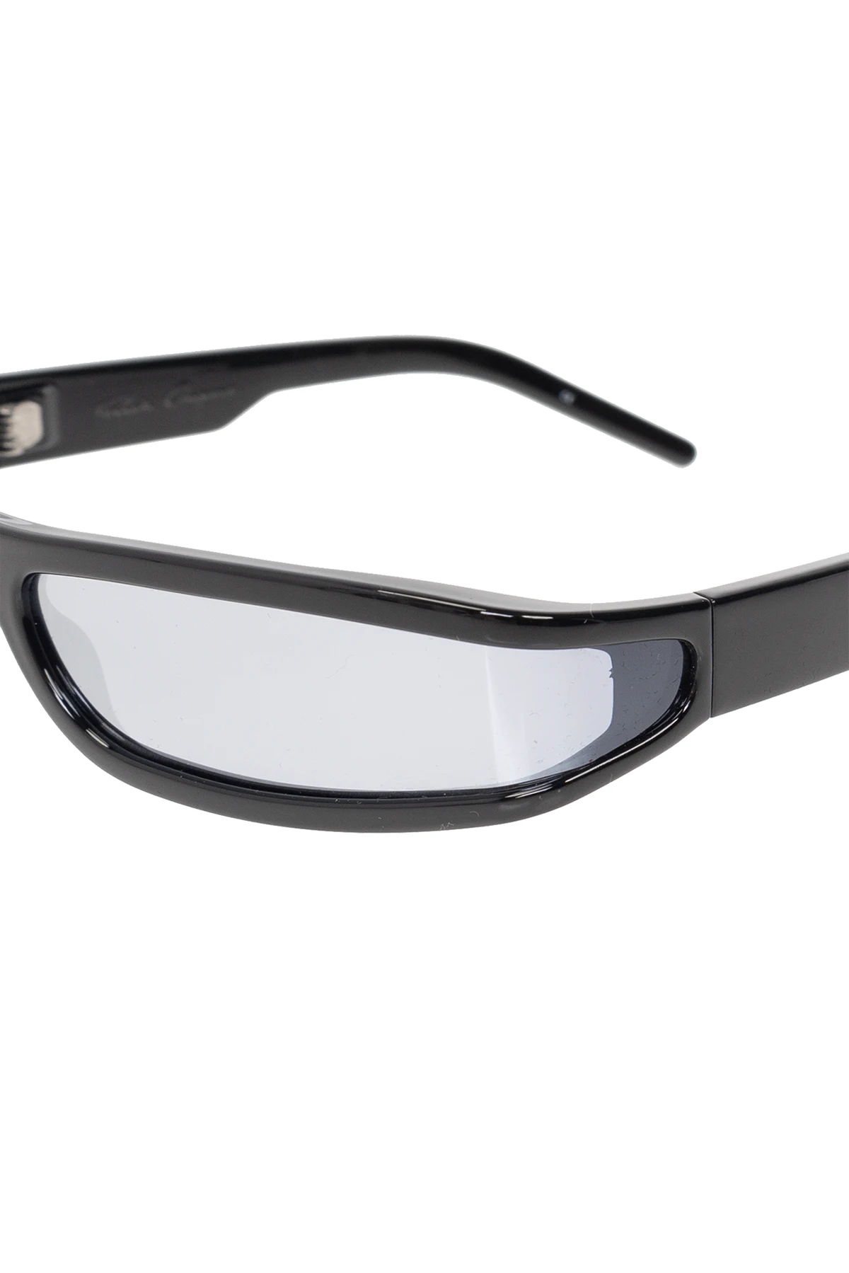 Black sunglasses from Rick Owens. This pair features a thin frame and grey lenses with a silver-tone mirror effect. Case included.