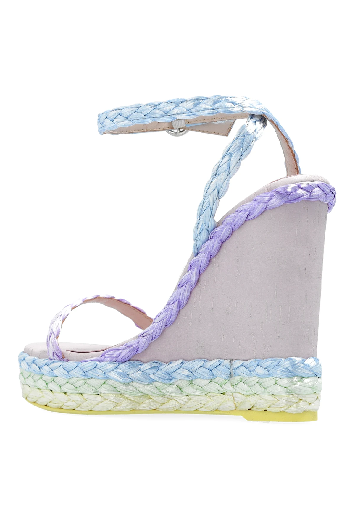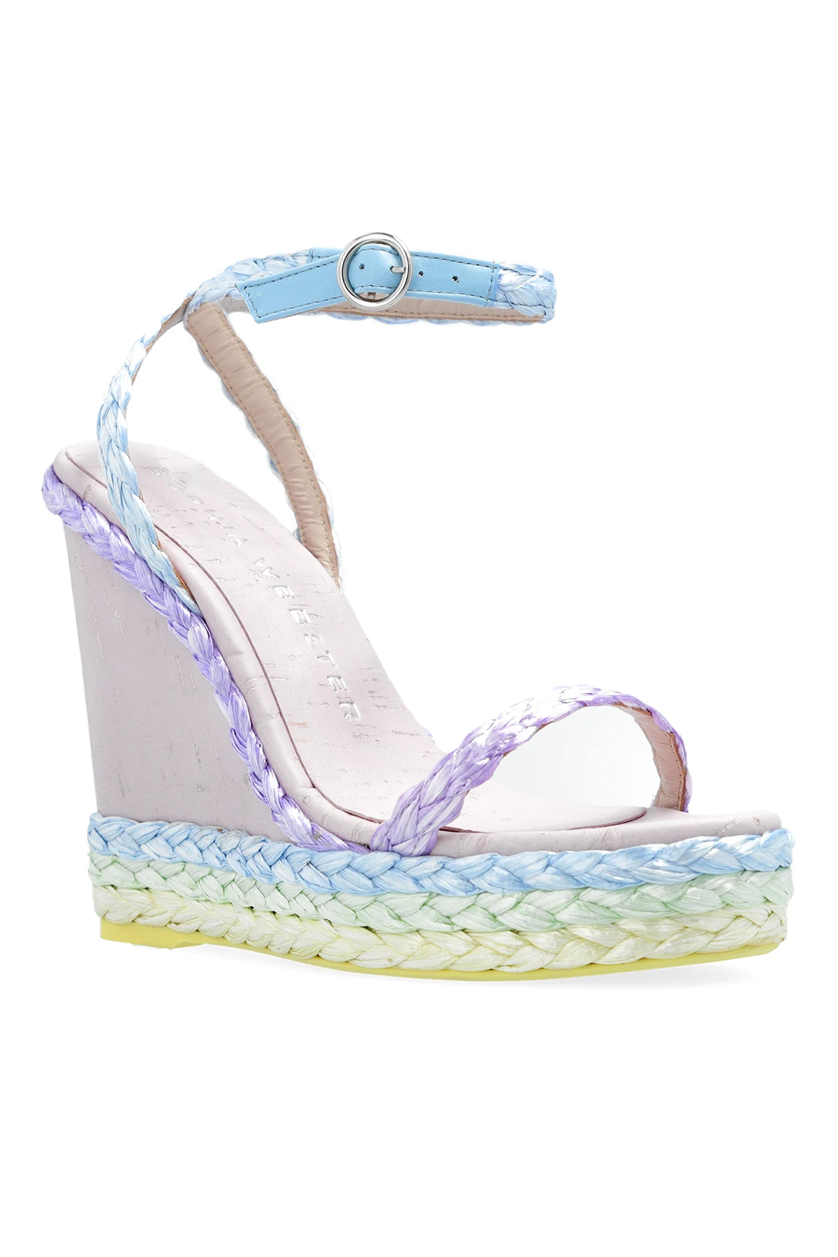 Purple ‘Valentina’ wedge sandals from Sophia Webster. Made of leather with multicolored pastel woven straps, this pair features an adjustable buckle strap, almond toe and yellow rubber sole.