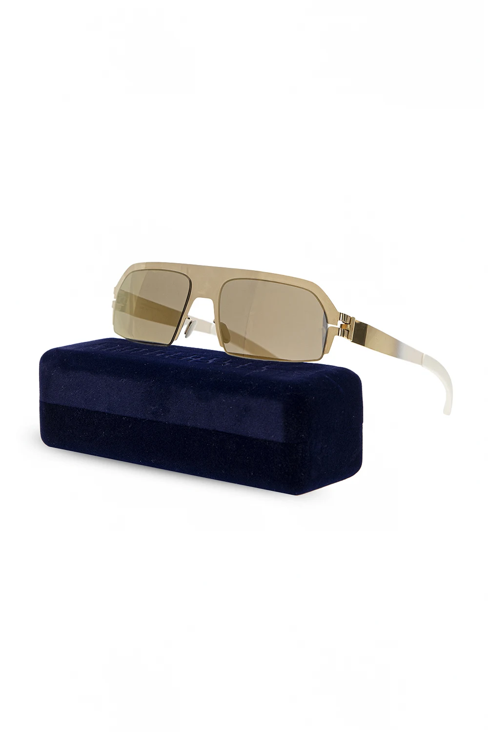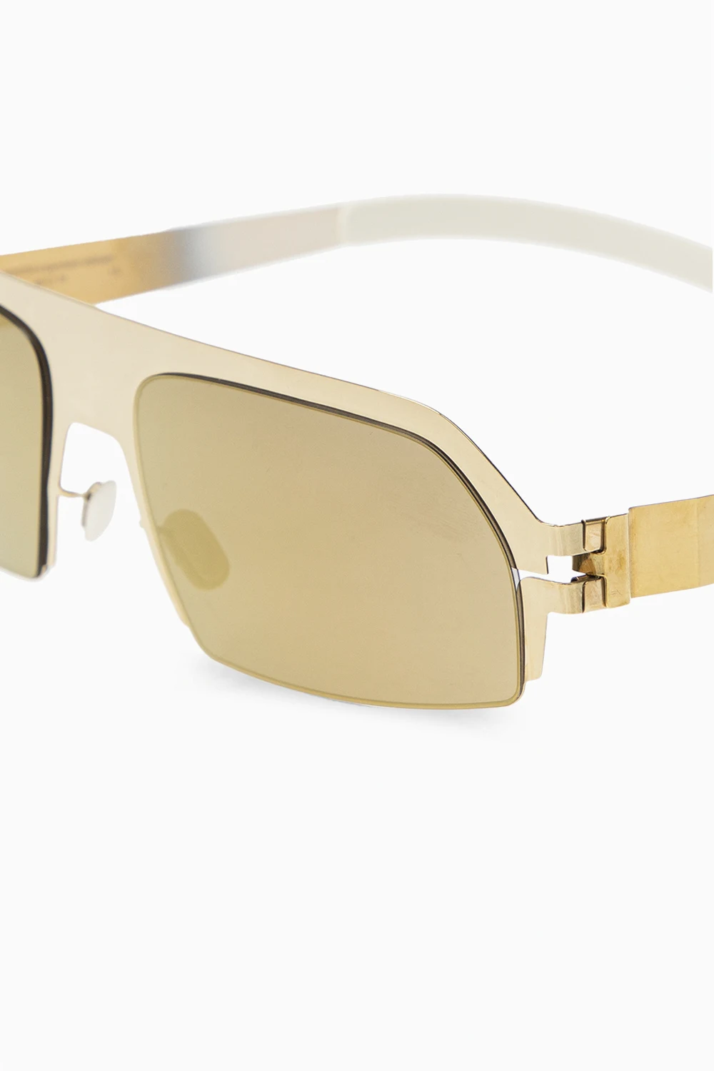 Gold-tone and white ‘Lost’ sunglasses from Mykita x Bernhard Willhelm. Hand-crafted from stainless steel and silicone, this model has gold-tone certificated lens with an extra antireflection coating for the ultimate 100% UVA/UVB protection. Branded protective case included.