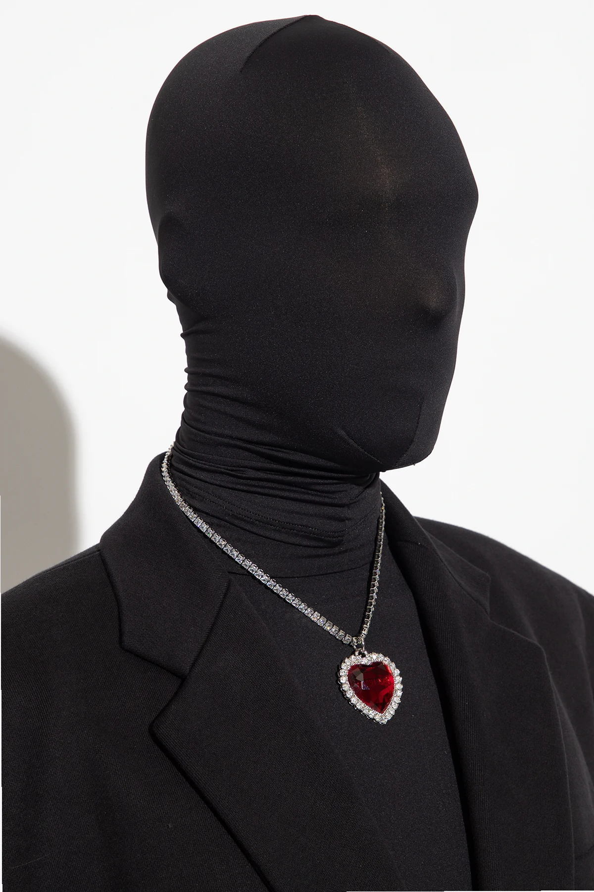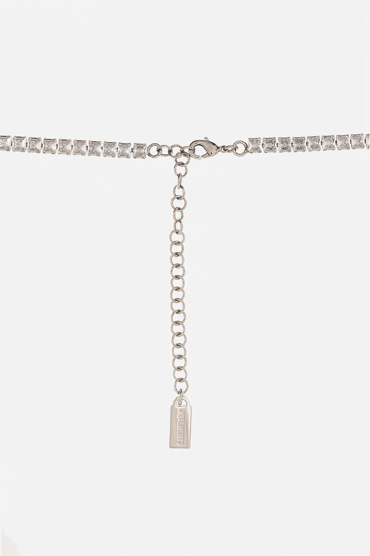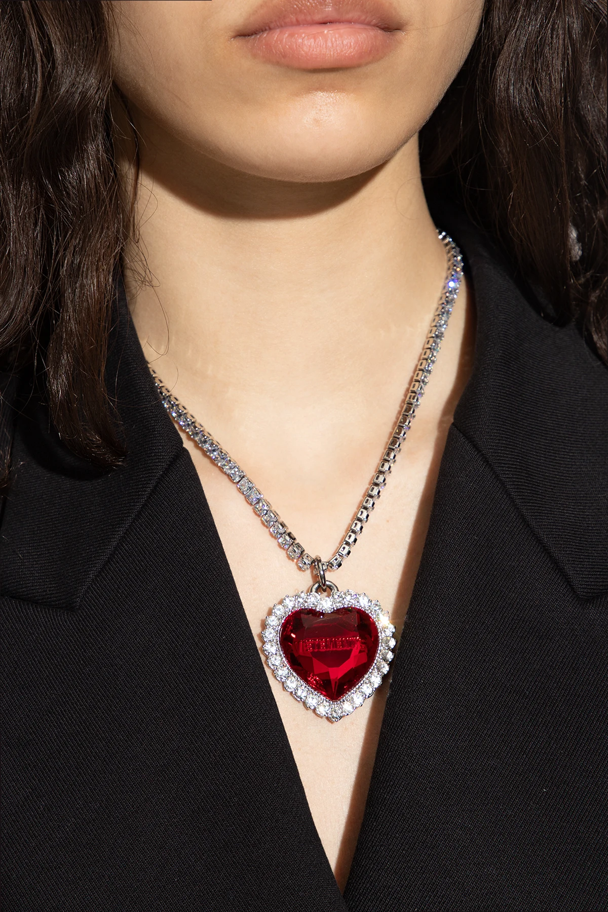 Silver-tone necklace from VETEMENTS. Made of brass and crystals, this item features an adjustable lobster clasp closure and a decorative heart-shaped pendant in red with a logo.