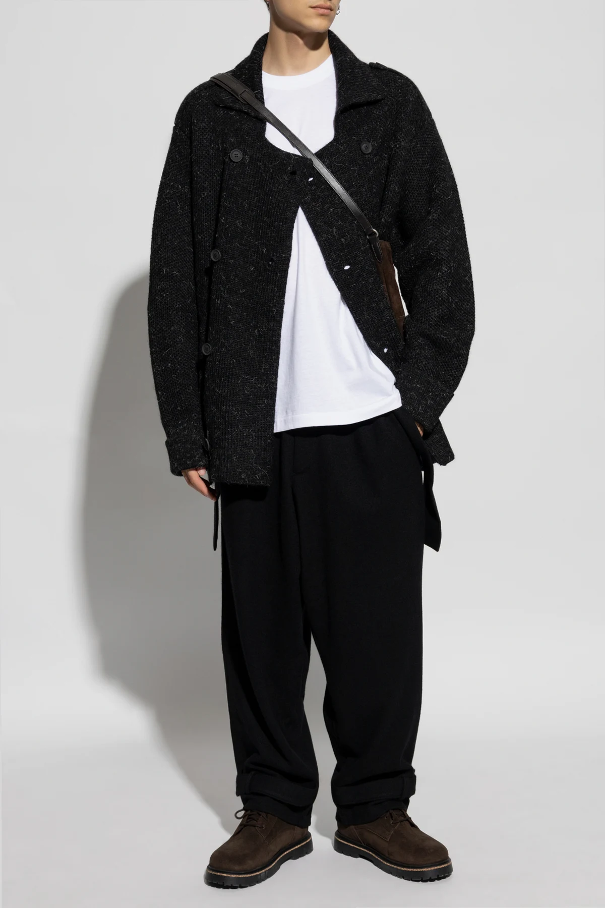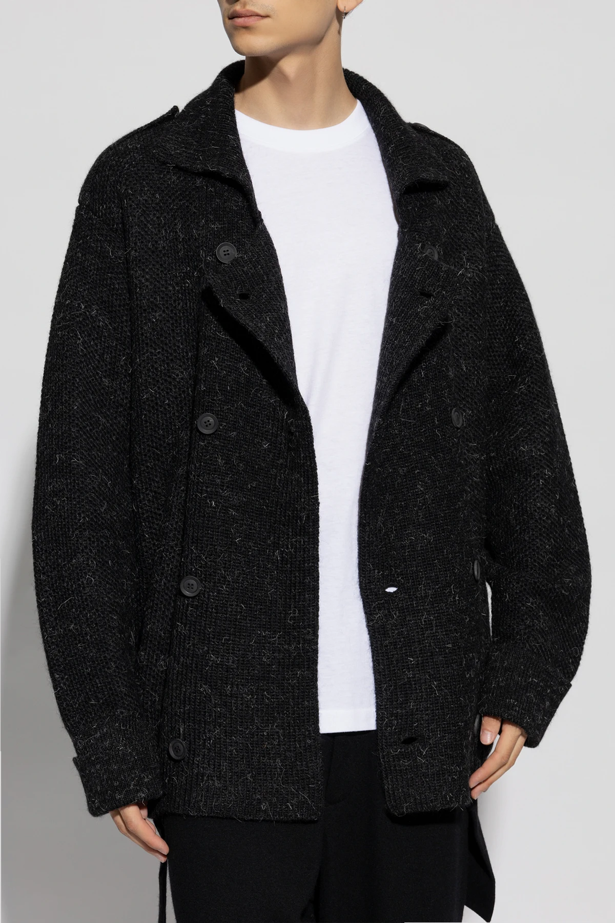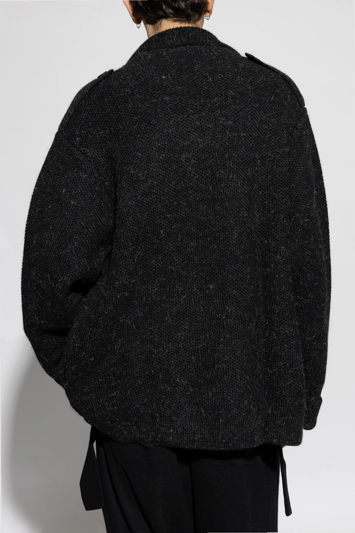 Der Pullover besteht aus hochwertiger Melangewolle, die außergewöhnliche Weichheit und Wärme bietet. Der doppelreihige Schnitt mit zwei Reihen großer, sichtbarer Knöpfe und einem breiten Kragen verleiht ihm einen unverwechselbaren Charakter. Zusätzliche Knöpfe an den Schultern bilden ein subtil ausgefeiltes Stil-Detail.