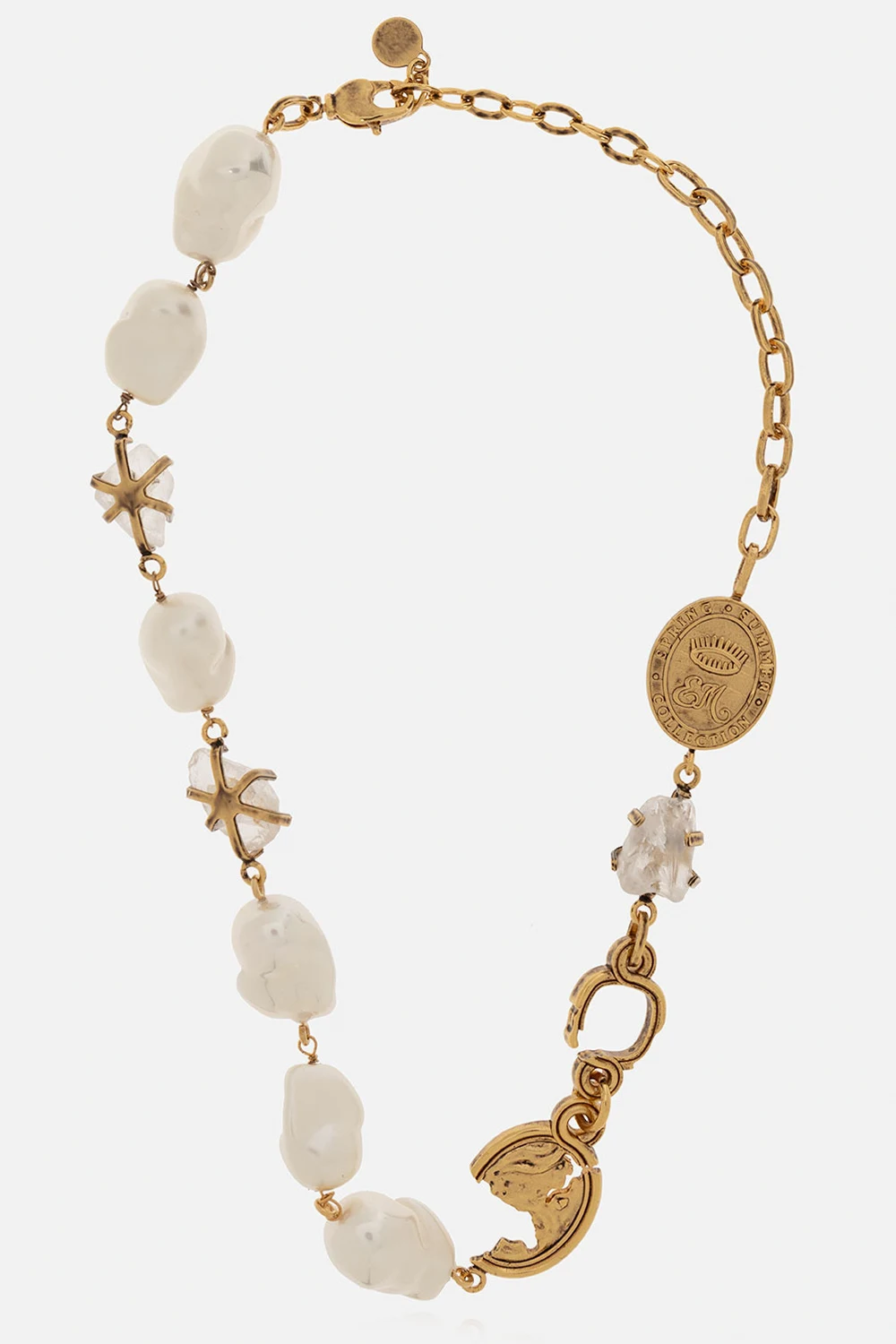 Gold-tone necklace from Erdem. Made of brass. Fastened with a lobster clasp, this item is embellished with faux pearls with irregular shapes, stones and charms.