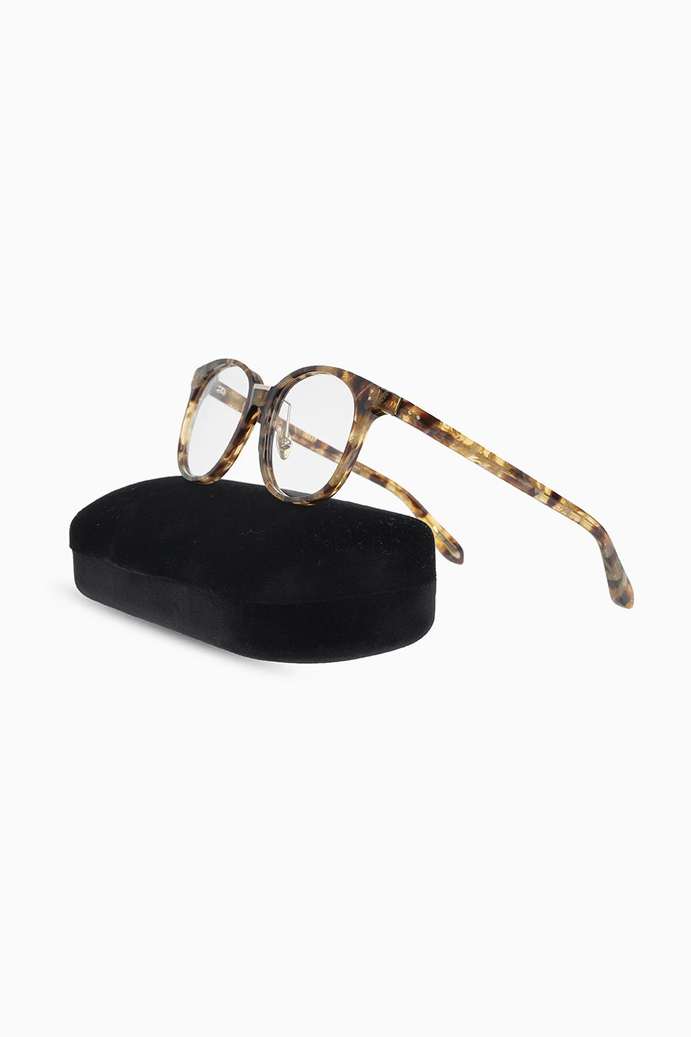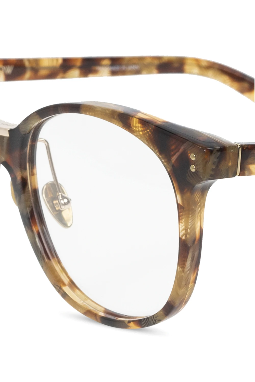 Brown and cream ‘Palla’ optical glasses from Linda Farrow. Made of acetate, this pair features a pattern and engraved logo. Handcrafted in Japan.