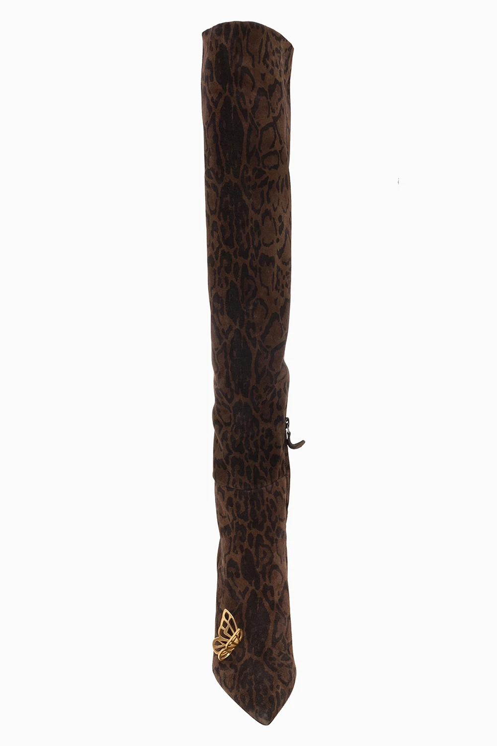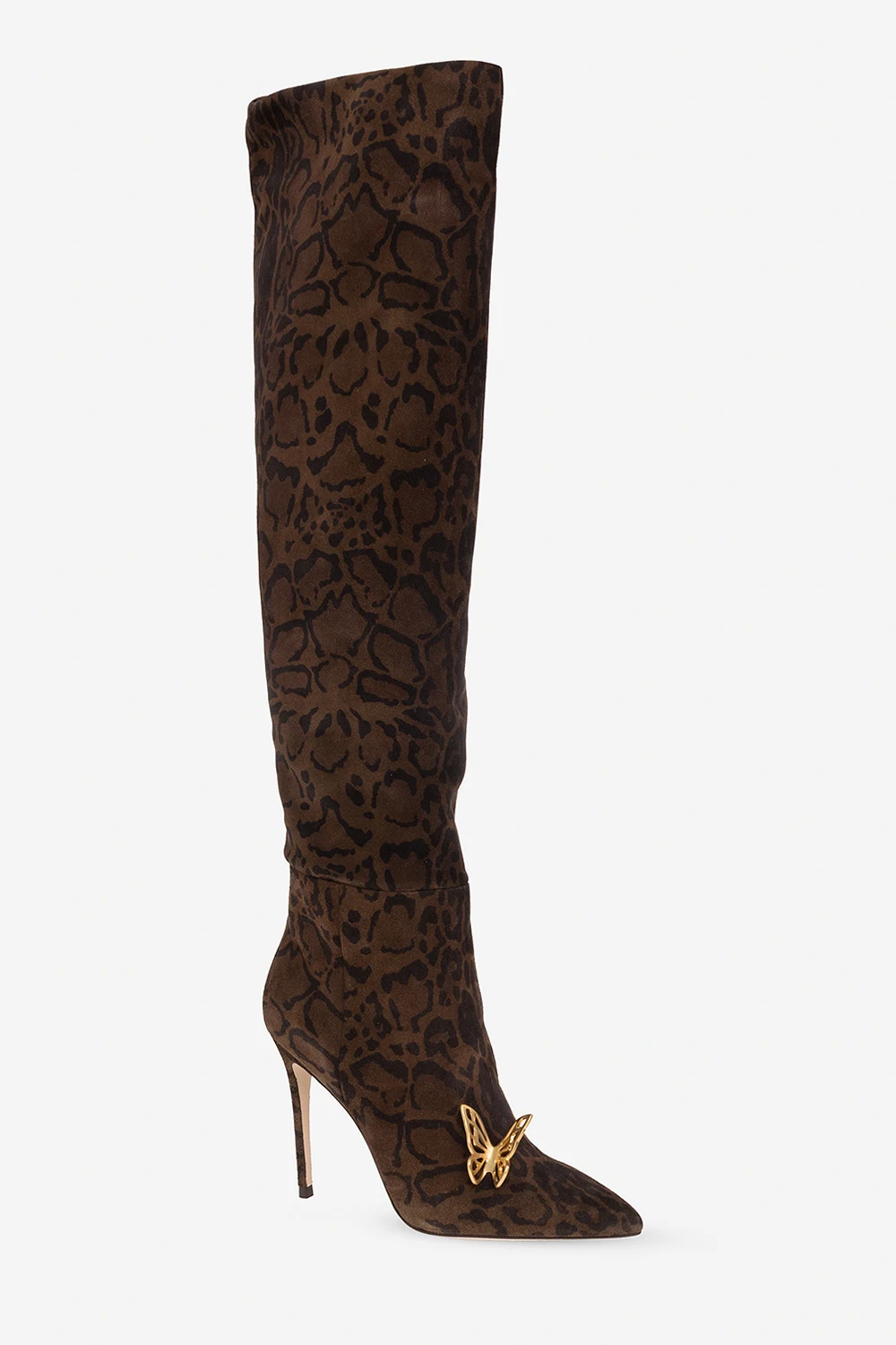 Brown and black ‘Mariposa’ heeled over-the-knee boots from Sophia Webster. Crafted from suede with a leopard print, this model features a ruched upper that can be pulled down below the knee for versatility, the brand's signature gold-tone butterflies hardware, a pointed toe and a beige leather sole.