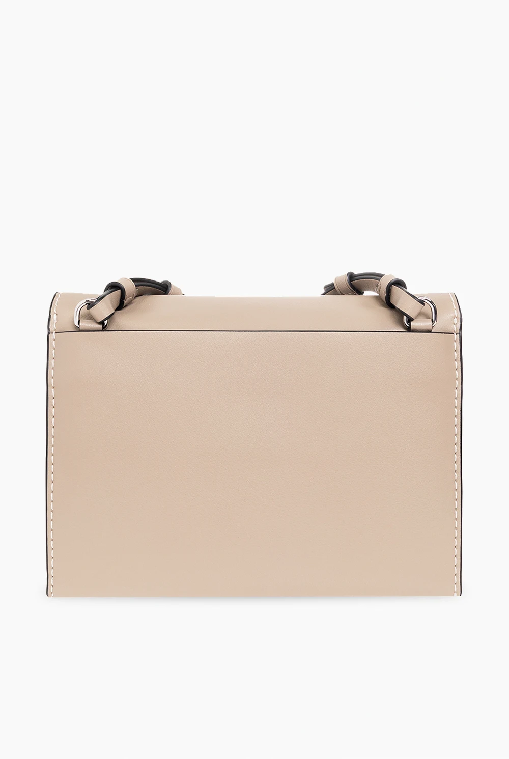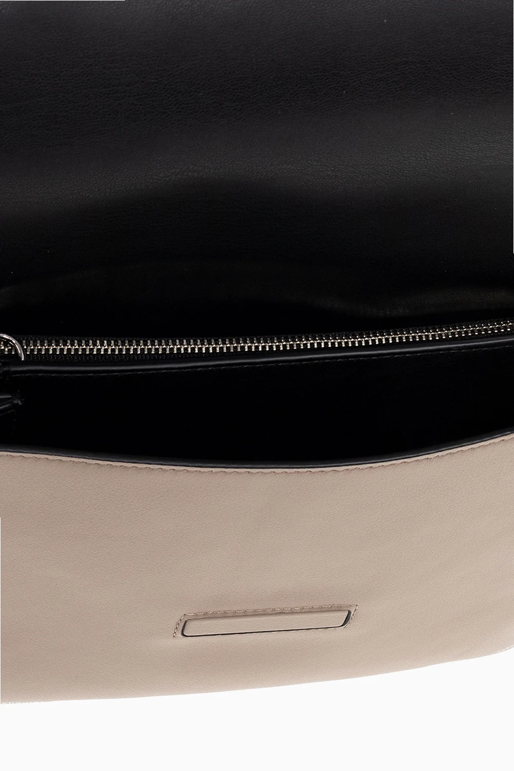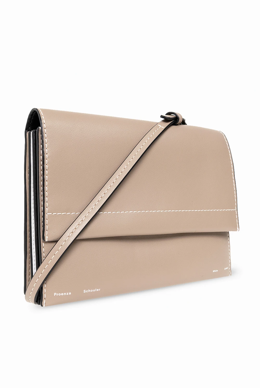 Greyish beige, black and white ‘Accordion‘ shoulder bag from Proenza Schouler White Label. Crafted from calf leather, this model features a flap with a magnetic closure, logo print, white stitching details, back pocket, detachable shoulder strap, silver-tone metal hardware and three separate internal compartments with one zip pocket and eight card slots.
