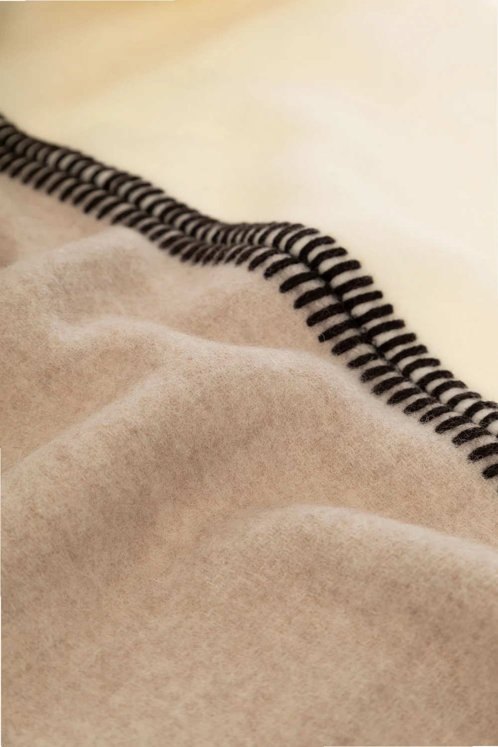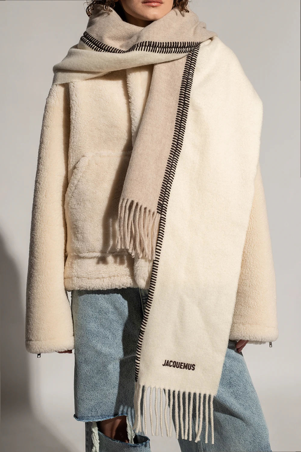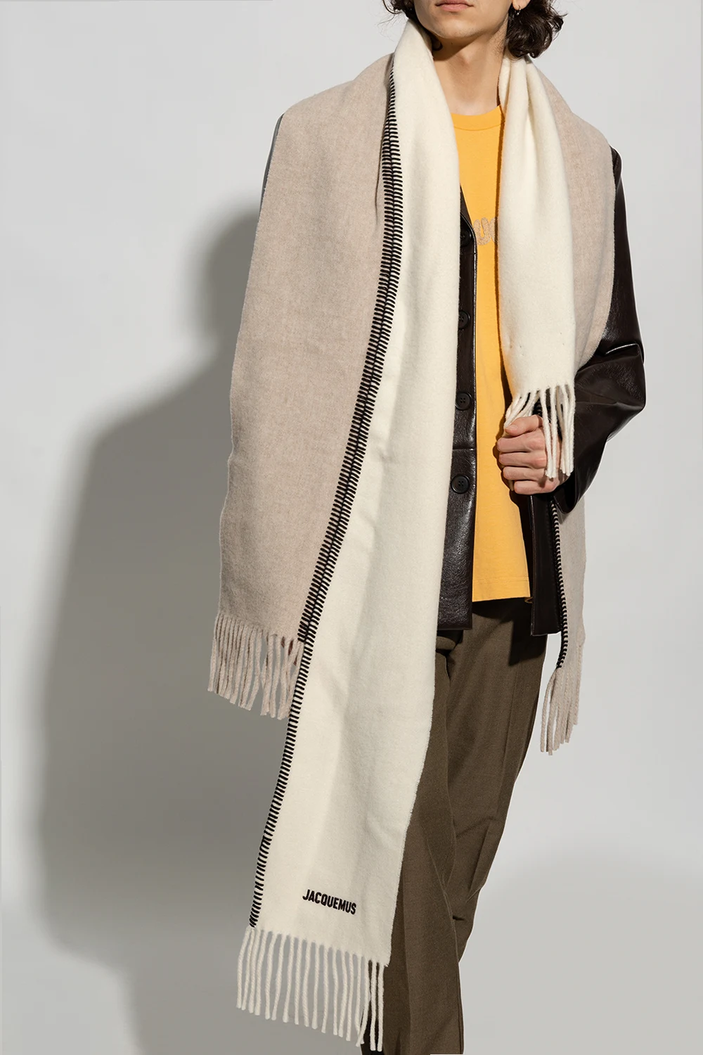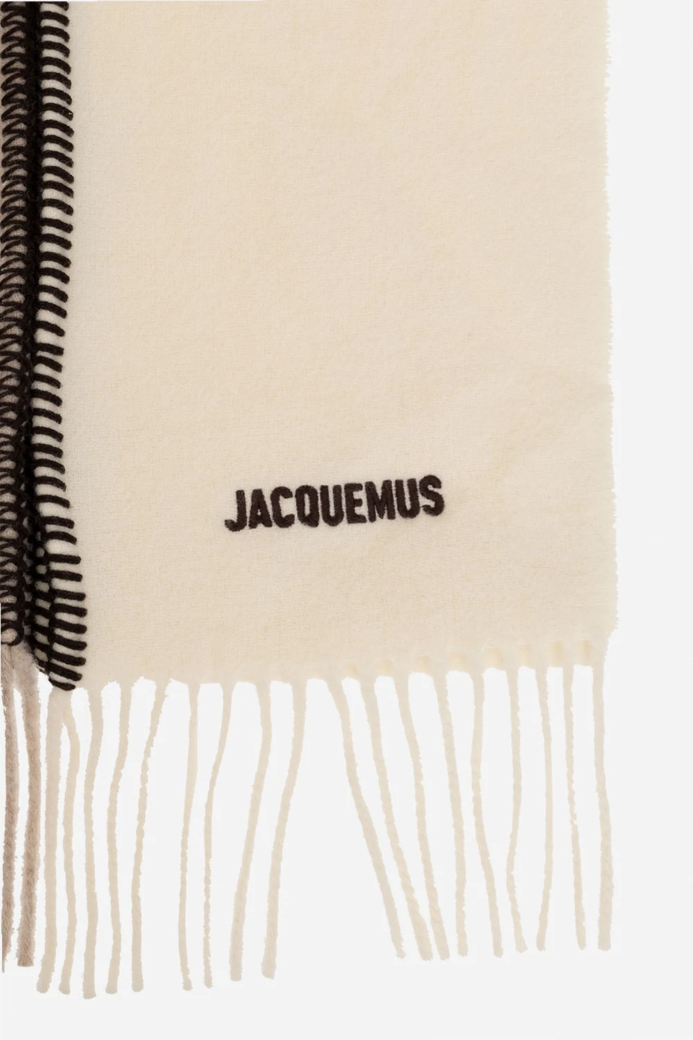 Cream and beige ‘Pampero’ asymmetric scarf from Jacquemus. Made of virgin wool, this design features decorative stitching details, black logo embroidery and fringe edges.
