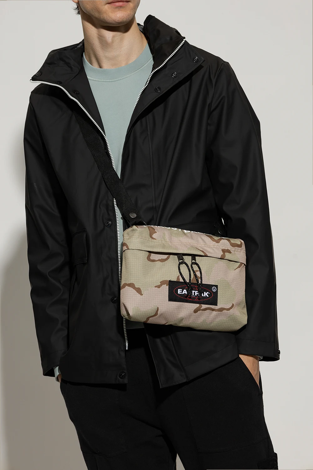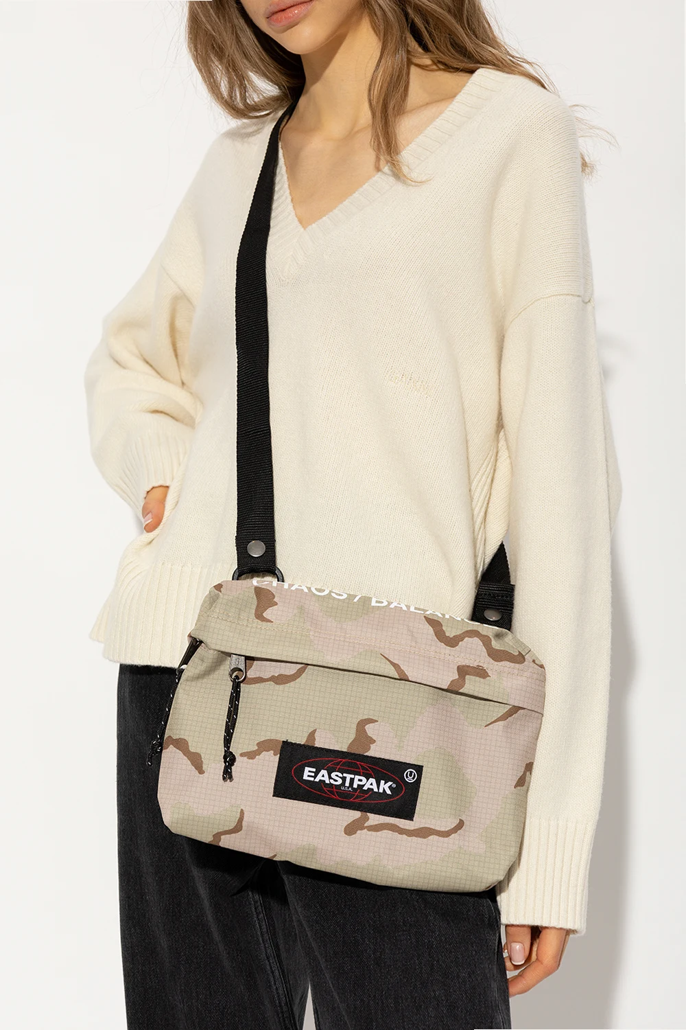 Green and beige shoulder bag from Undercover x Eastpak. Crafted from recycled materials and embellished with a camo motif, this design secures with a two-way zipper and features a logo patch, a white graphic print, a zip front pocket, black metal hardware and one internal compartment with a zip pocket.