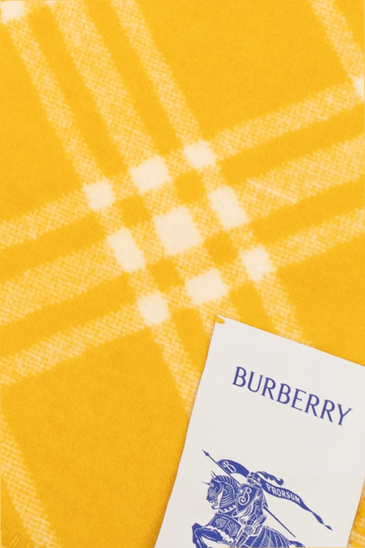 Yellow and white scarf with a hood from Burberry. Made of wool, this item showcases a logo patch, the brand's signature check pattern and distinctive stitching.