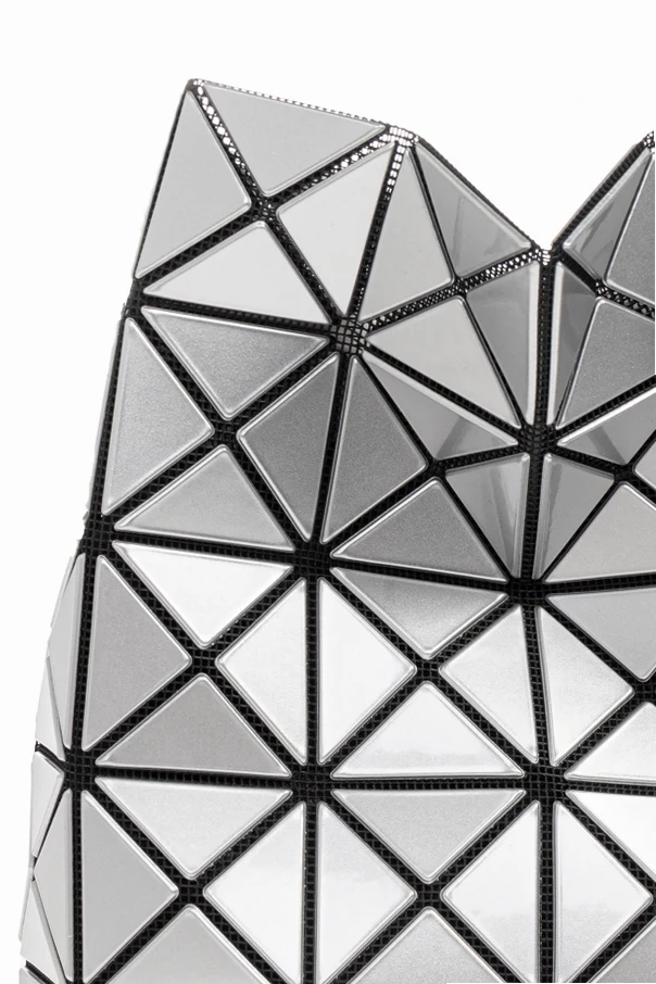 Die gesamte Oberfläche ist mit einem einzigartigen Mosaikmuster aus dreieckigen Paneelen geschmückt, die durch schwarze Linien voneinander getrennt sind. Das verleiht ihr einen futuristischen Look und spiegelt den charakteristischen Stil dieser Luxusmarke wider. Die glänzende Polyvinyl-Struktur, die an einen silbernen Spiegel erinnert, macht die Tasche zu einem unvergleichlichen Schmuckstück für jedes Outfit.