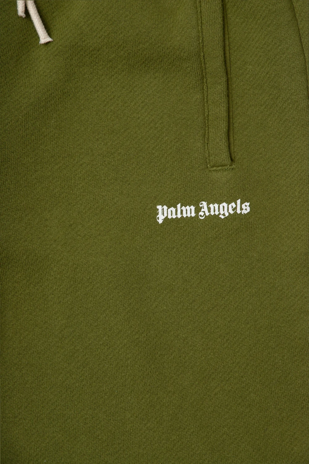 Green shorts from Palm Angels Kids. Made of cotton, this pair features a drawstring waistband, three slip pockets and a white logo print.