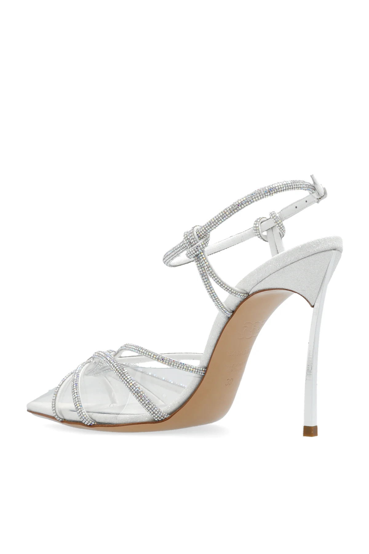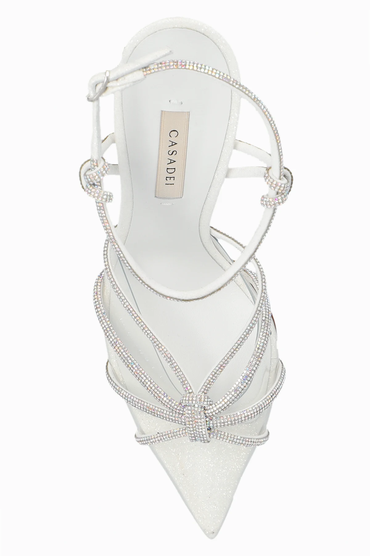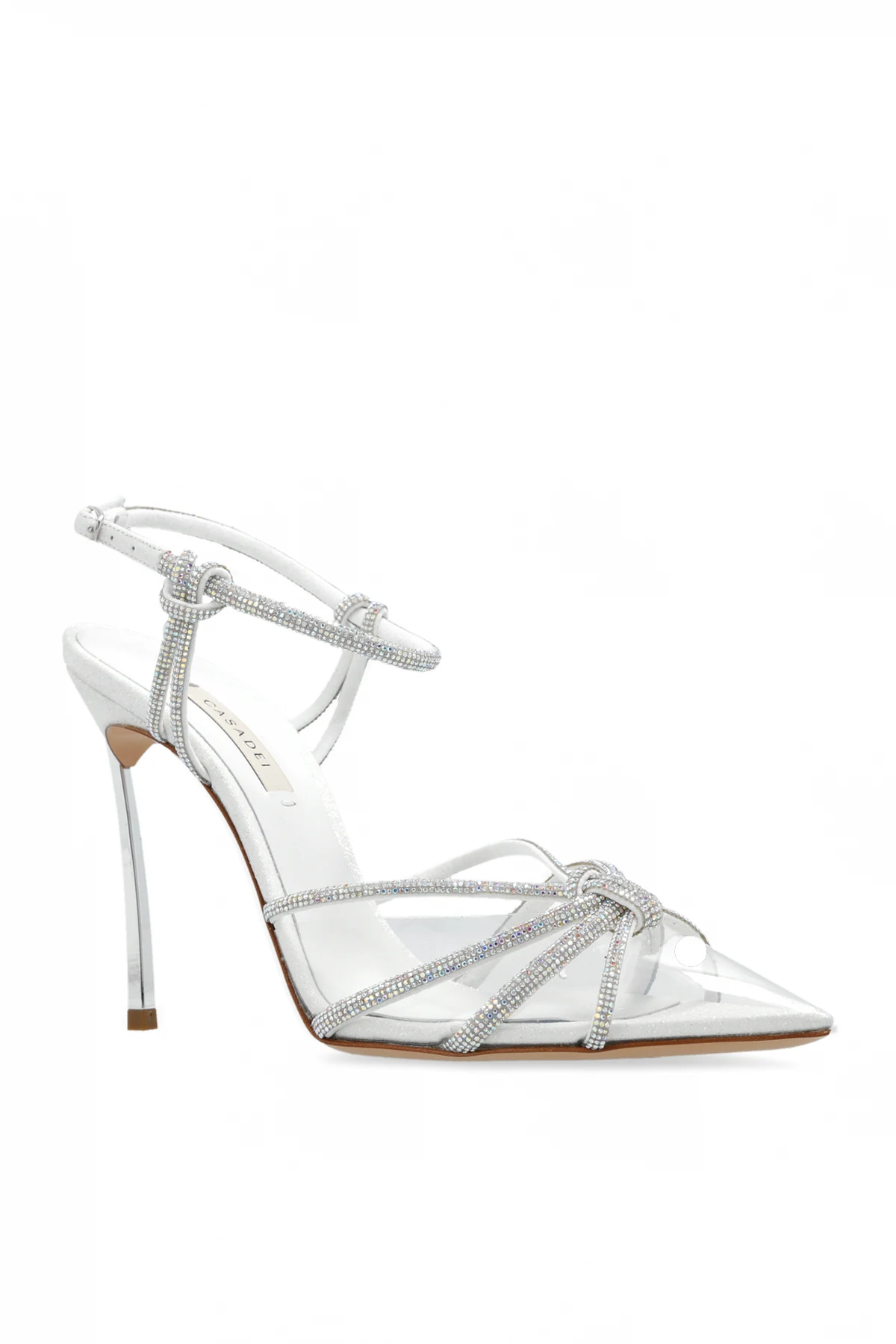 White and silver-tone ‘Blade C+C’ pumps from Casadei. Made from vinyl and glittery straps covered with sparkling rhinestones, this model sits on a beige leather sole and features an adjustable ankle strap with a buckle, a pointed toe and the brand's signature heel made from silver-tone stainless steel.