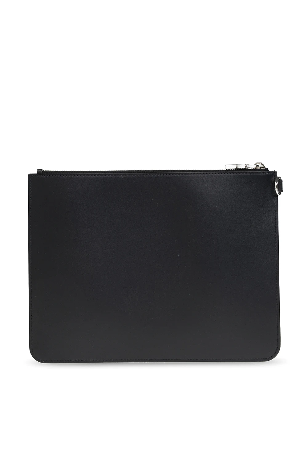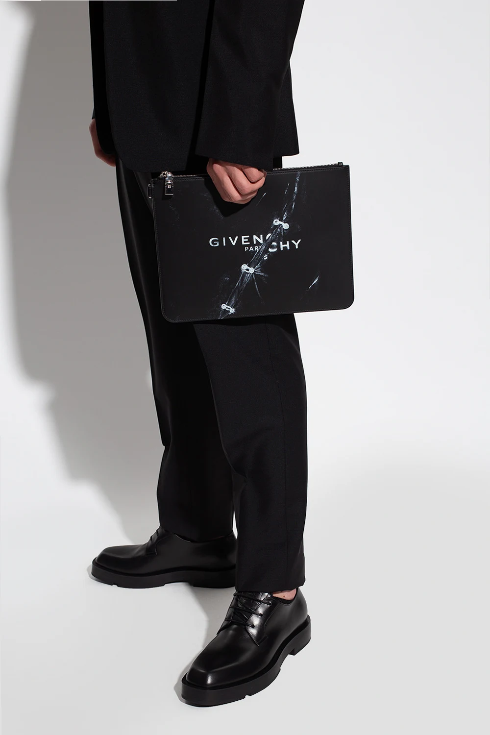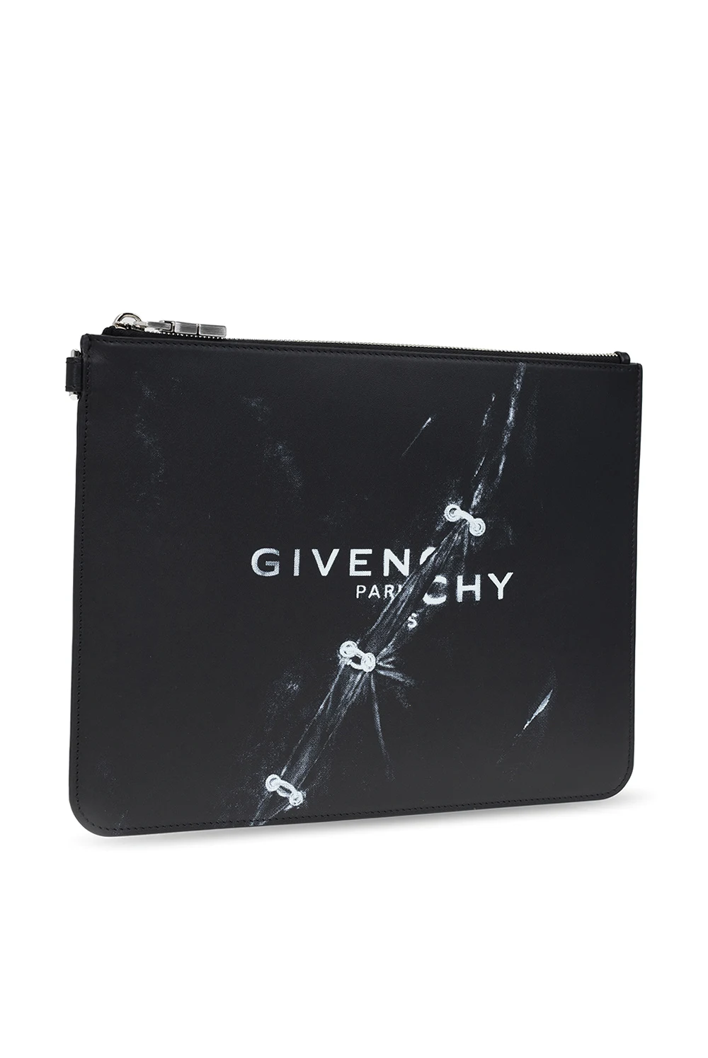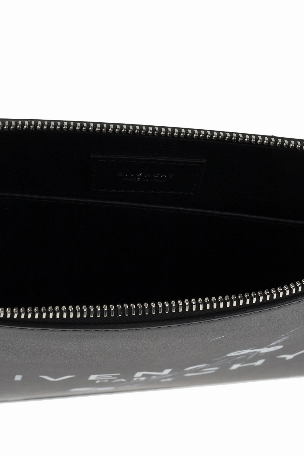 Black clutch from Givenchy. Printed with the brand's logo, this leather-crafted design features a zip fastening and one internal compartment with a slip pocket.