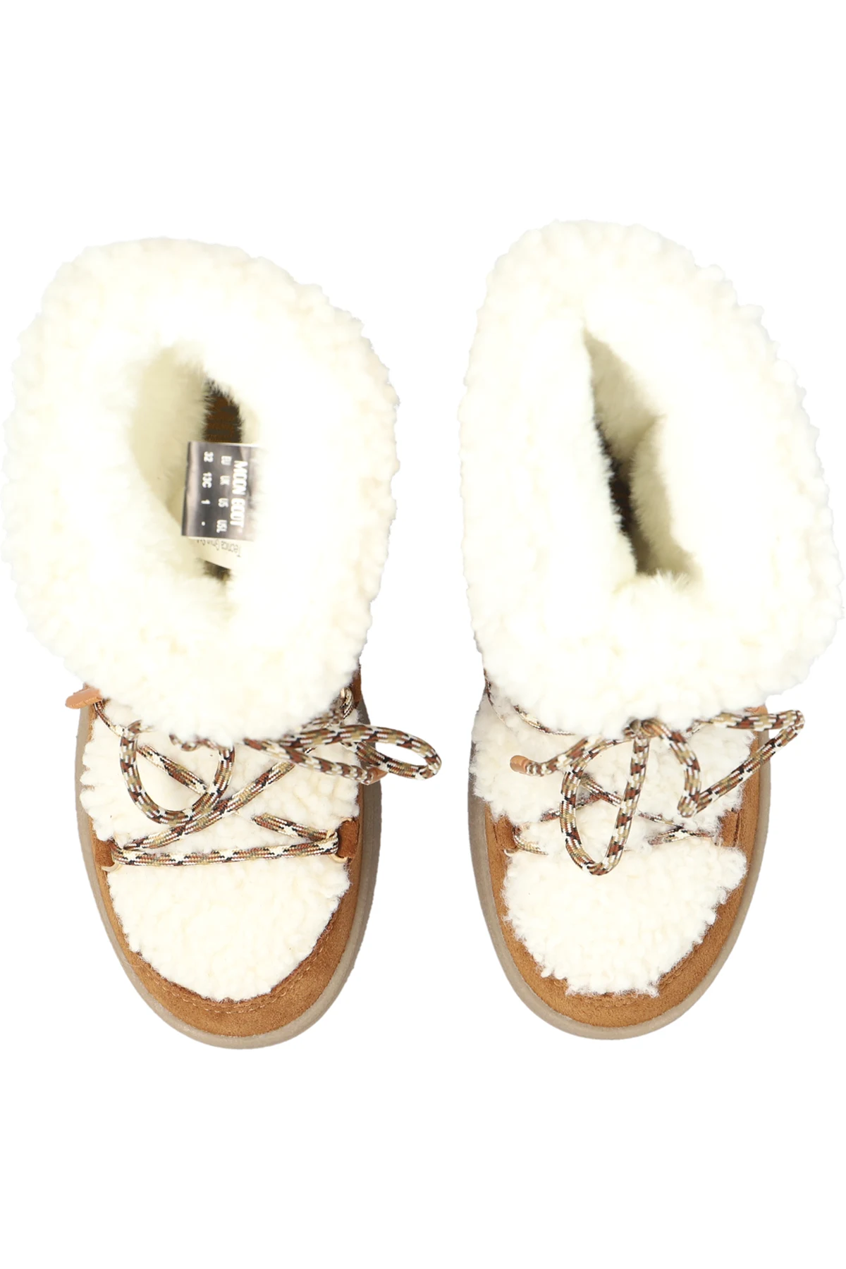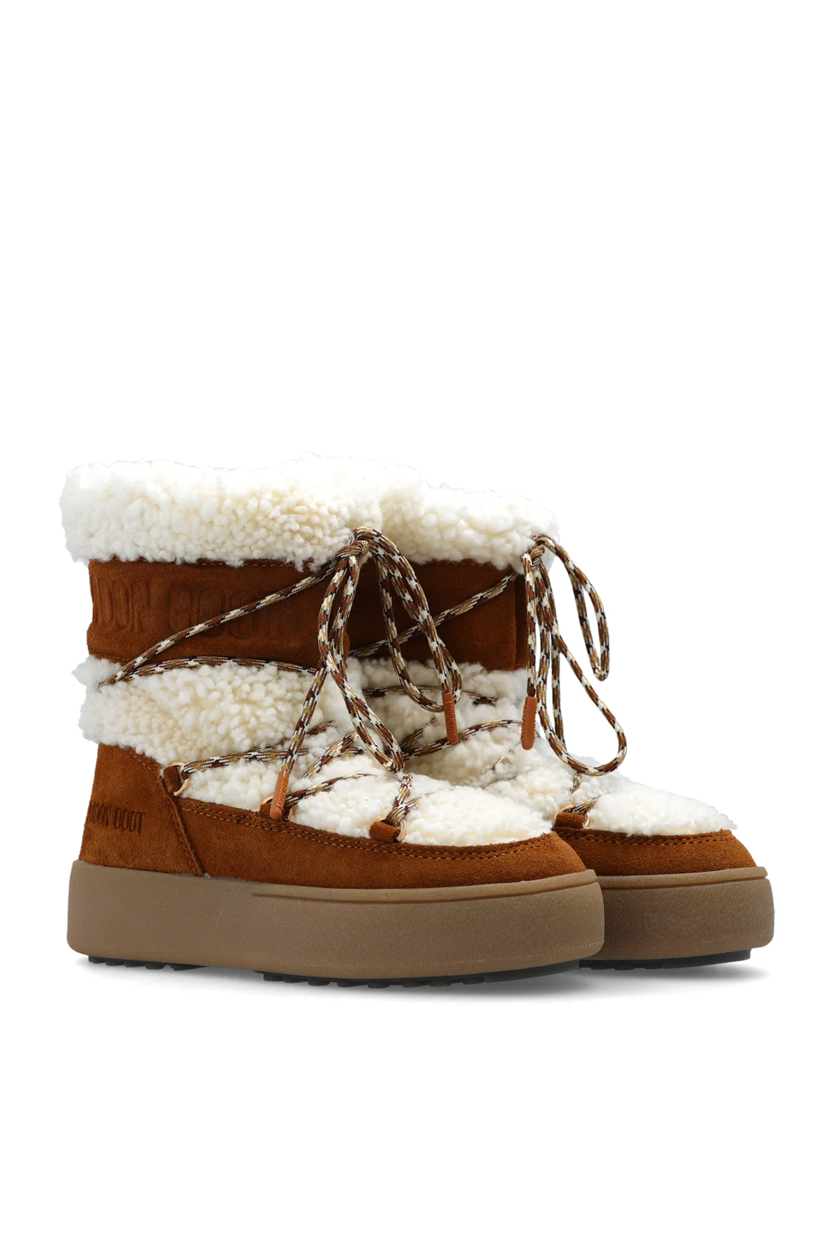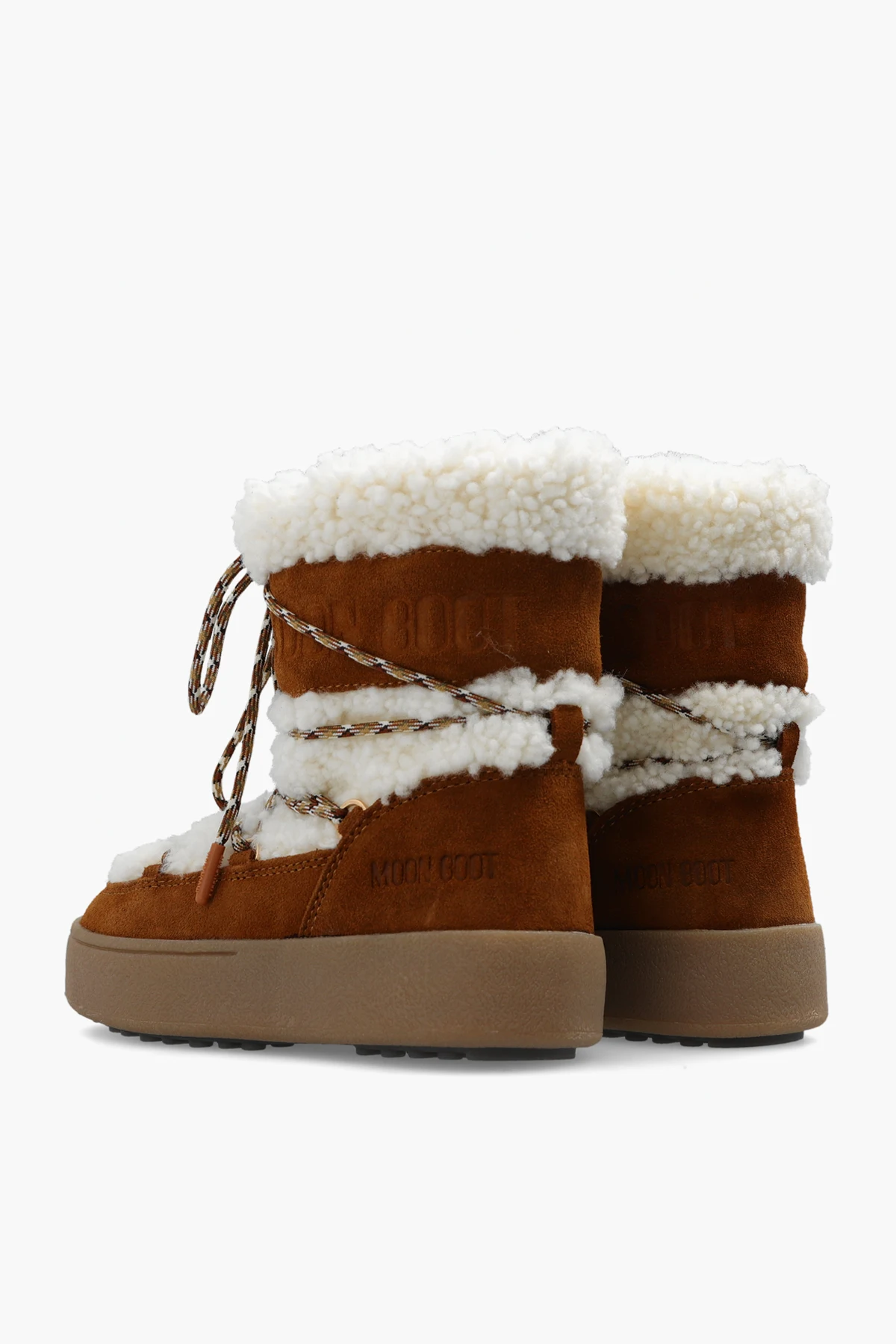 Brown ‘Jtrack Shearling’ snow boots from Moon Boot Kids. Made of suede and trimmed with cream sheep fur, this lace-up model sits on a brown and grey tread rubber sole for traction on all terrains and features an embossed logo.
