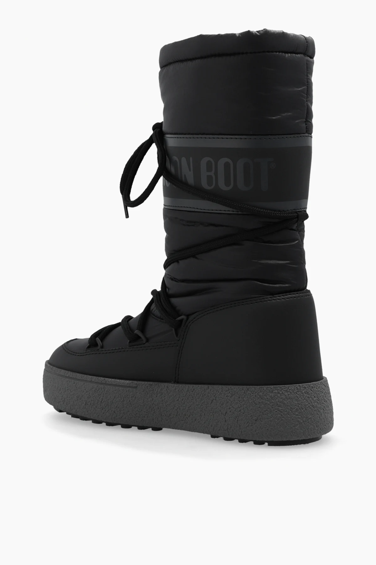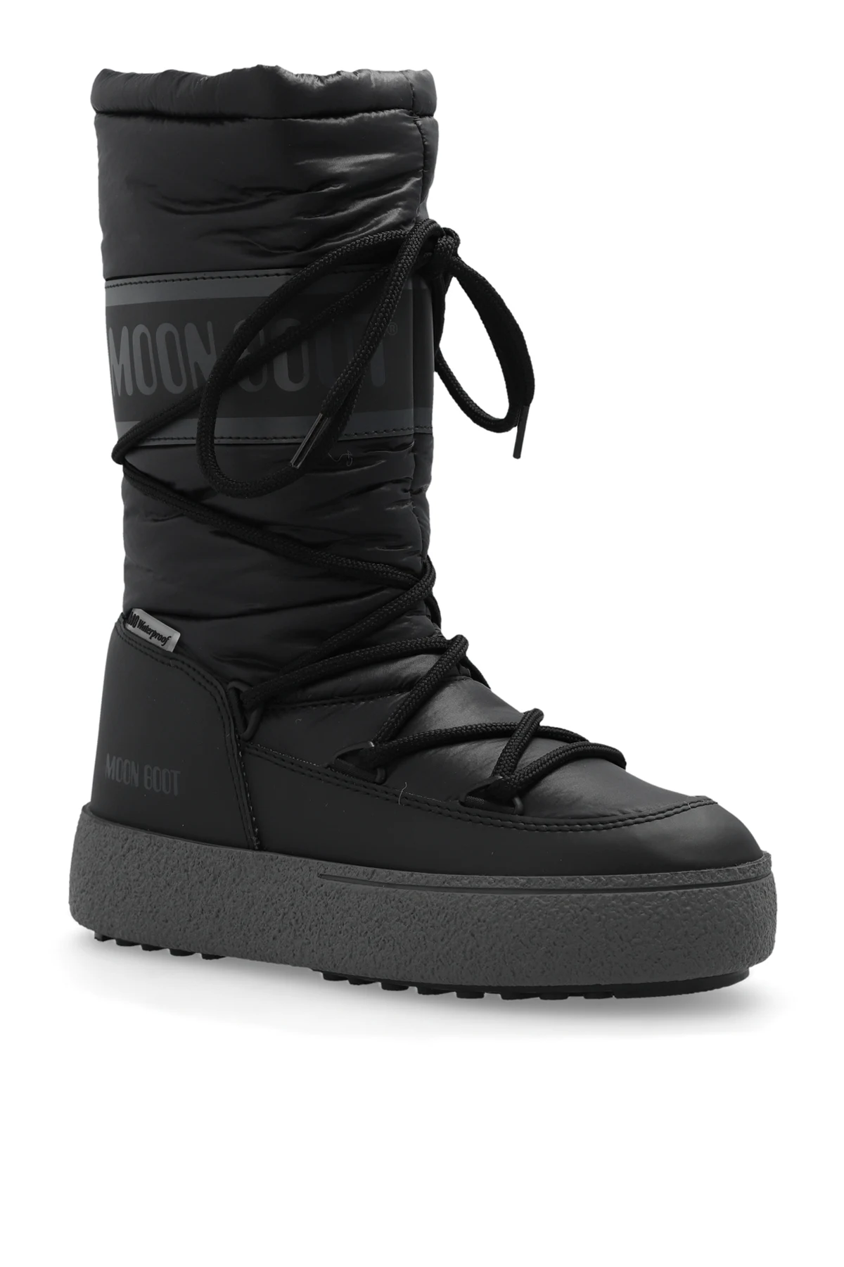 Black ‘Ltrack High’ snow boots from Moon Boot. Made of waterproof material, this lace-up model sits on a dark grey and black thermoplastic rubber tread sole and showcases a drawstring upper with the brand's logo.