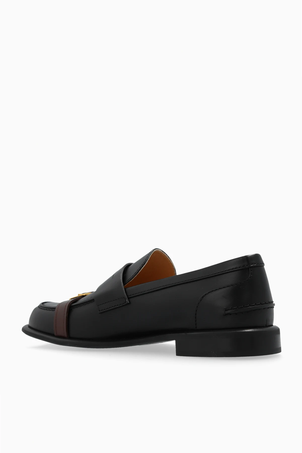 Black loafers from JW Anderson. Made of leather, this pair sits on a black rubber sole and features a strap with a cut-out, a brown strap with a metal logo-engraved buckle in gold-tone.