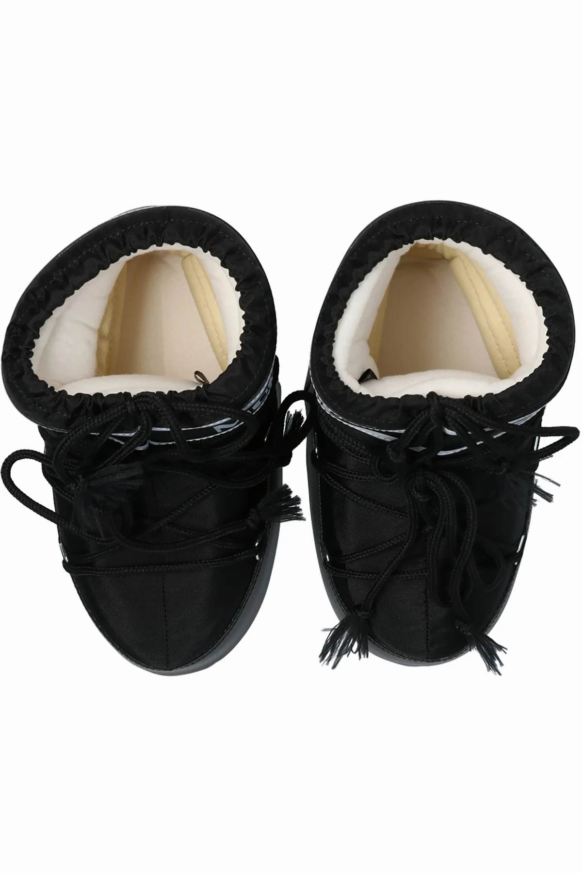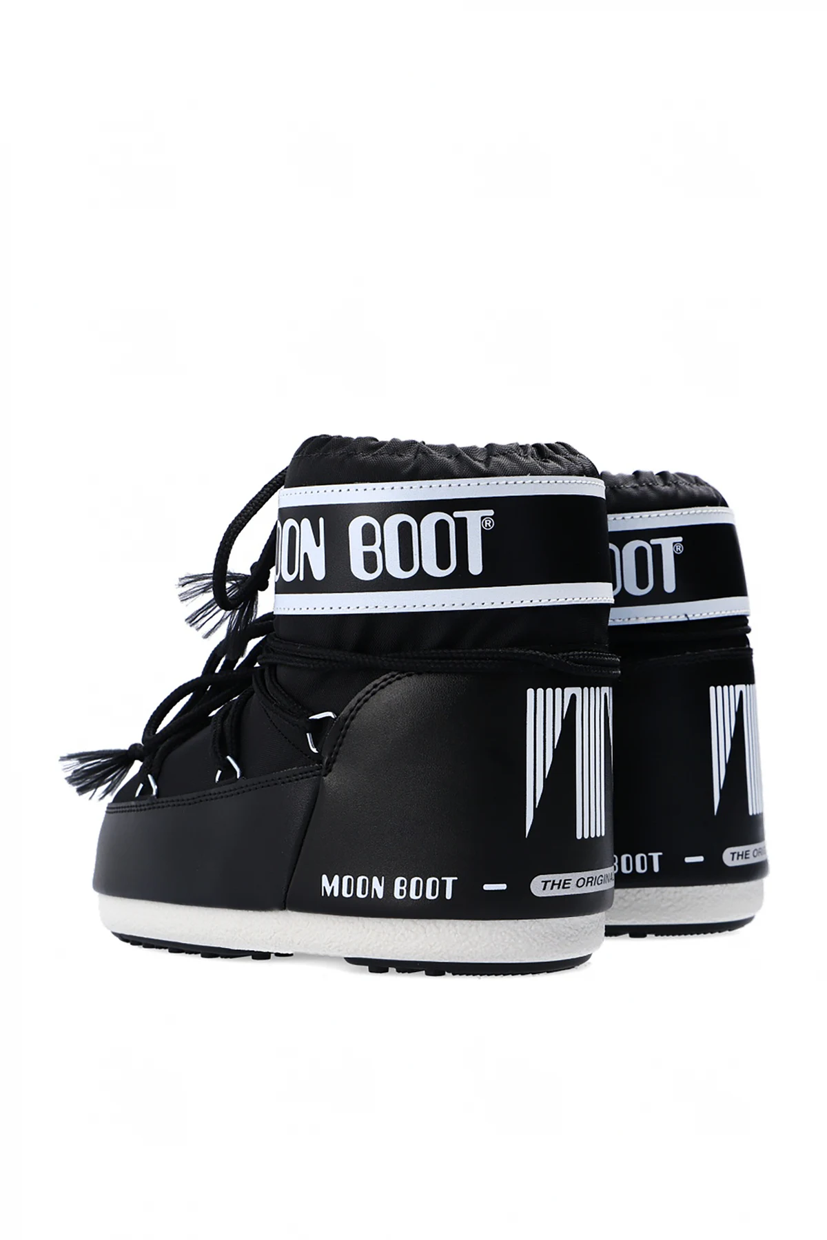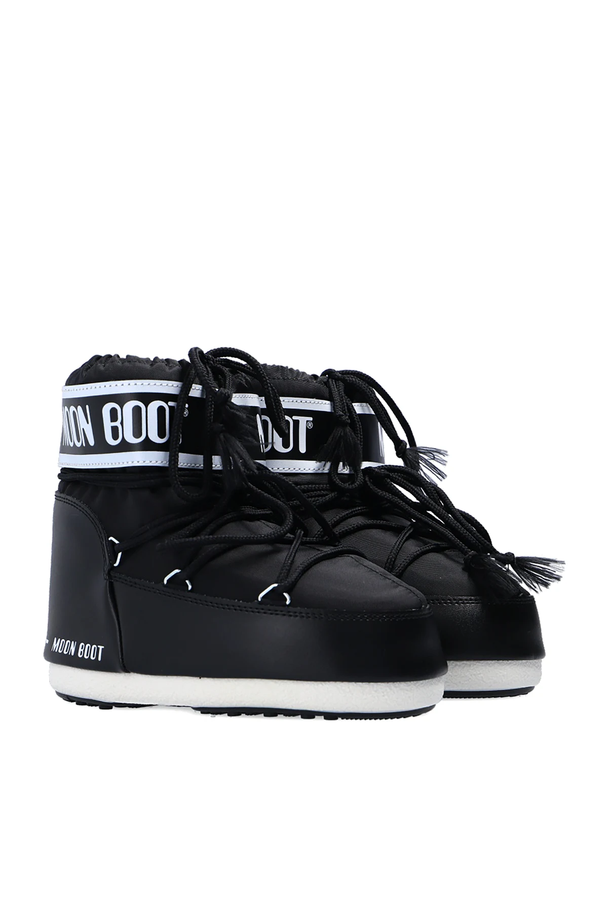 Black and white ‘Classic Low’ snow boots from Moon Boot Kids. Offering waterproof upper, this pair sits on a black and white rubber sole and showcases lace-up closure, cinching drawcords at the cuff and printed white logo for the brand recognition.