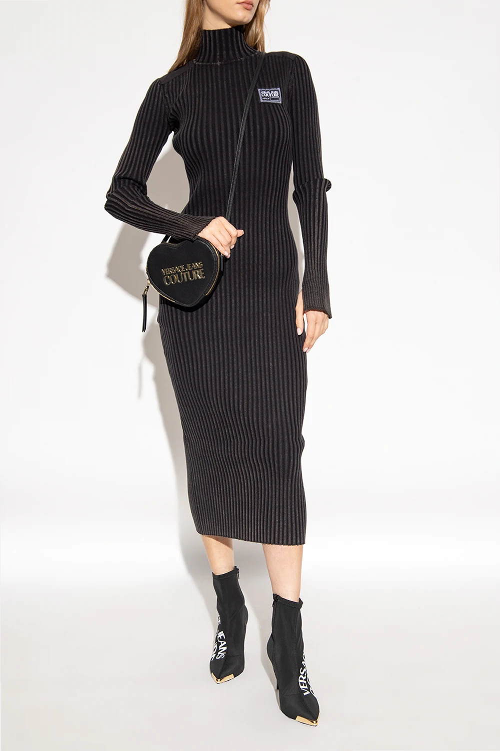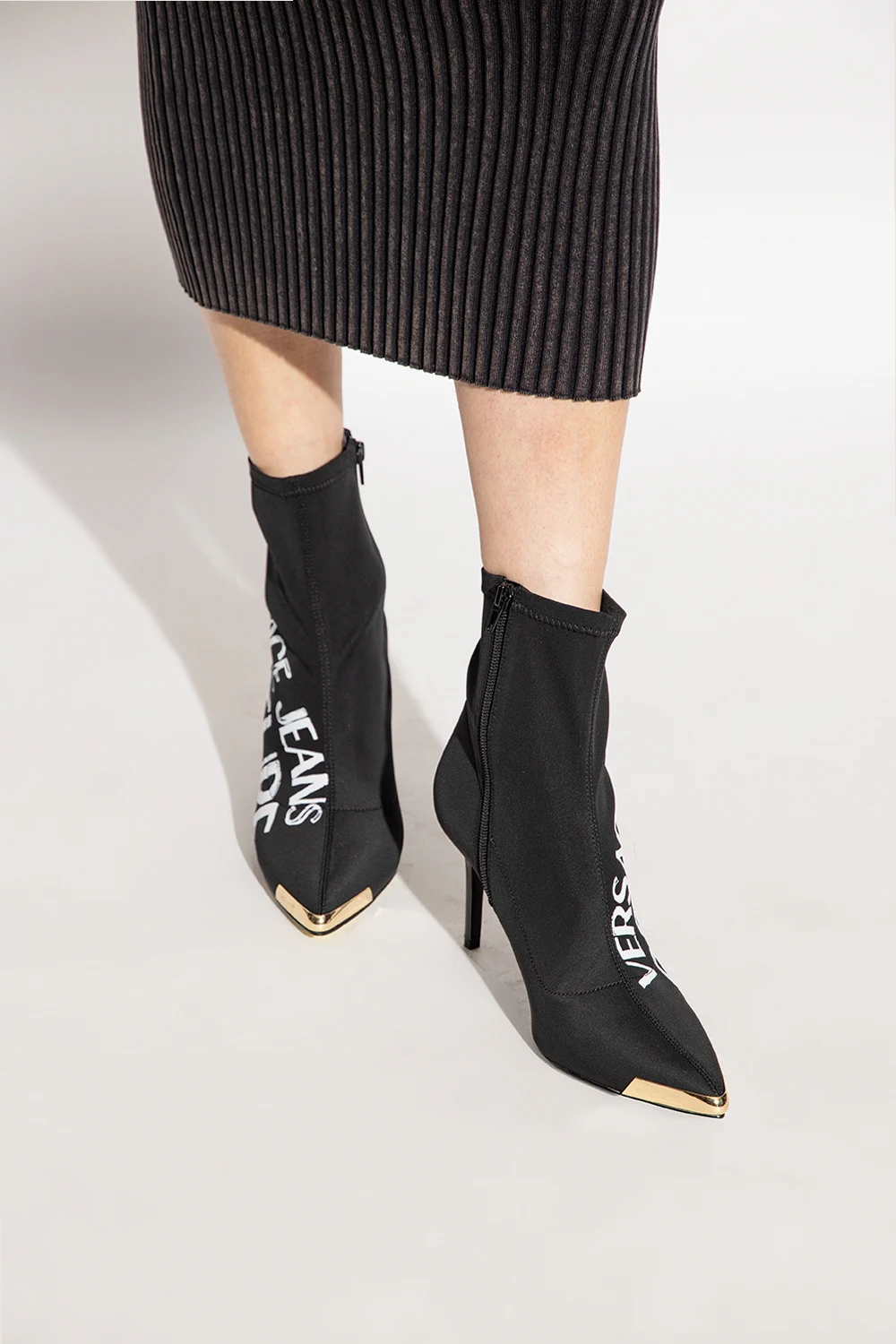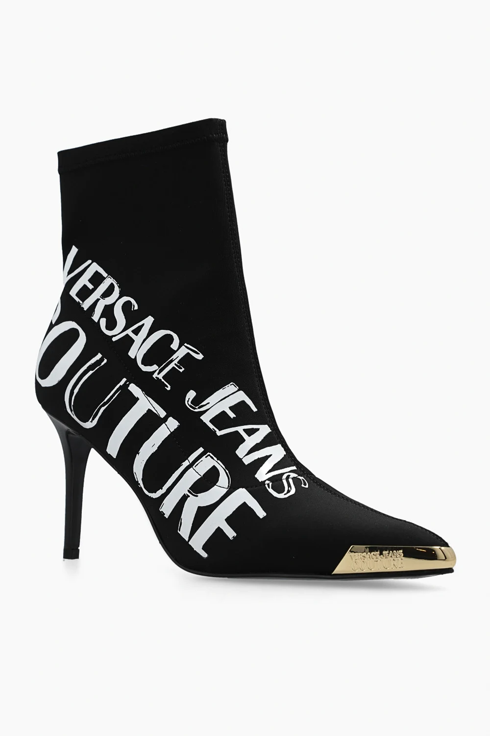 Black ‘Scarlett’ heeled ankle boots from Versace Jeans Couture. Printed with the brand's logo in white, this model features a pointed toe silhouette, a side zipper and gold-tone hardware with the brand's logo on the front.