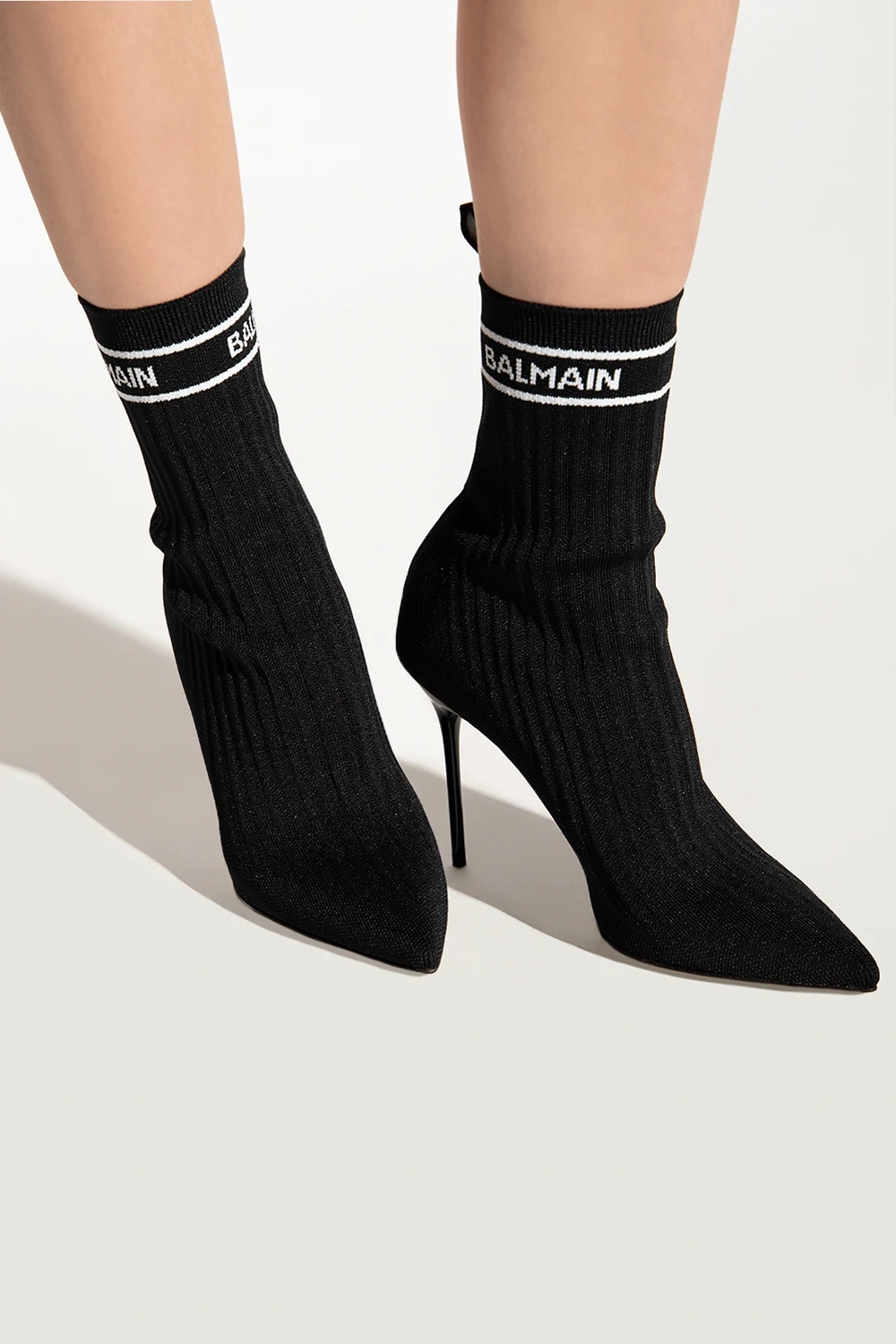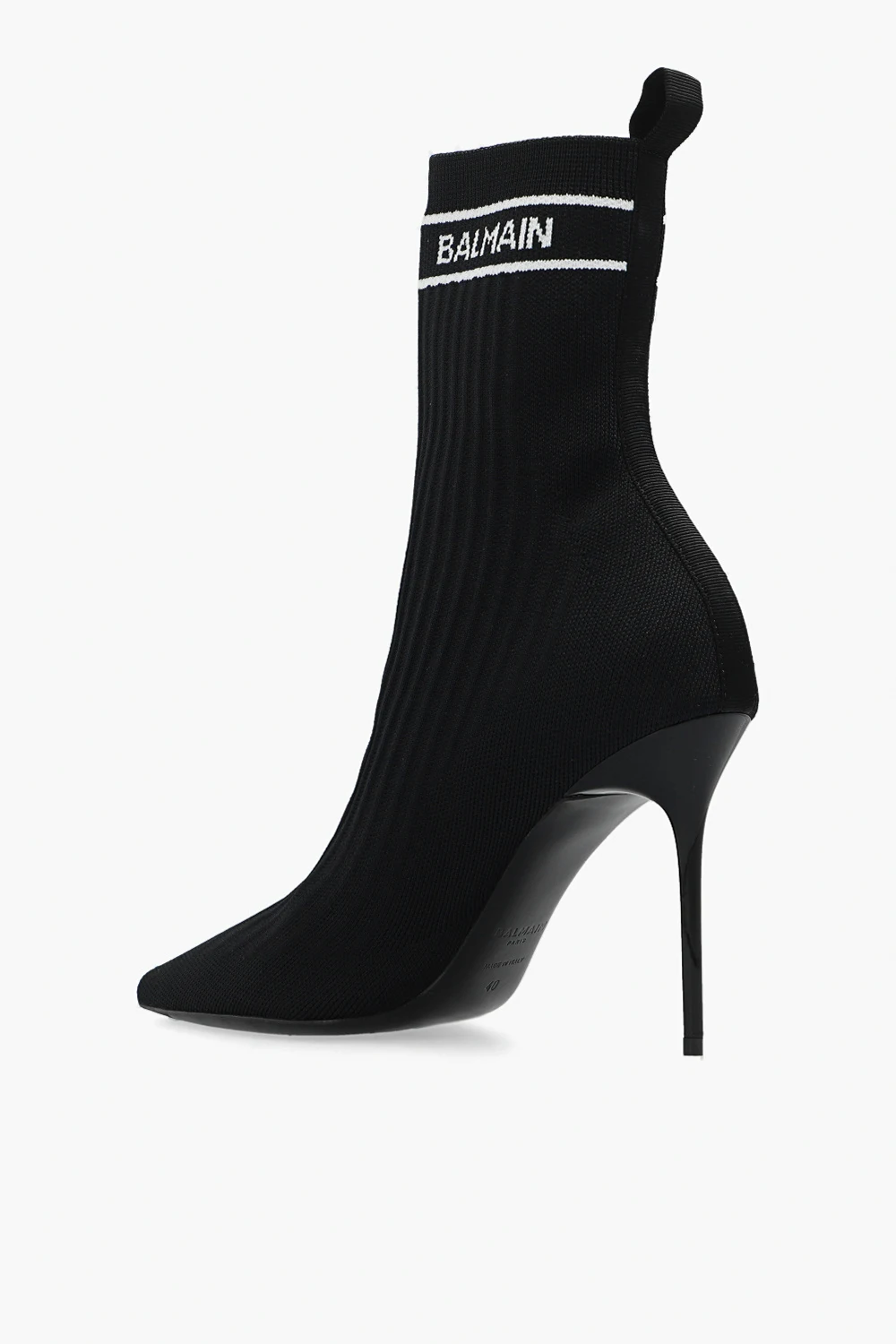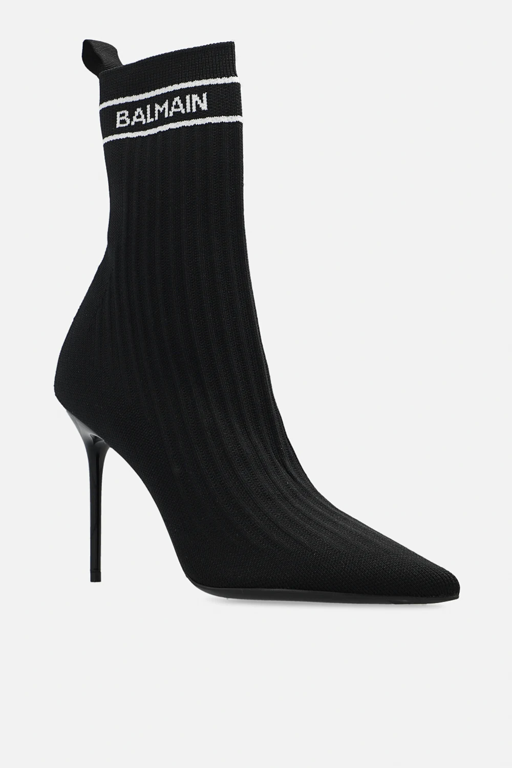 Black ‘Skye’ heeled ankle boots from Balmain. Made of ribbed, stretchy fabric, this slip-on pair features a white logo embroidery, grosgrain strap at the back, pointed toe and black leather sole with rubber elements for increased stability.