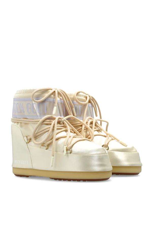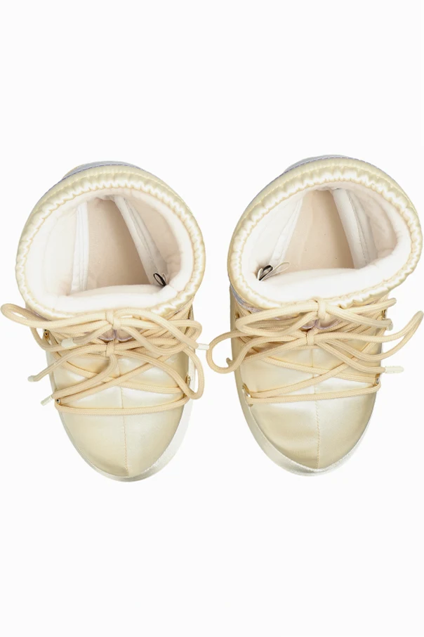 Der satinierte, glänzende Stoff in Gold strahlt Luxus und subtile Eleganz aus. Der obere Teil des Schafts wird von einem breiten Band mit einem markanten Schriftzug geziert, das zugleich das Markenzeichen ist. Das präzise Schnürsystem erlaubt eine perfekte Anpassung des Schuhs, während das warme, weiche Innenfutter und die wasserdichten Materialien auch an den kältesten Tagen Wärme und Schutz bieten.