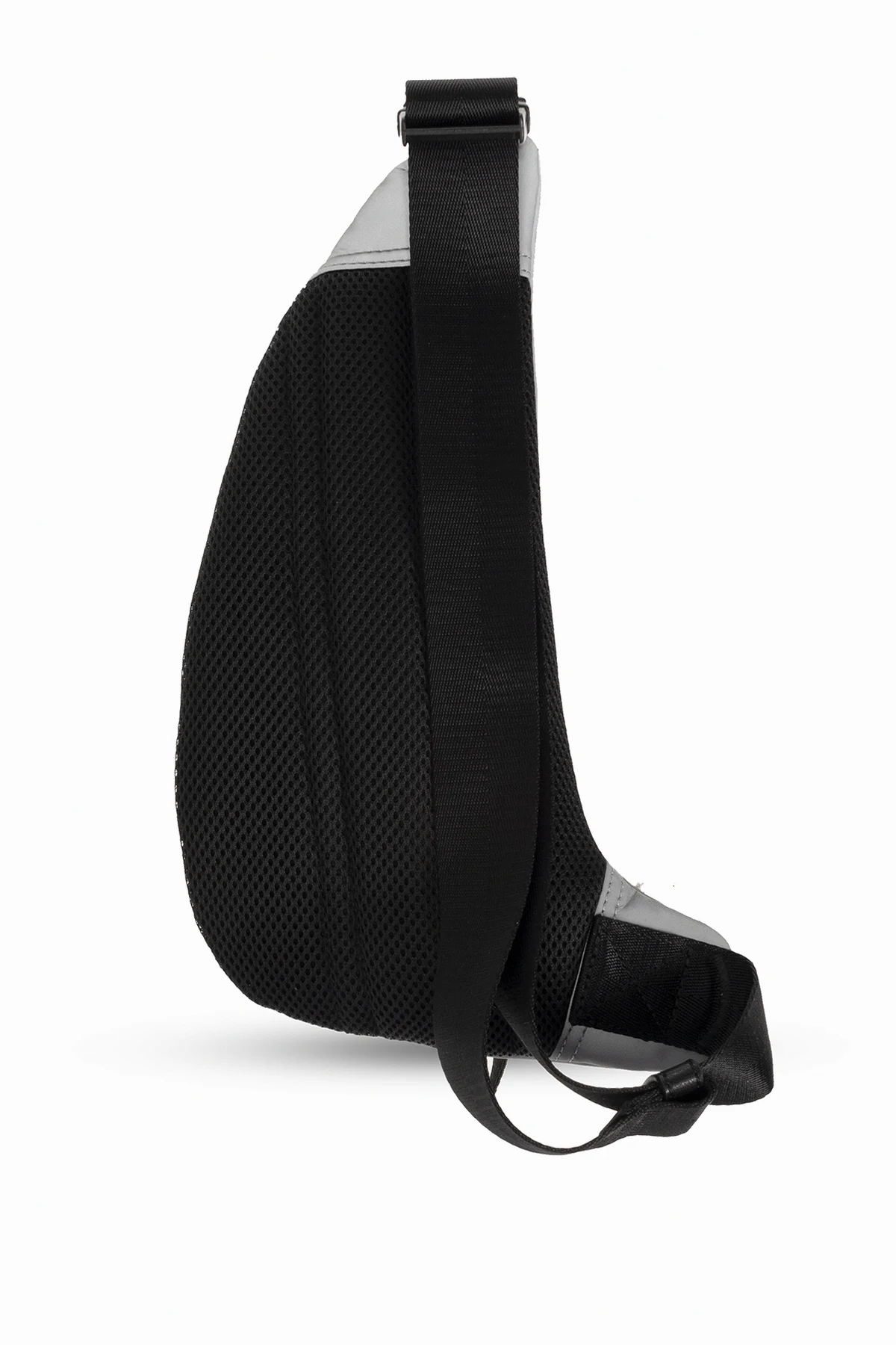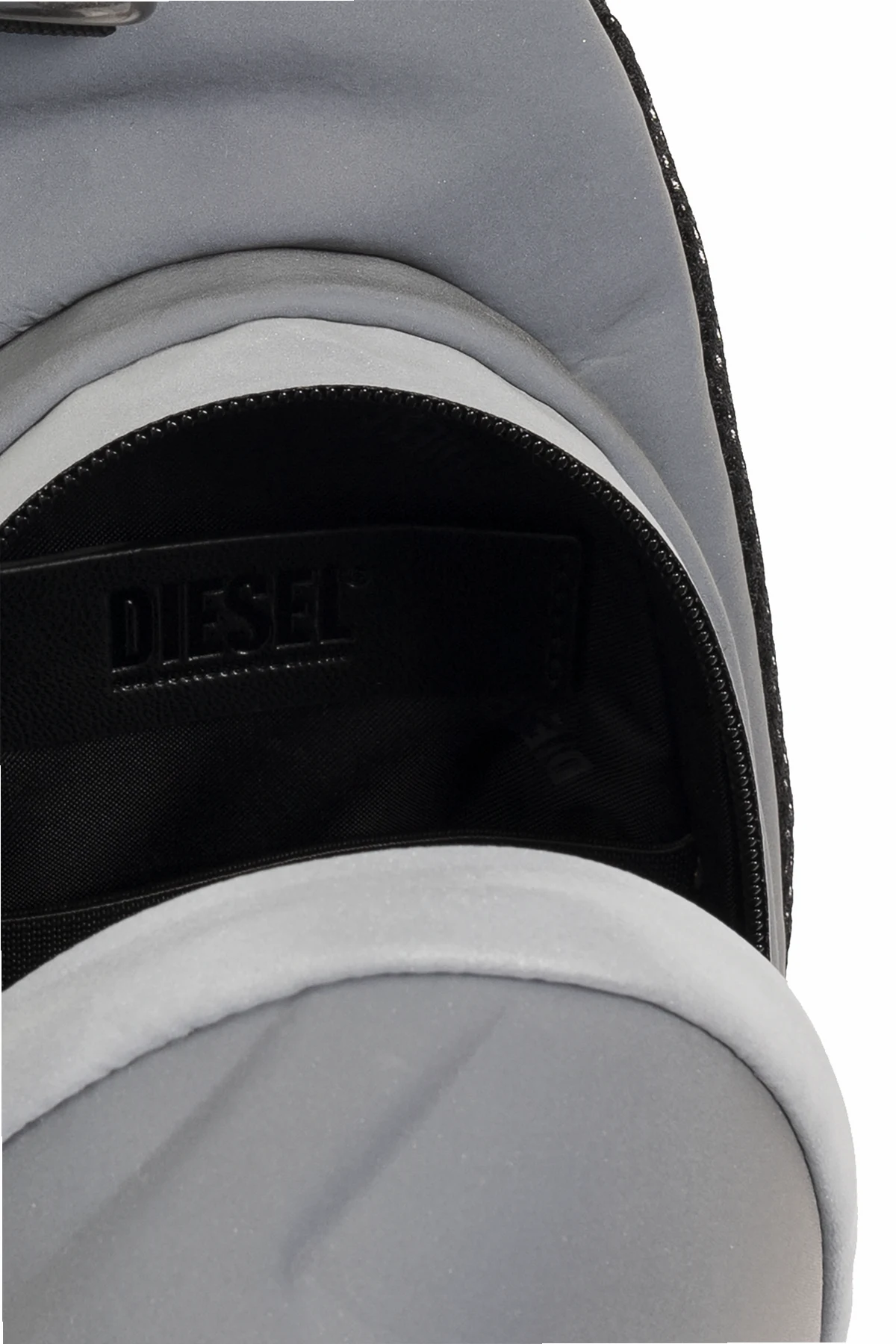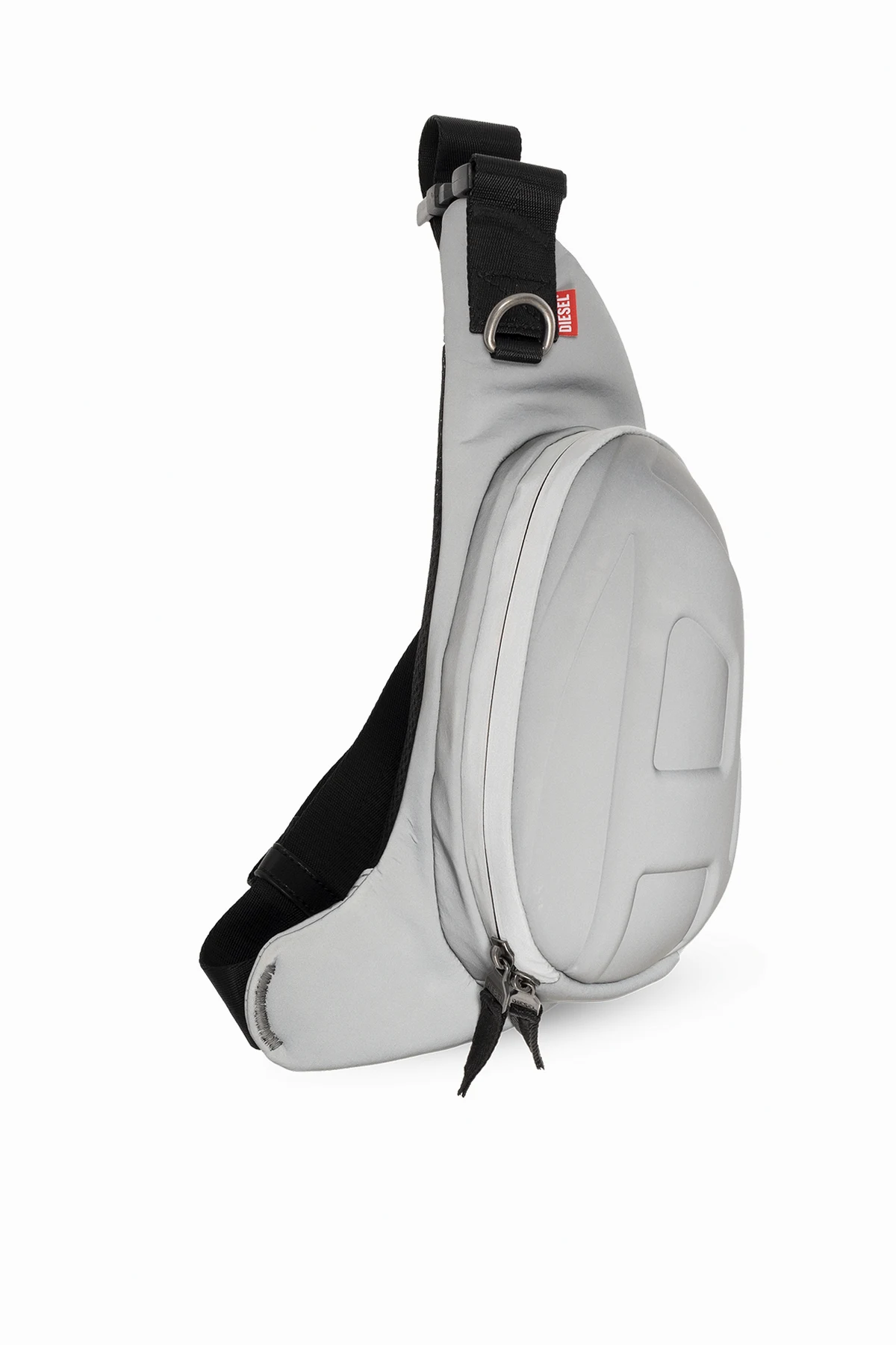 Reflektierende Gürteltasche in Silber, Modell '1DR-POD' von Diesel. Mit einem zweipoligen Reißverschluss. Vorne ein erhabenes Logo. Hinten eine Tasche mit Reißverschluss. Innen ein Fach mit zwei Taschen: einer Einschubtasche und einer mit Reißverschluss.