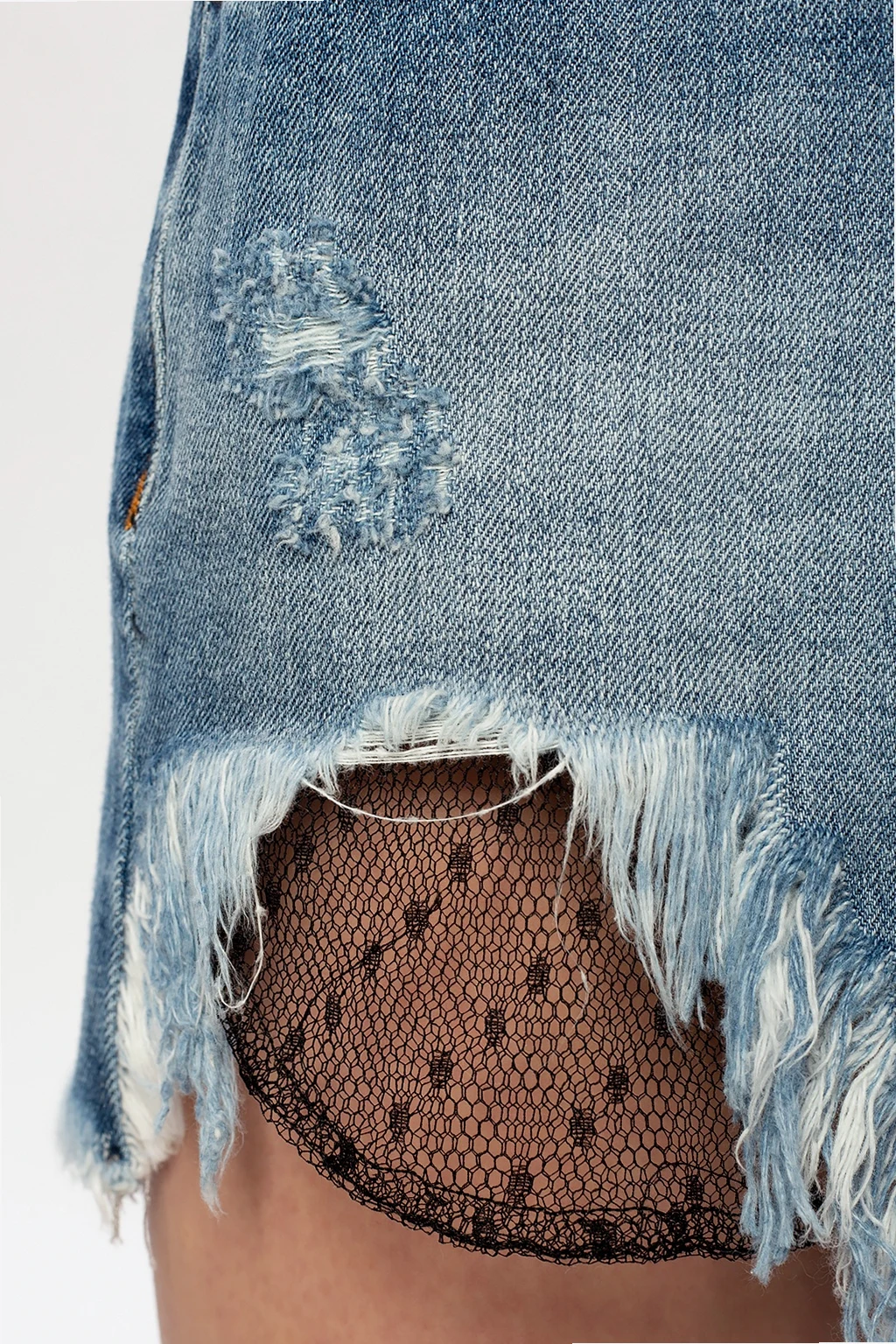 Blue denim shorts with a raw trim from Red Valentino. Zip and button fastening. Decorated with lace inserts in black. 3 slip pockets on the front, 2 at the back.
