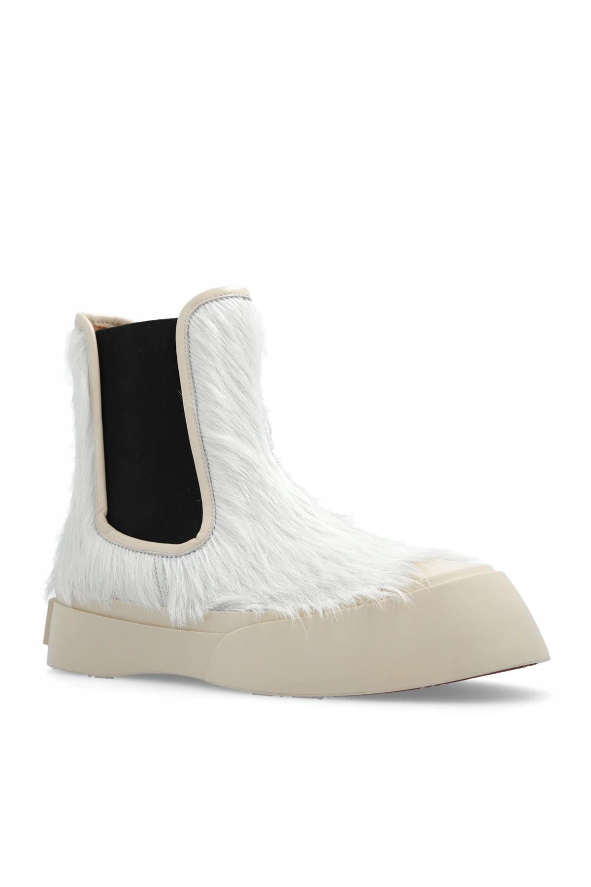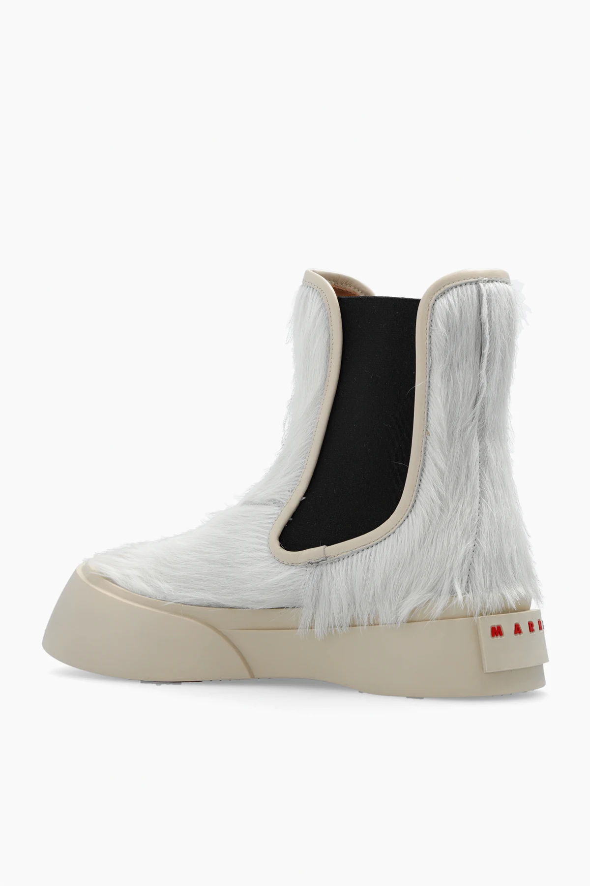 White, greyish beige and black ‘Pablo’ Chelsea boots from Marni. Made from leather with a hair trim, this model sits on a brown rubber sole and features a red logo detail at the back and elastic panels on the sides.