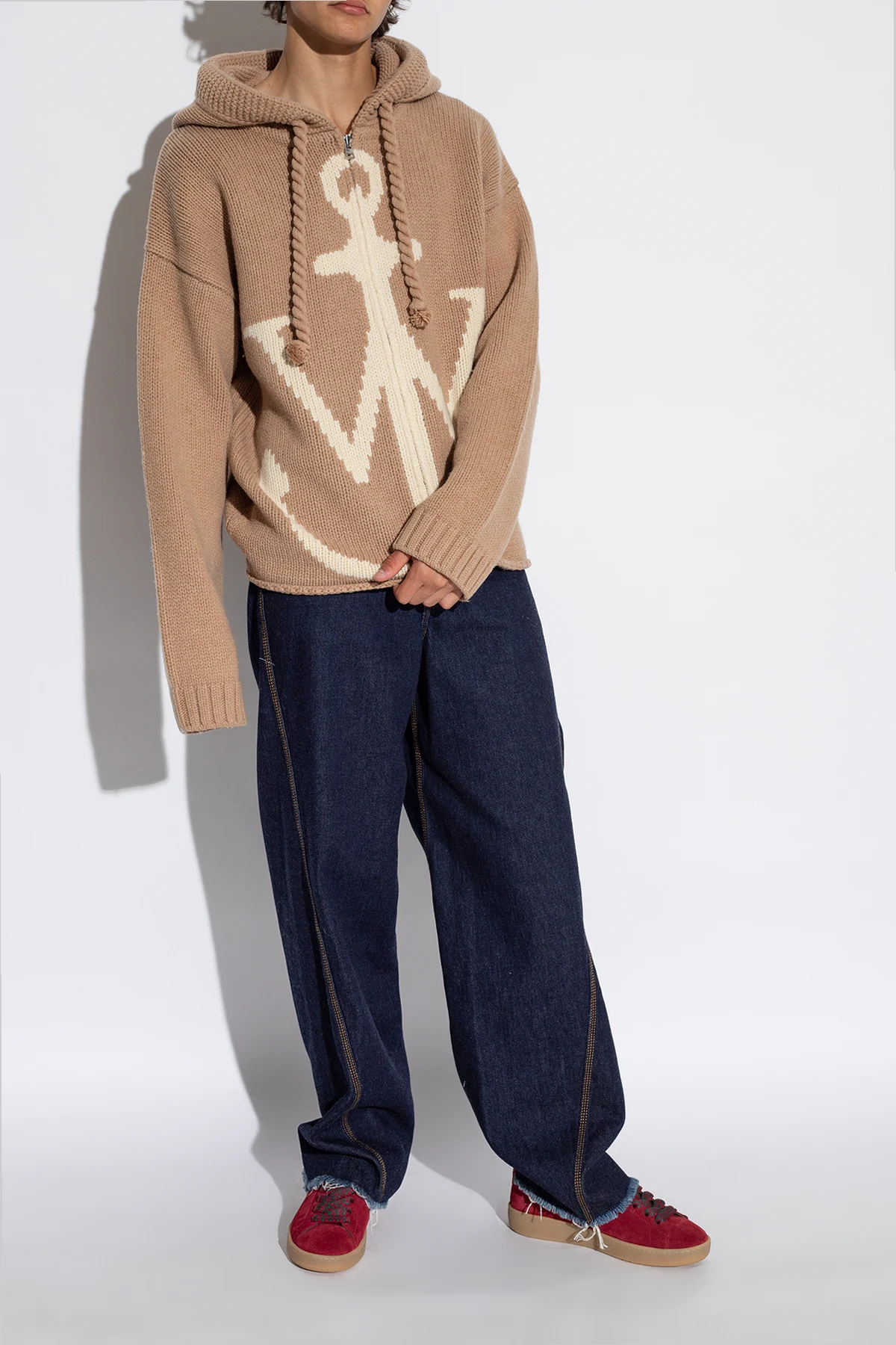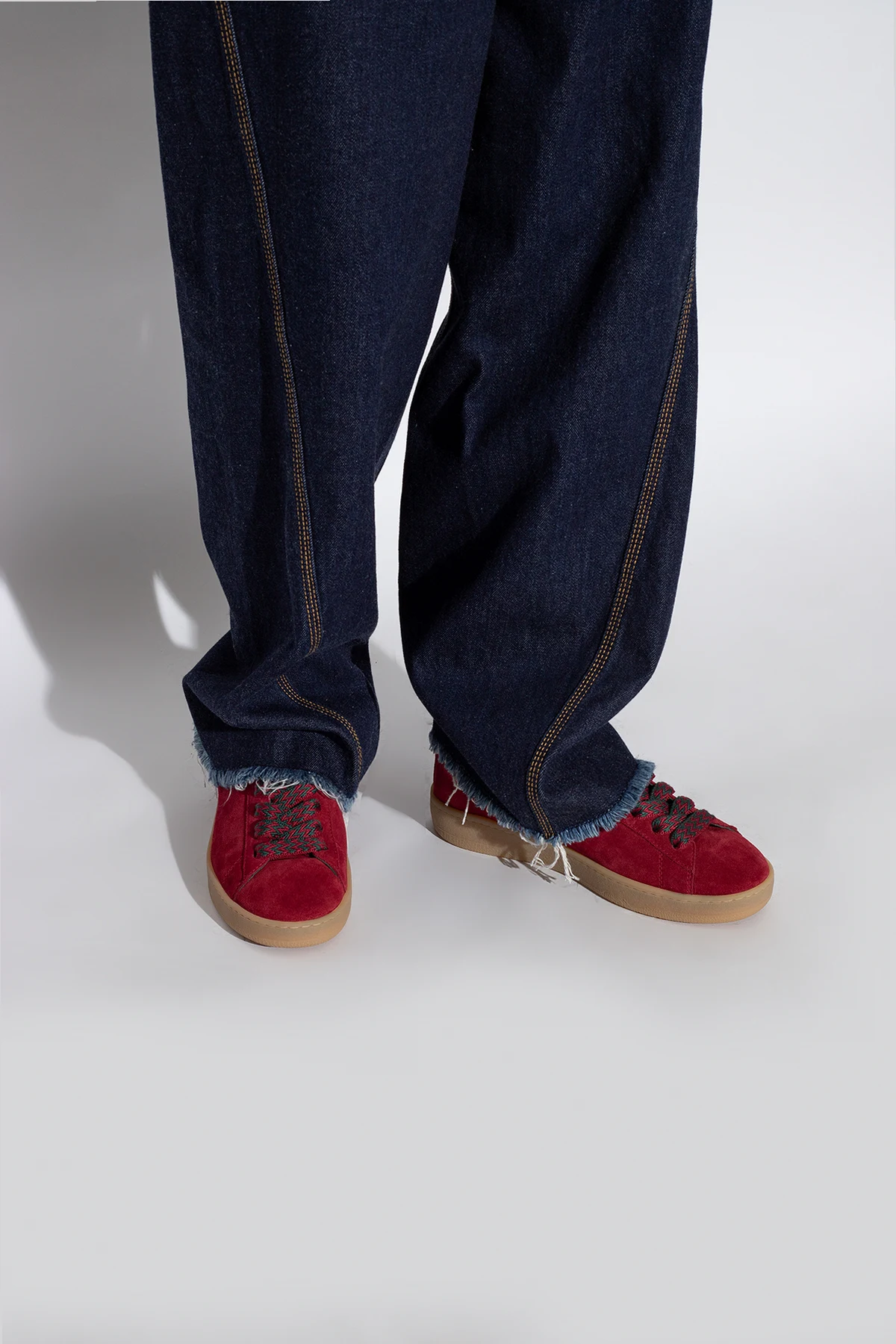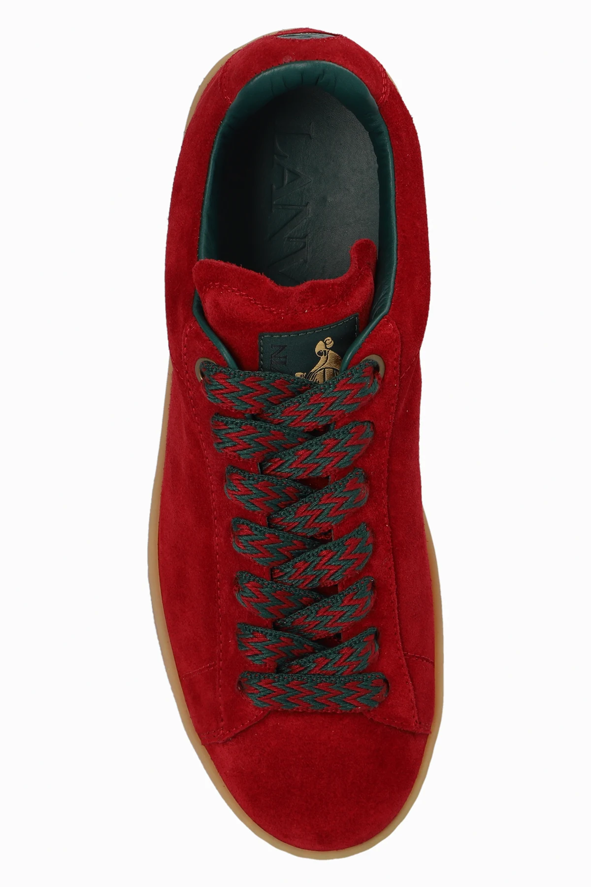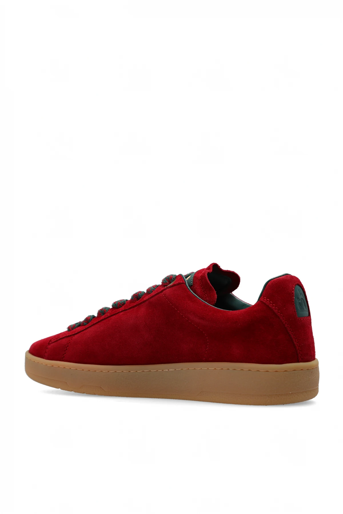 Maroon 'Curb Lite' sneakers from Lanvin. Made of suede, this lace-up model sits on a brown rubber sole and features a logo patch on the front, green and maroon shoelaces and a printed gold-tone logo on the side.