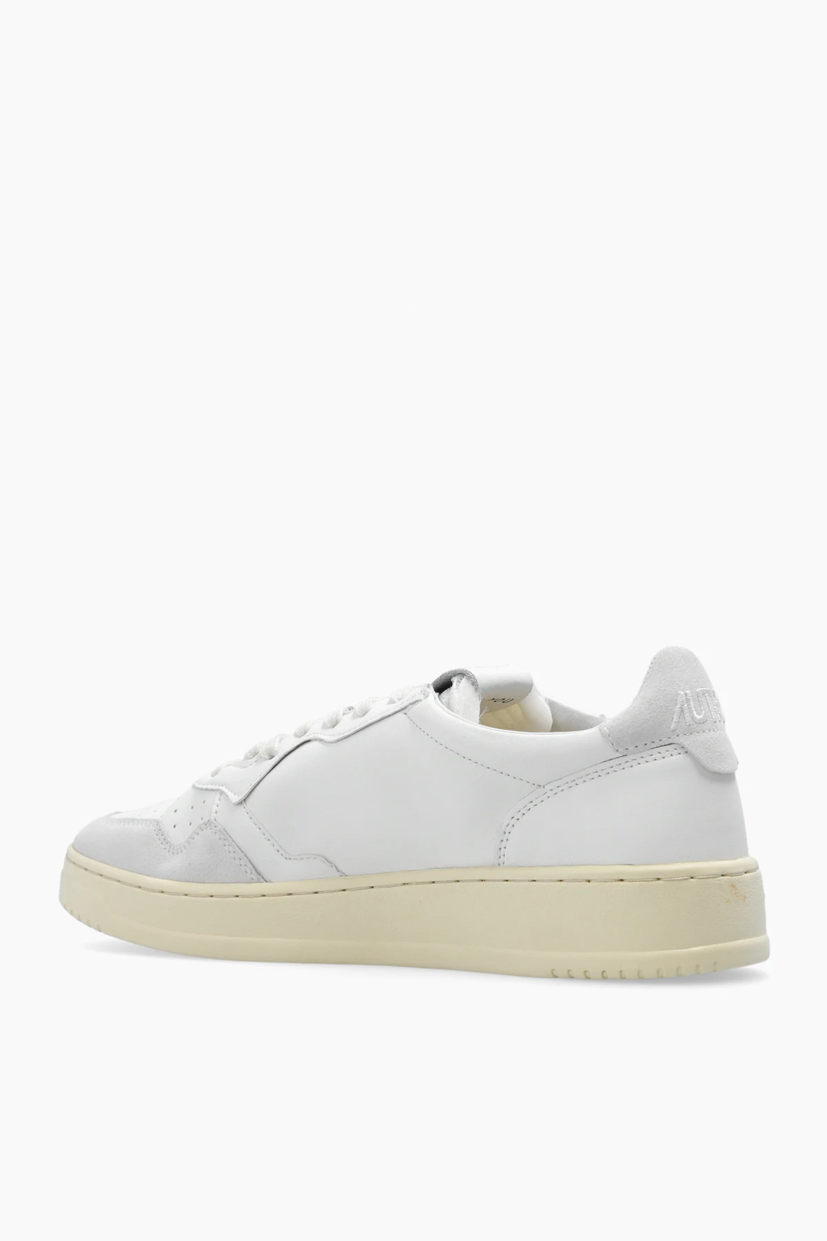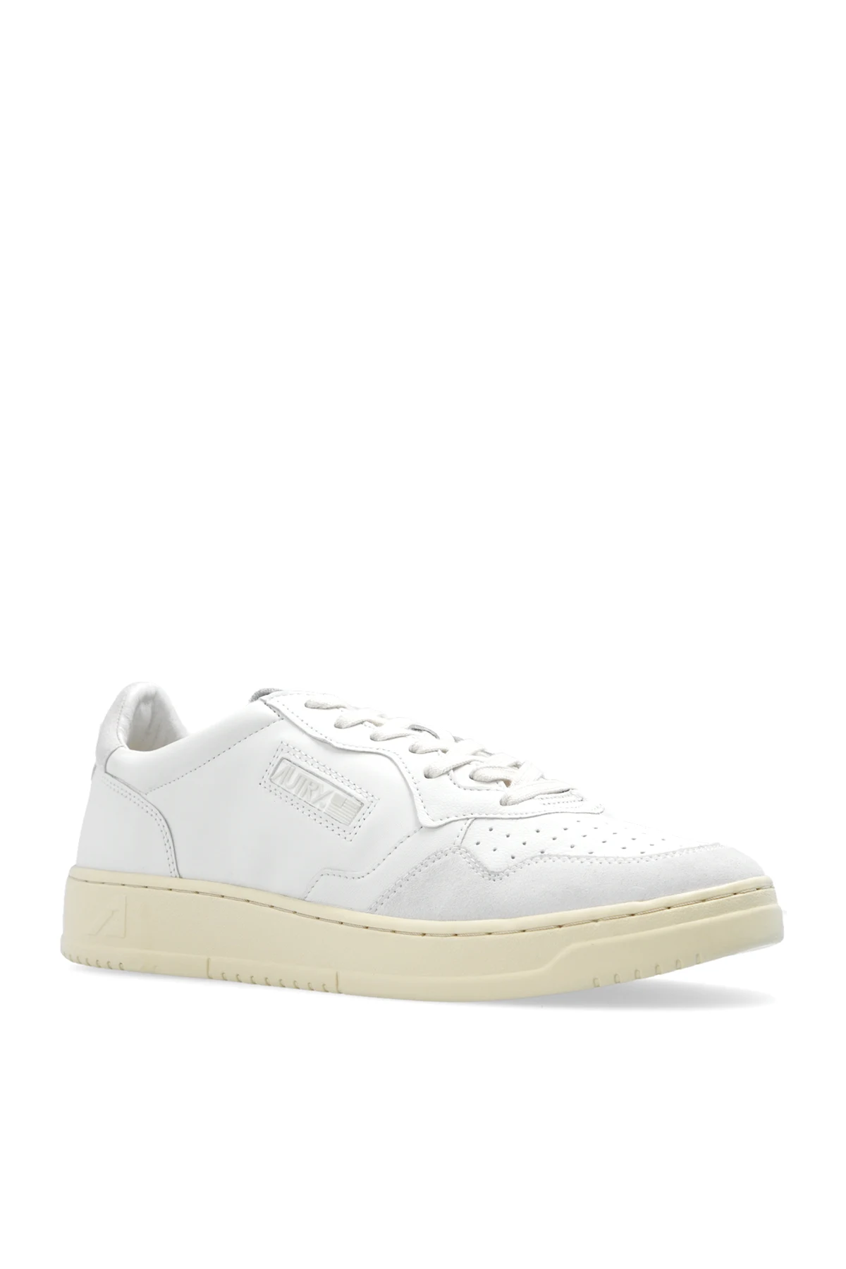 White ‘AOLM’ sneakers from Autry. Crafted from leather and fabric, this lace-up model sits on a cream rubber sole and showcases the brand's logo and perforations on the toe.
