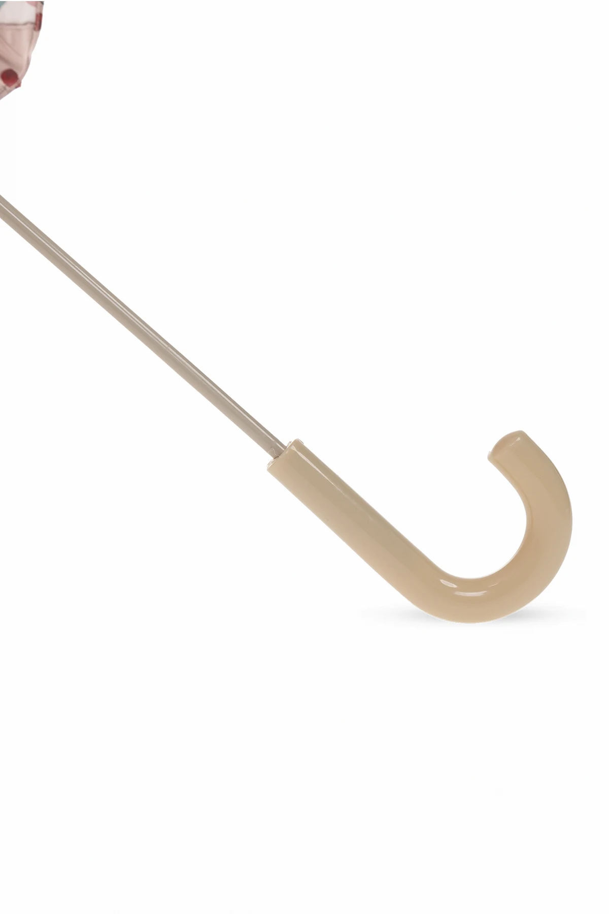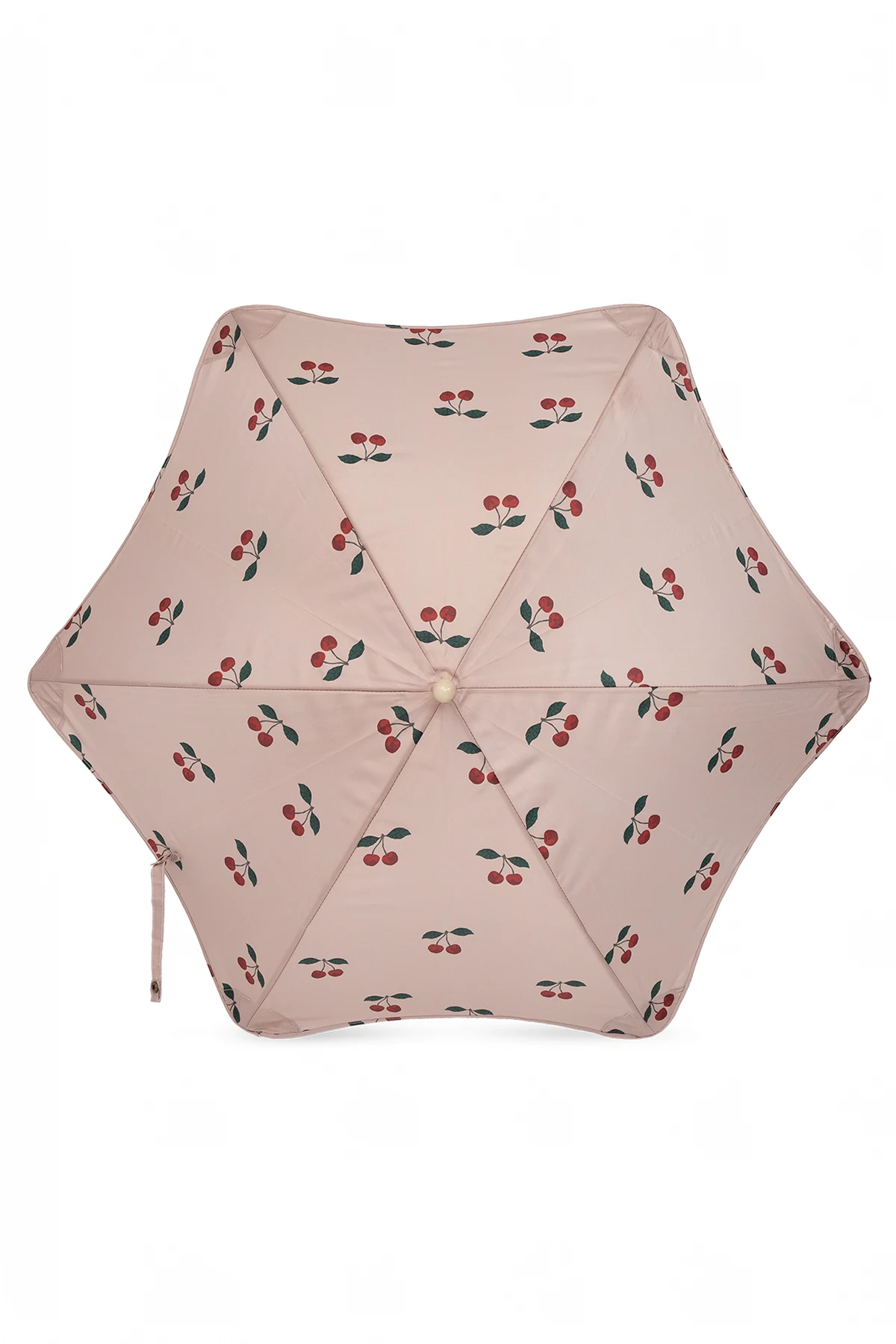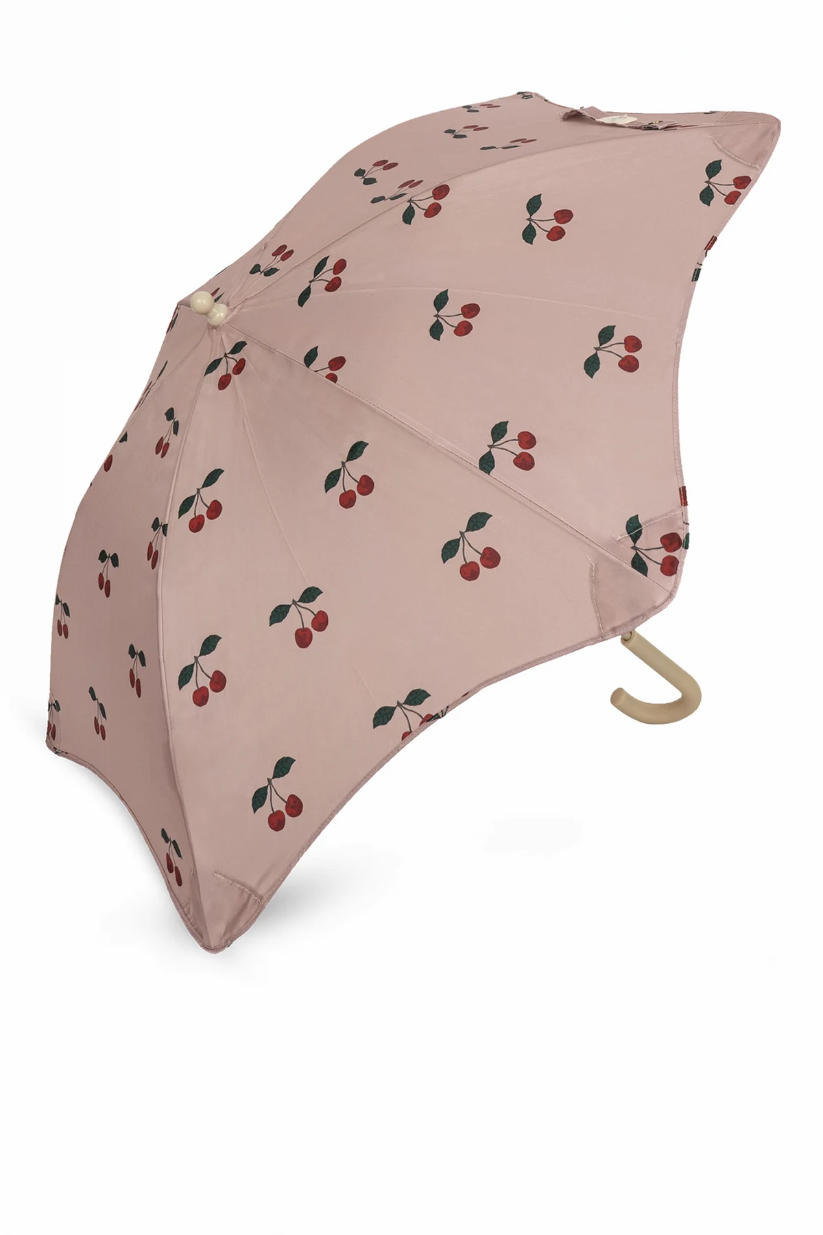 Pink folding umbrella from Konges Slojd. Made from waterproof material, this item secures with a snap and showcases a cherry pattern.