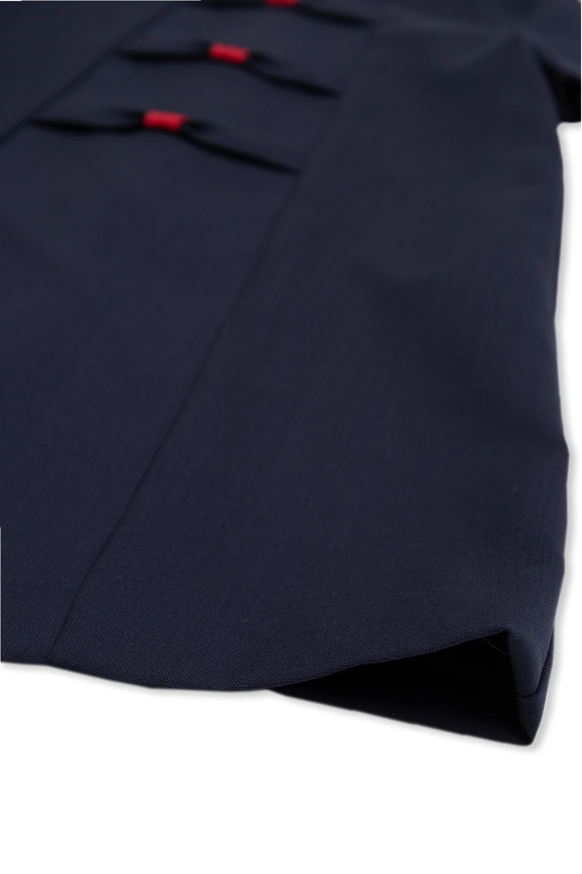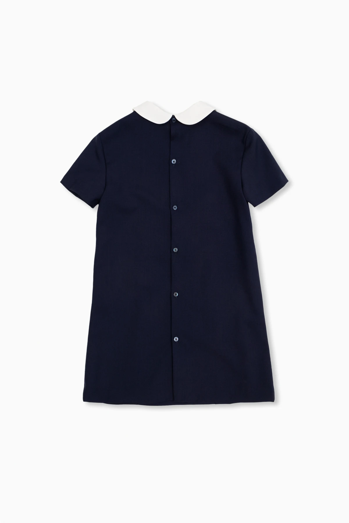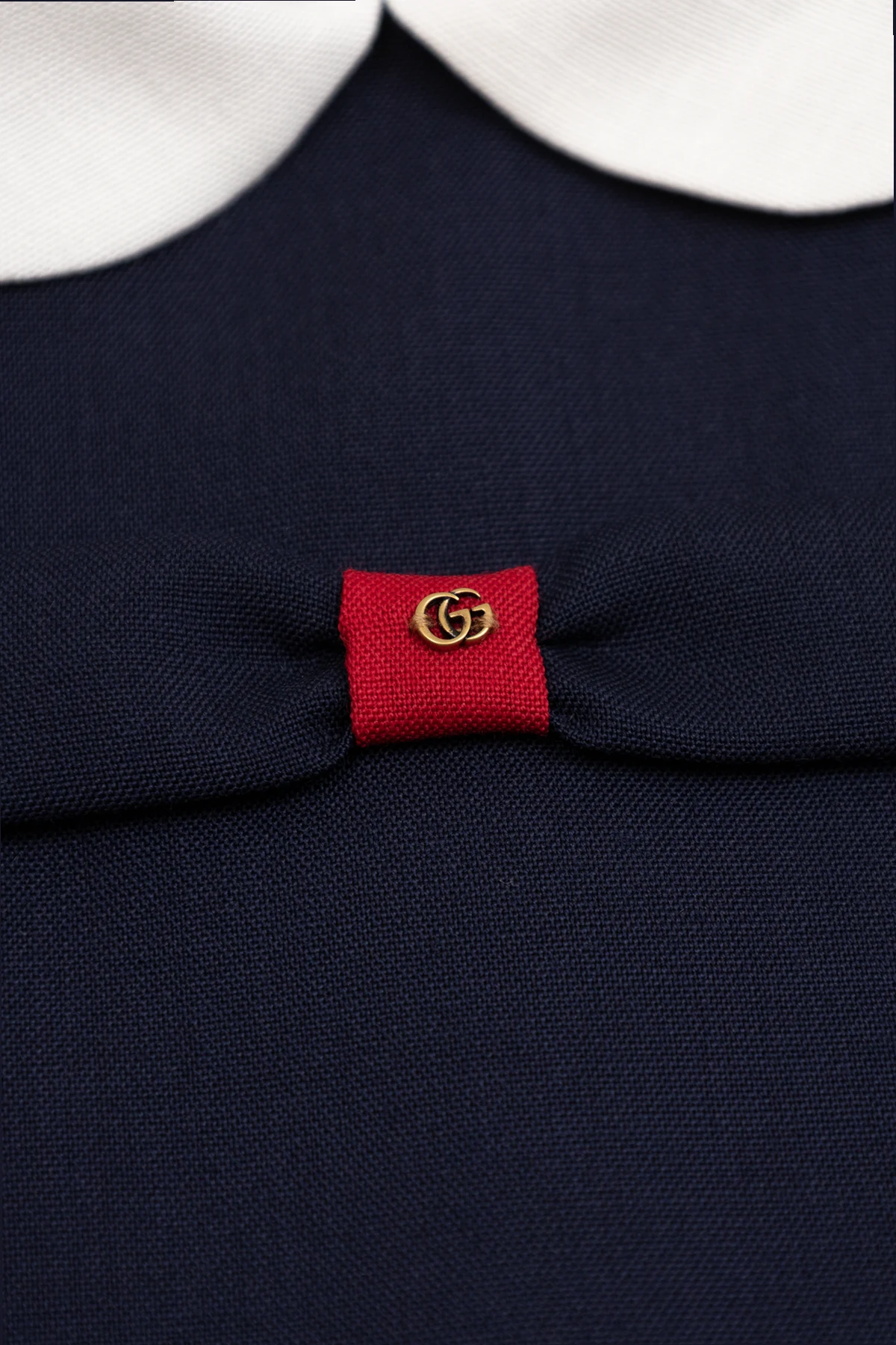 Navy blue dress from Gucci Kids. Made of wool, this style fastens with buttons at the back and showcases bow accompanied with an antiqued gold-tone logo plaque and red trims. It is complete with a white Peter Pan collar and short sleeves.