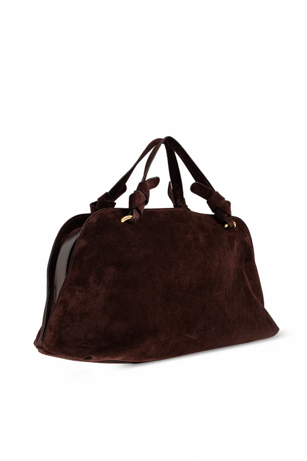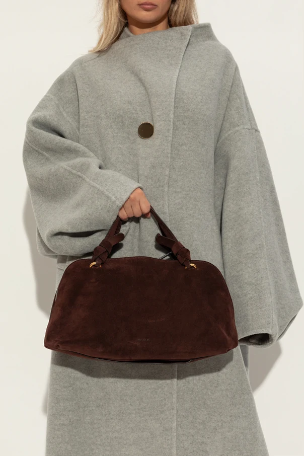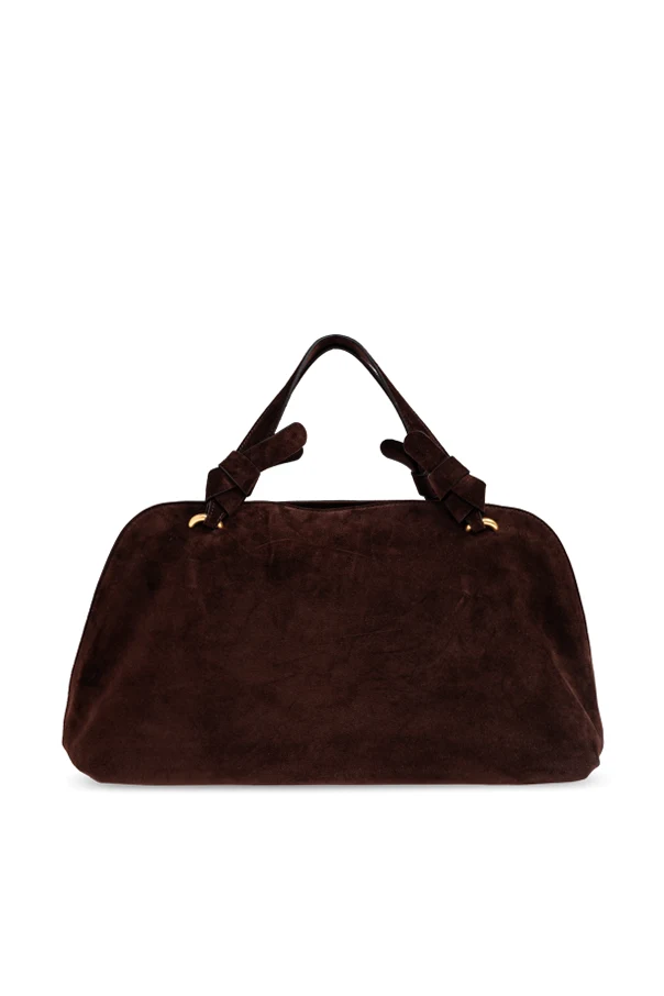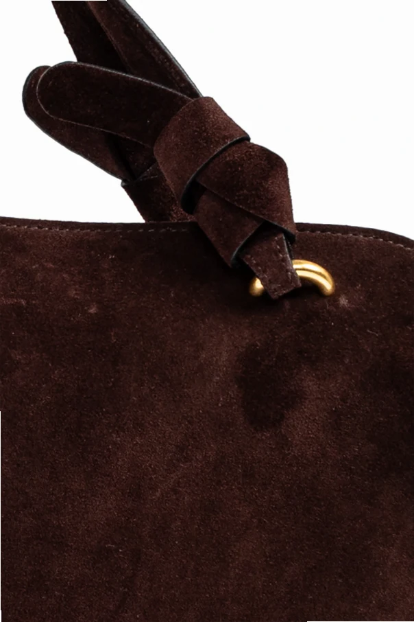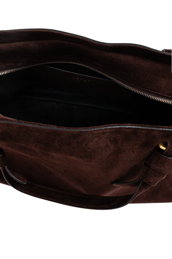 Das gesamte Modell wurde aus hochwertigem Veloursleder in einem edlen Braunton gefertigt, dessen matte Oberfläche dezent mit für Naturmaterialien typischen Schattierungen schimmert. Details aus Kalbsleder und ein Baumwollfutter runden den luxuriösen Charakter der Tasche ab.