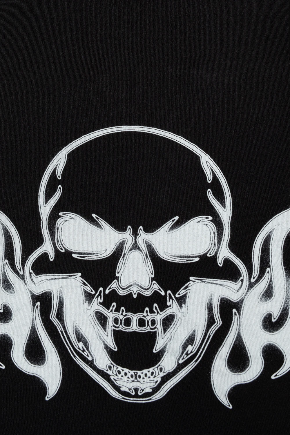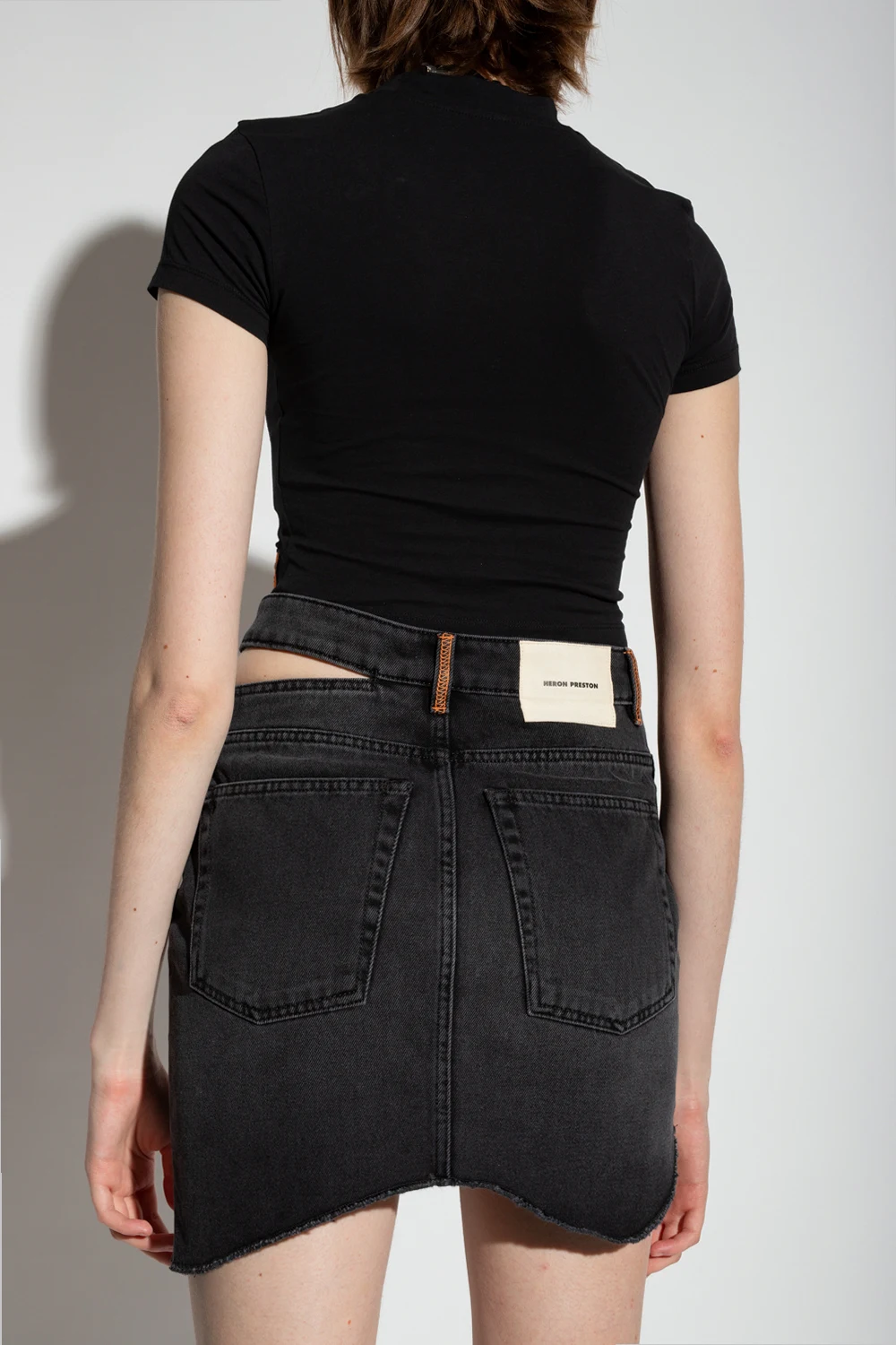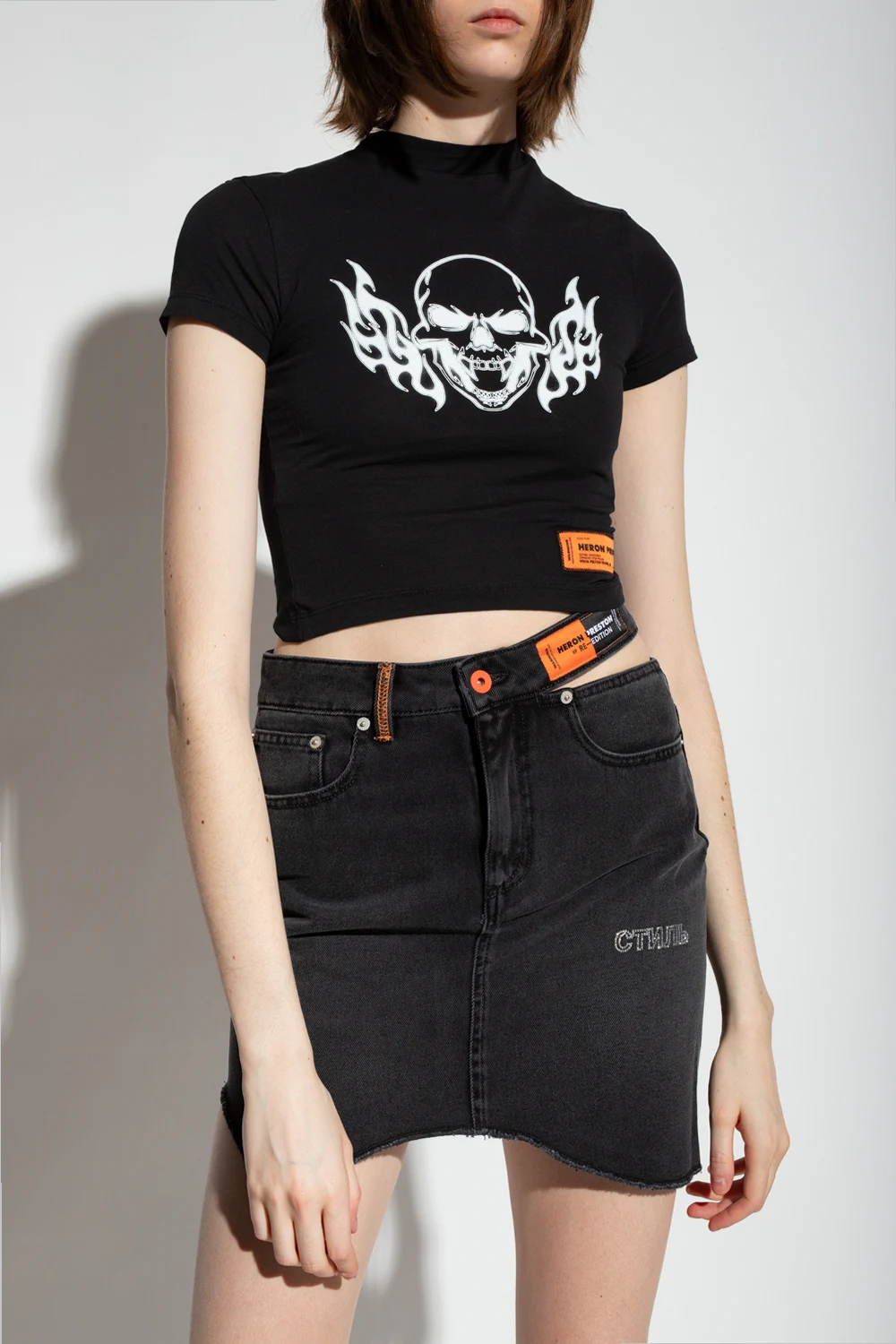 Black crewneck T-shirt Heron Preston. Cut from cotton with a cropped fit, this style features short sleeves and a white graphic print accompanied by a logo patch on the front.