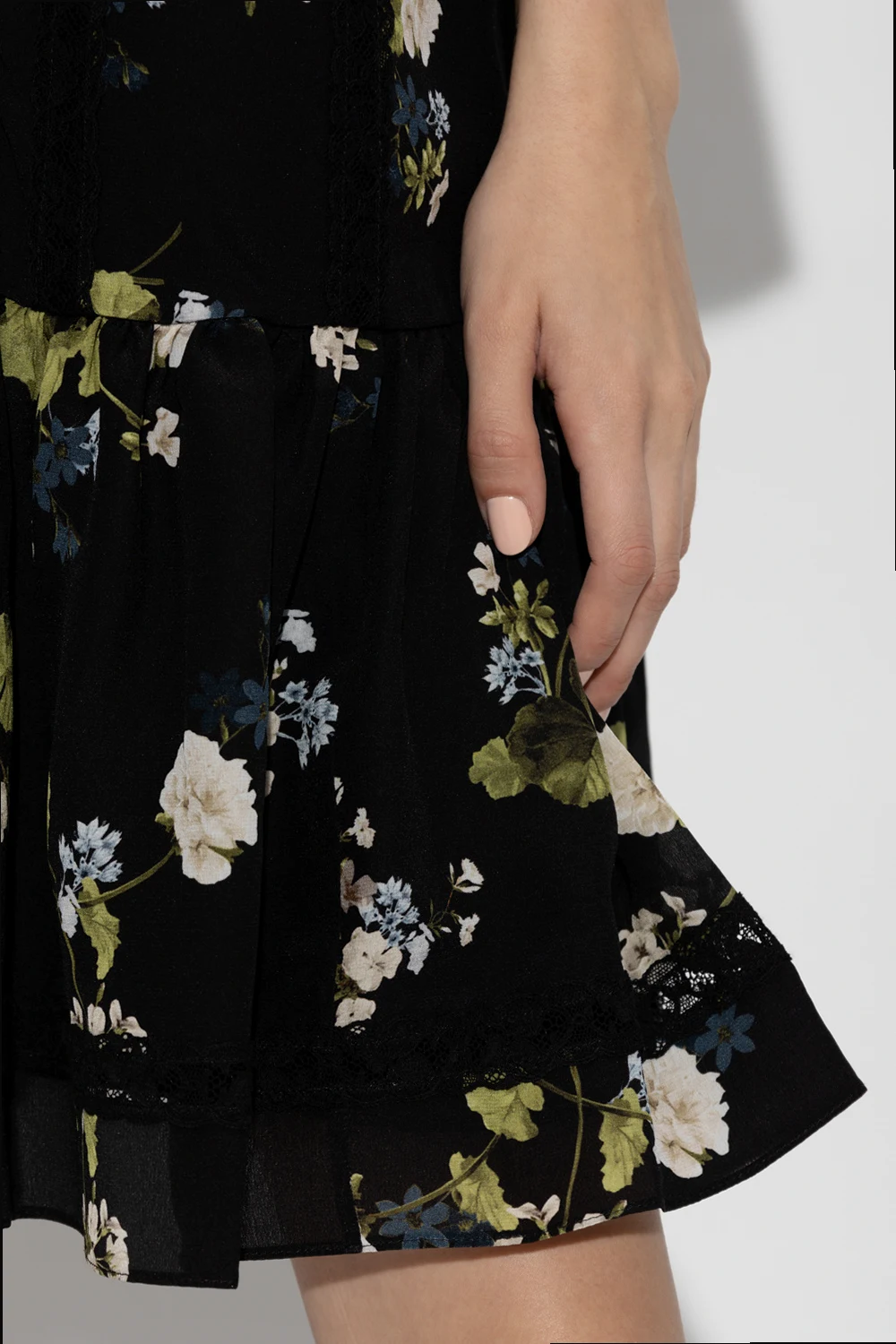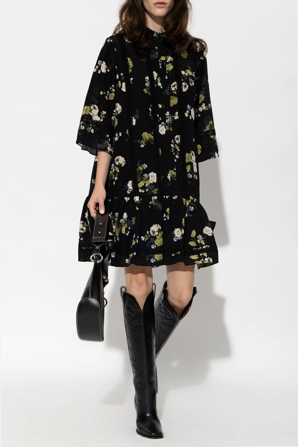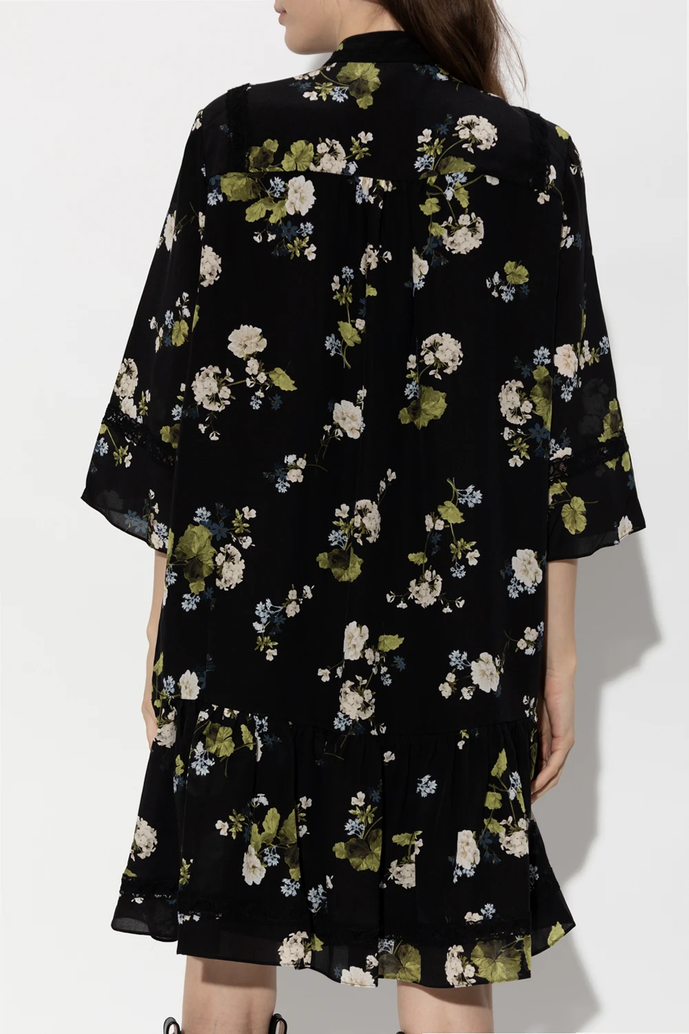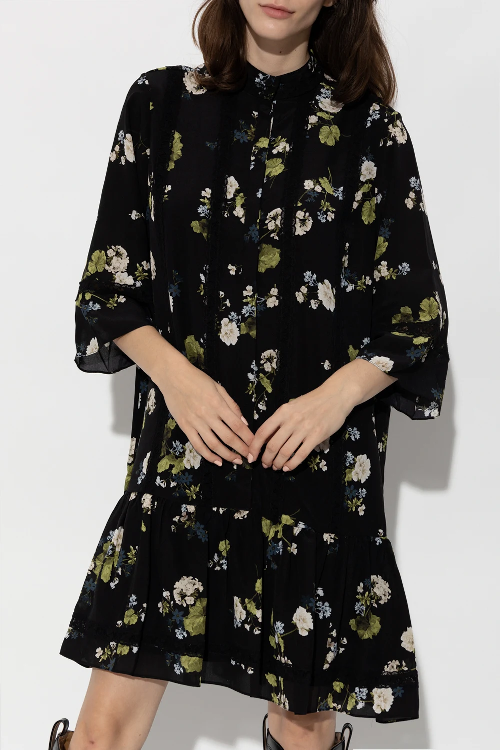Black ‘Bertram’ dress from Erdem. Crafted from silk, this loose-fitting design features buttons with a concealed placket, multicolored floral pattern with lace stripes, ruffle hem and 3/4 length sleeves.