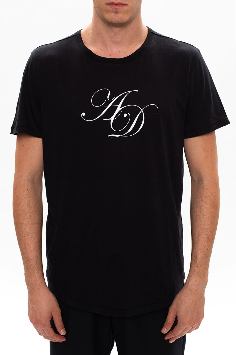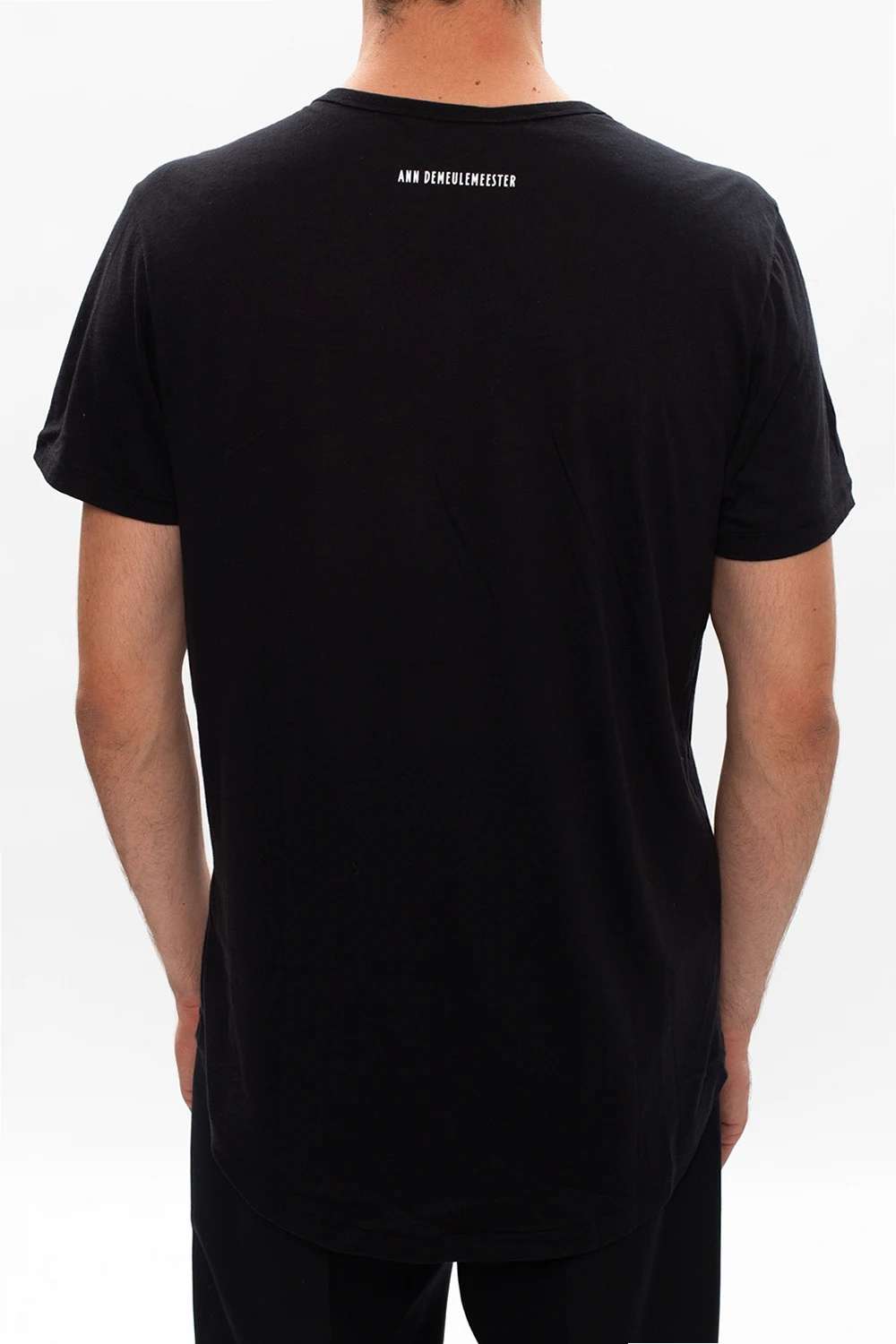 Black crewneck T-shirt from Ann Demeulemeester. Cut from cotton in regular fit, this style showcases white logo print.
