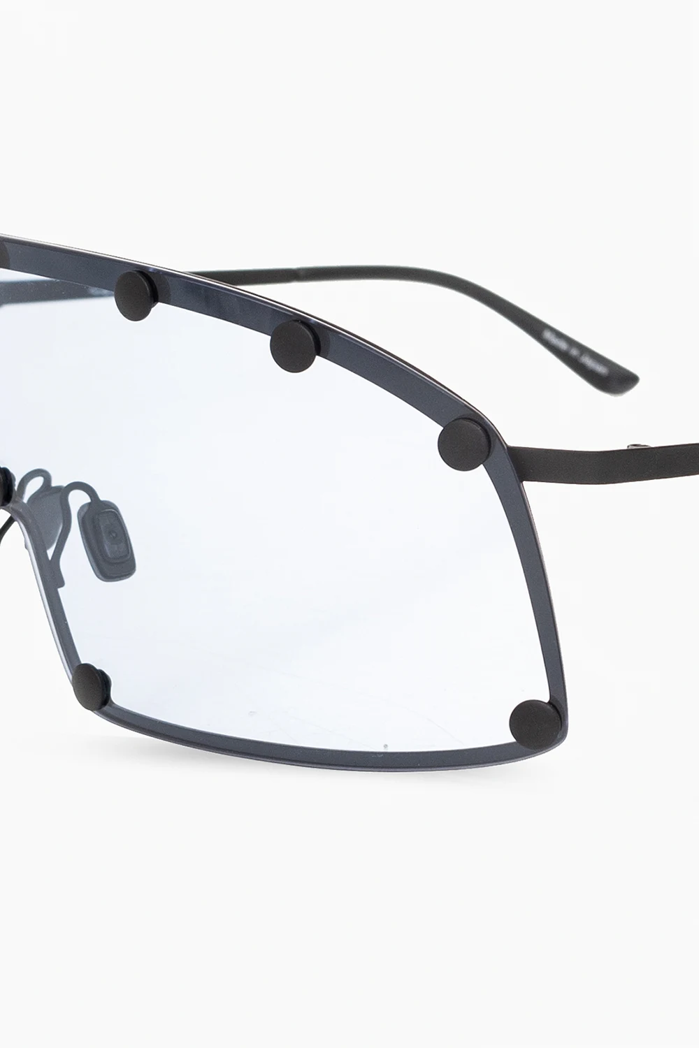 Black ‘Shielding’ sunglasses from Rick Owens. This pair has light blue lenses with 100% UVA/UVB protection. Comes with a logo-embossed leather case.