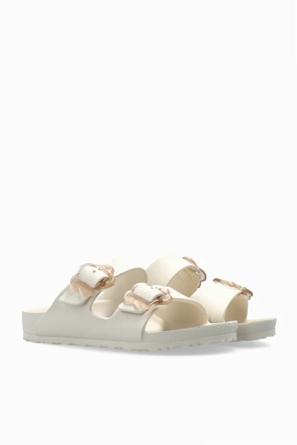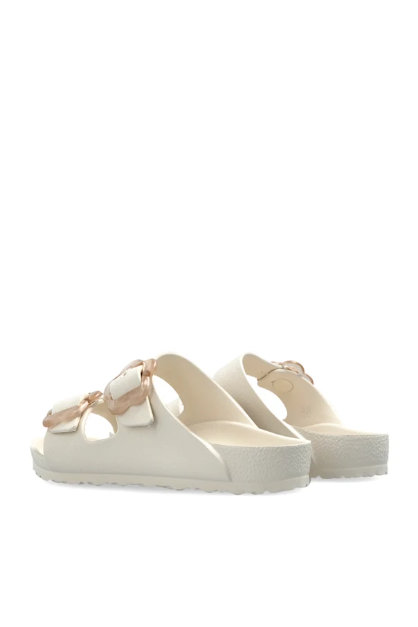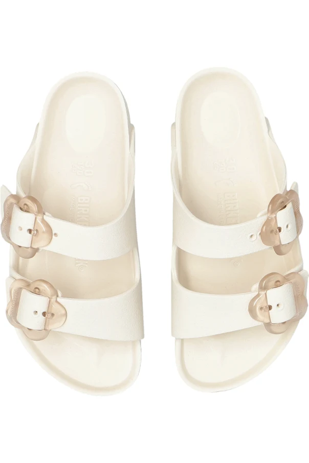 Arizona Flower EVA Kids Pantoletten der Marke Birkenstock Kids sind die Essenz von raffiniertem, kindlichem Stil und alltäglichem Tragekomfort. Die Konstruktion basiert auf einer flachen, ergonomisch geformten Sohle, die dem Fuß in jeder Situation optimalen Halt bietet. Die weiße Farbe in Kombination mit einem glatten, matten Finish unterstreicht die Eleganz und die außergewöhnliche Ästhetik dieses Produkts.