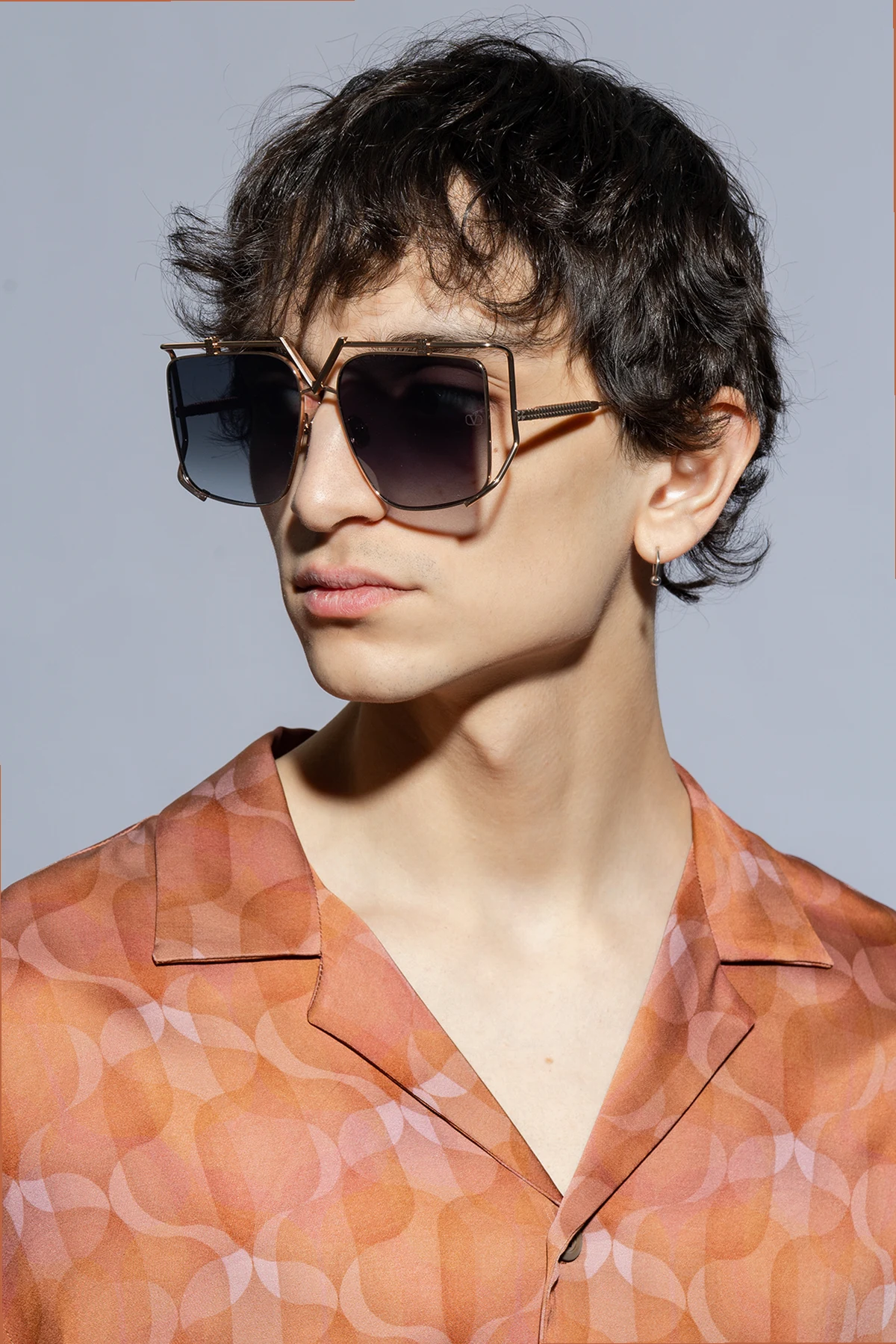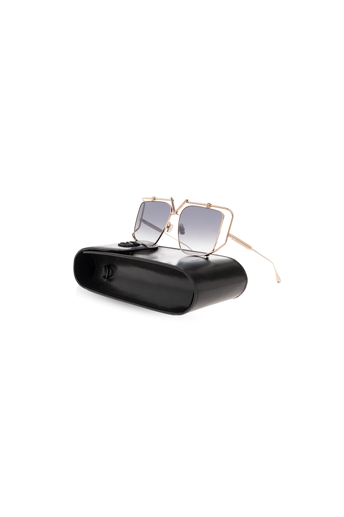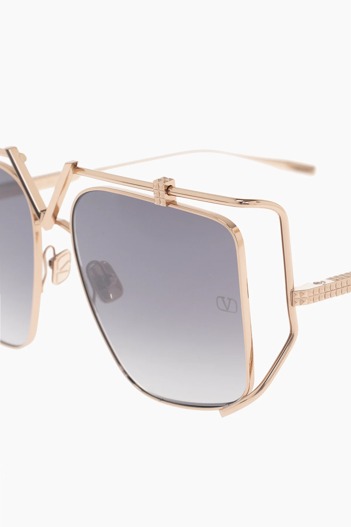 Gold-tone sunglasses from Valentino Eyewear. This square frame pair features side inserts with a logo and grey lenses with 100% UV protection. Case included.