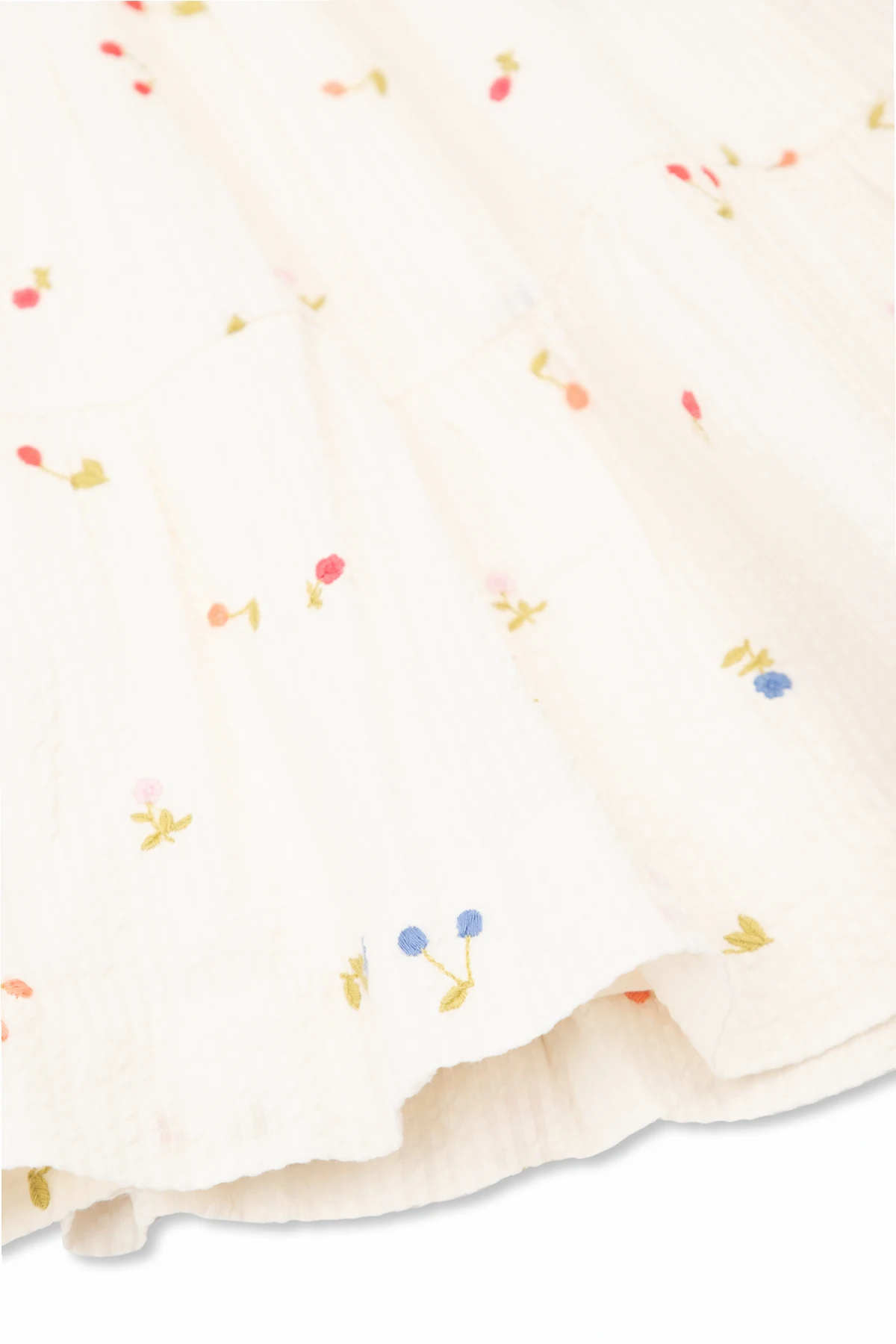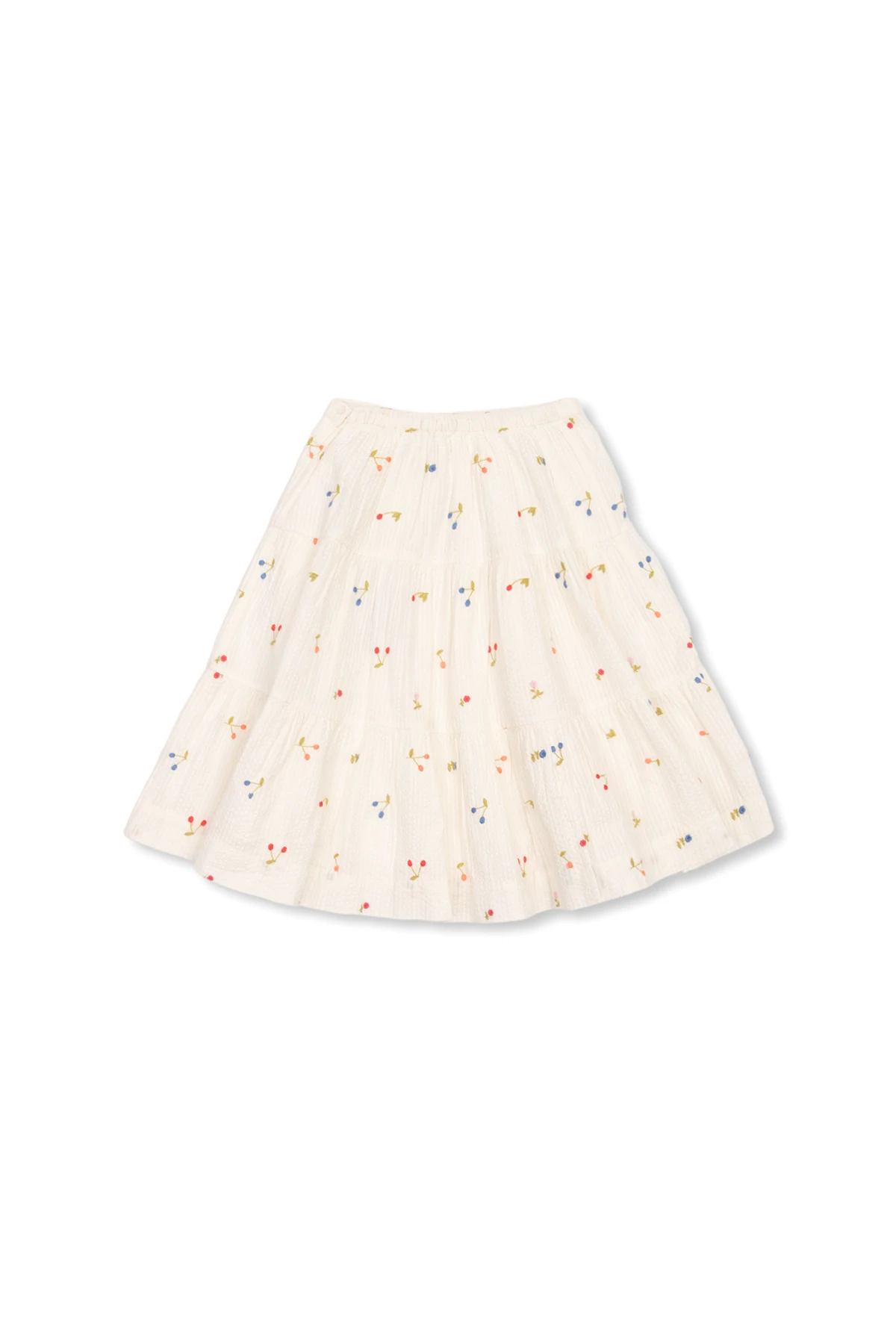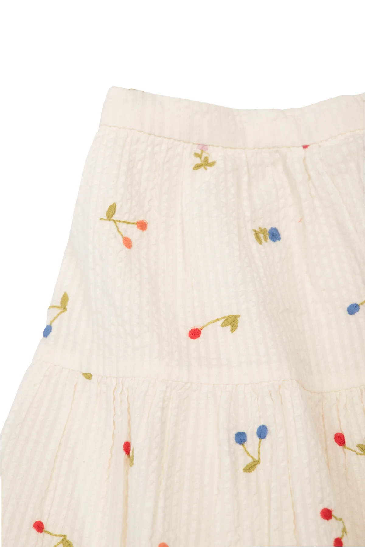 White ‘Lise’ skirt from Bonpoint. Made of textured cotton, this style is embellished with colourful graphic embroidery with fruits and features an elasticated waistband and a flared hem.