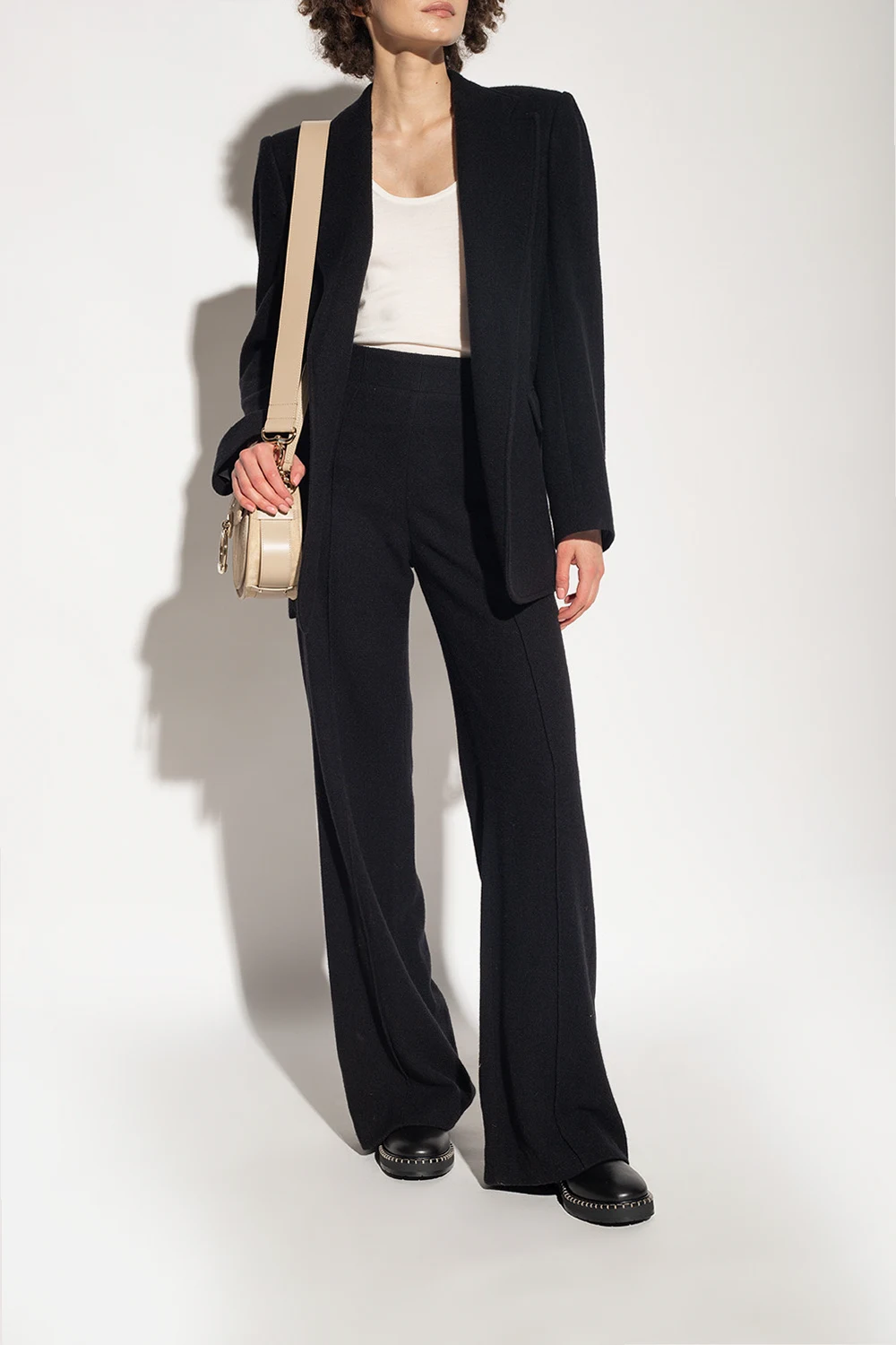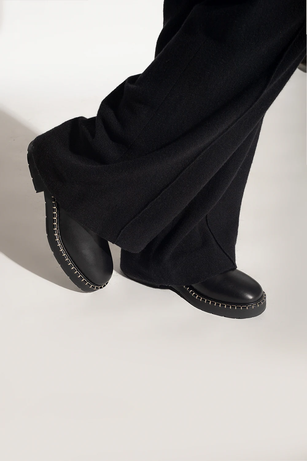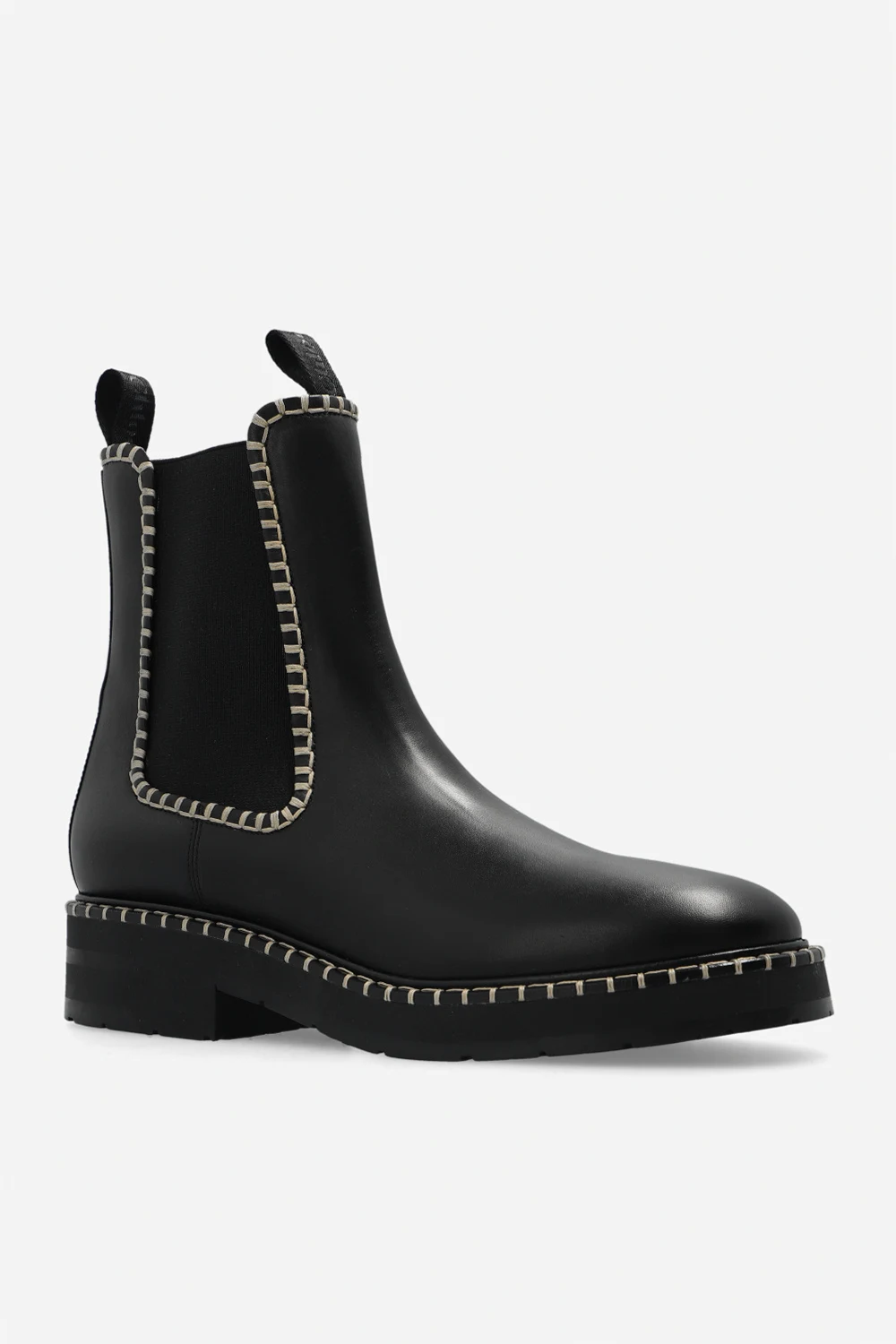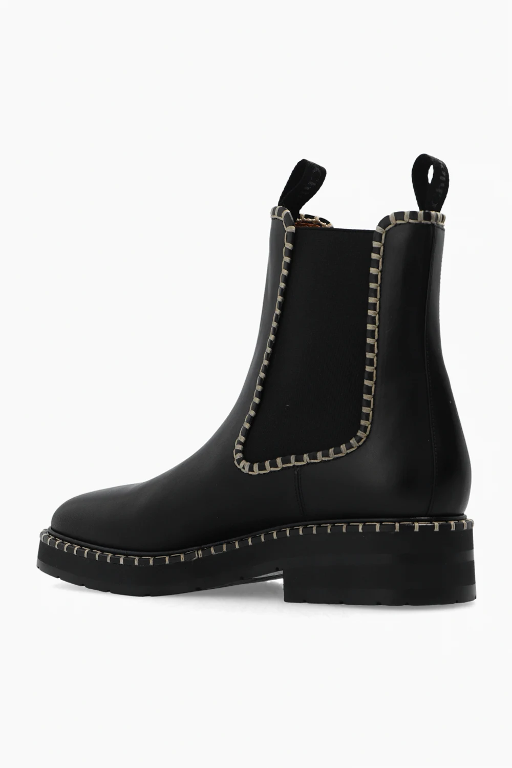 Black ‘Noua’ Chelsea boots from Chloé. Crafted from calf leather, this model features elastic side panels, light beige stitching details, fabric inserts with a logo print and black rubber sole.