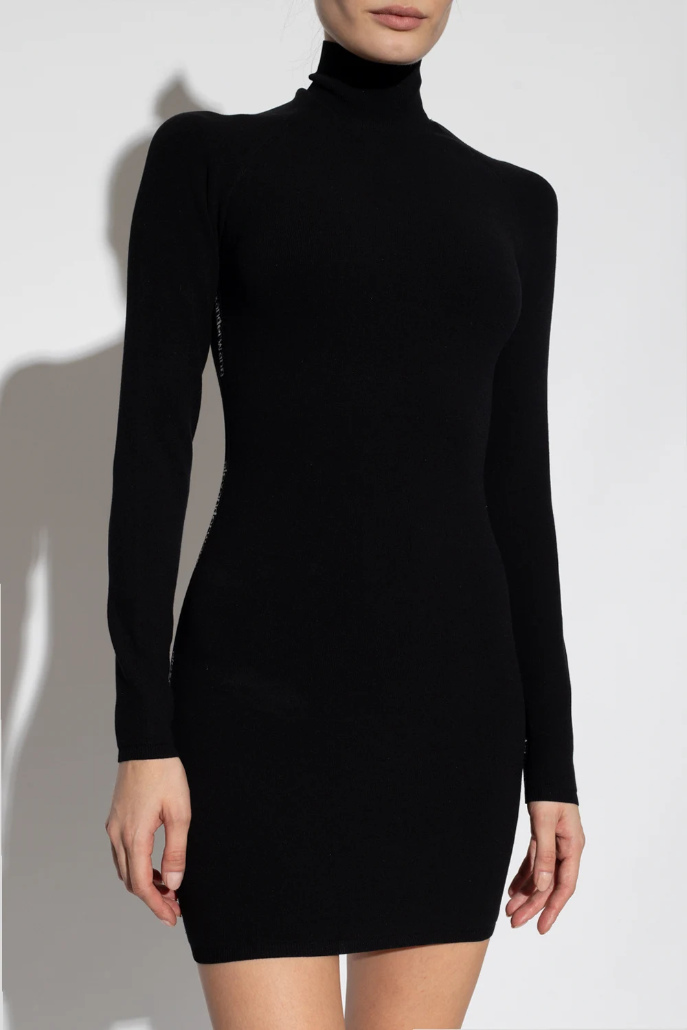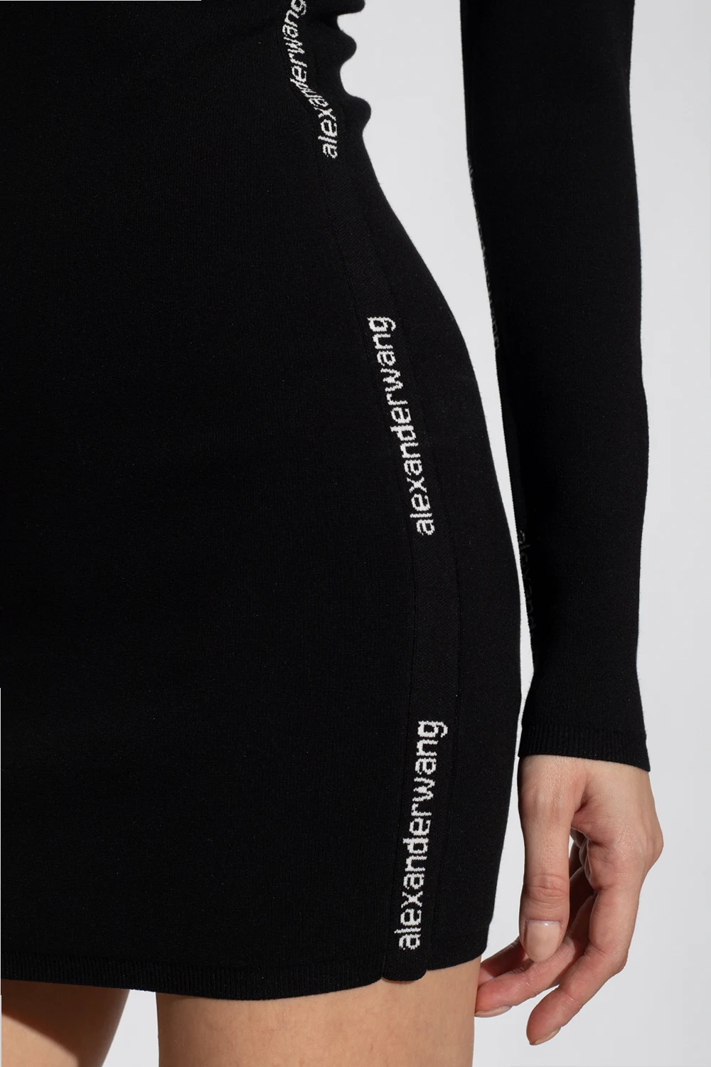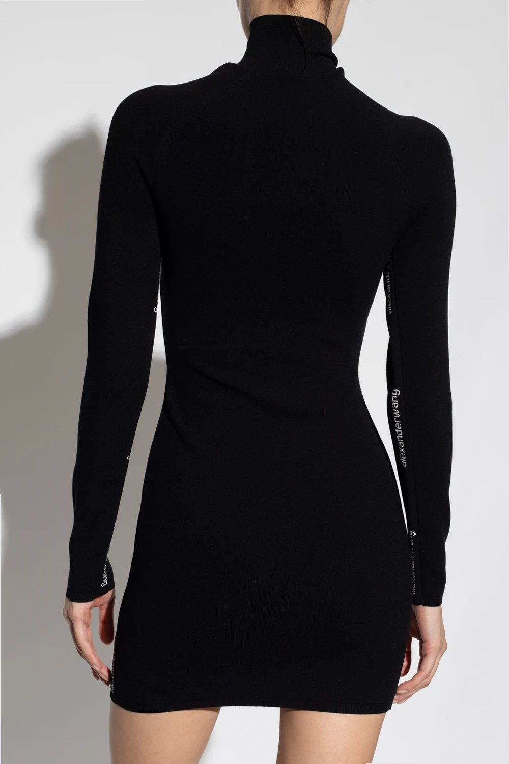 Black mini dress from T by Alexander Wang. Made of stretchy fabric, this design features a stand collar, ribbed edges and multiple inserts with white logo embroideries.