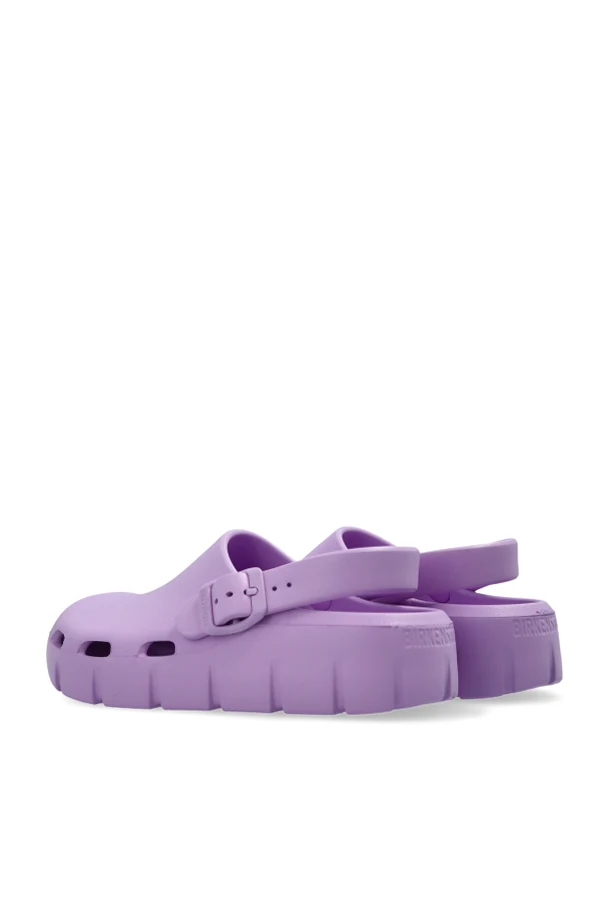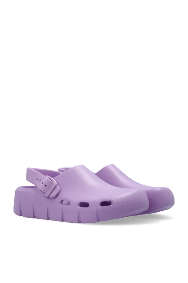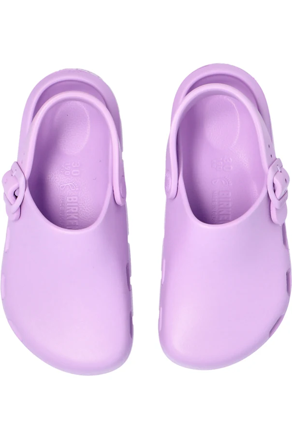 Die massive Sohle mit profiliertem Lauf sorgt dafür, dass das Schuhwerk auf verschiedensten Oberflächen hervorragend funktioniert, während der innovative EVA-Schaum außergewöhnliche Leichtigkeit, Flexibilität und Wasserbeständigkeit garantiert. Das subtile, geprägte Birkenstock-Logo, das sowohl auf dem Riemen als auch auf dem hinteren Teil der Sohle angebracht ist, steht für die Originalität und die hohe Qualität des Produkts.