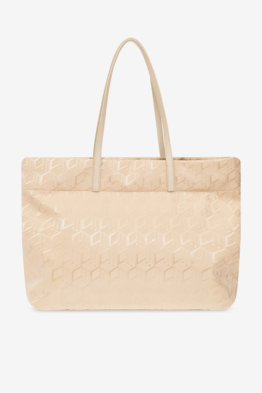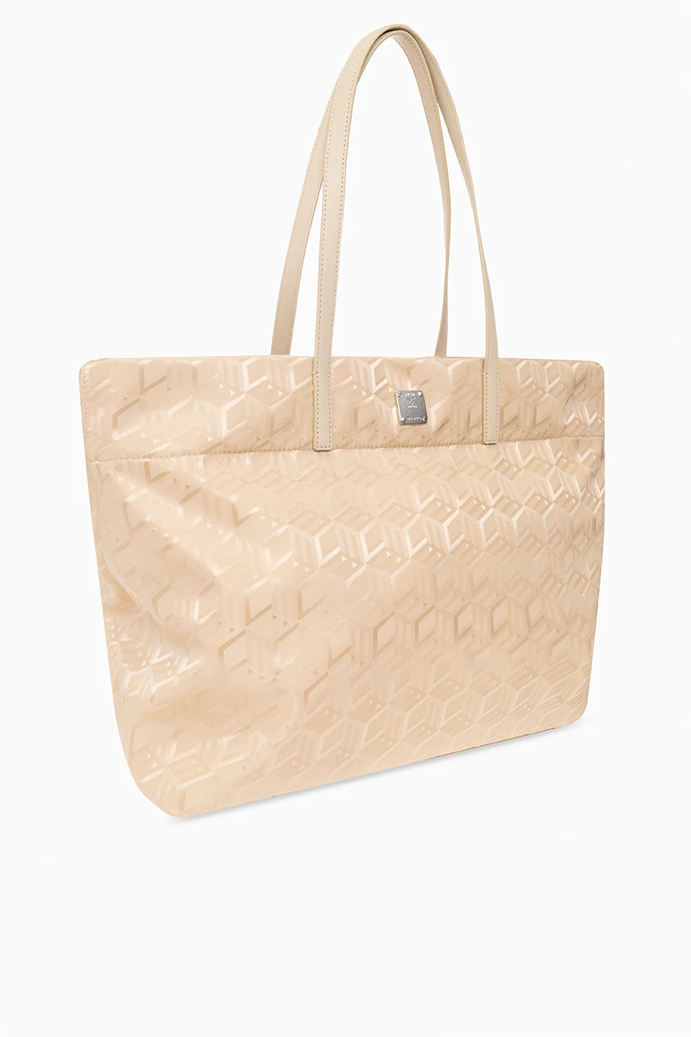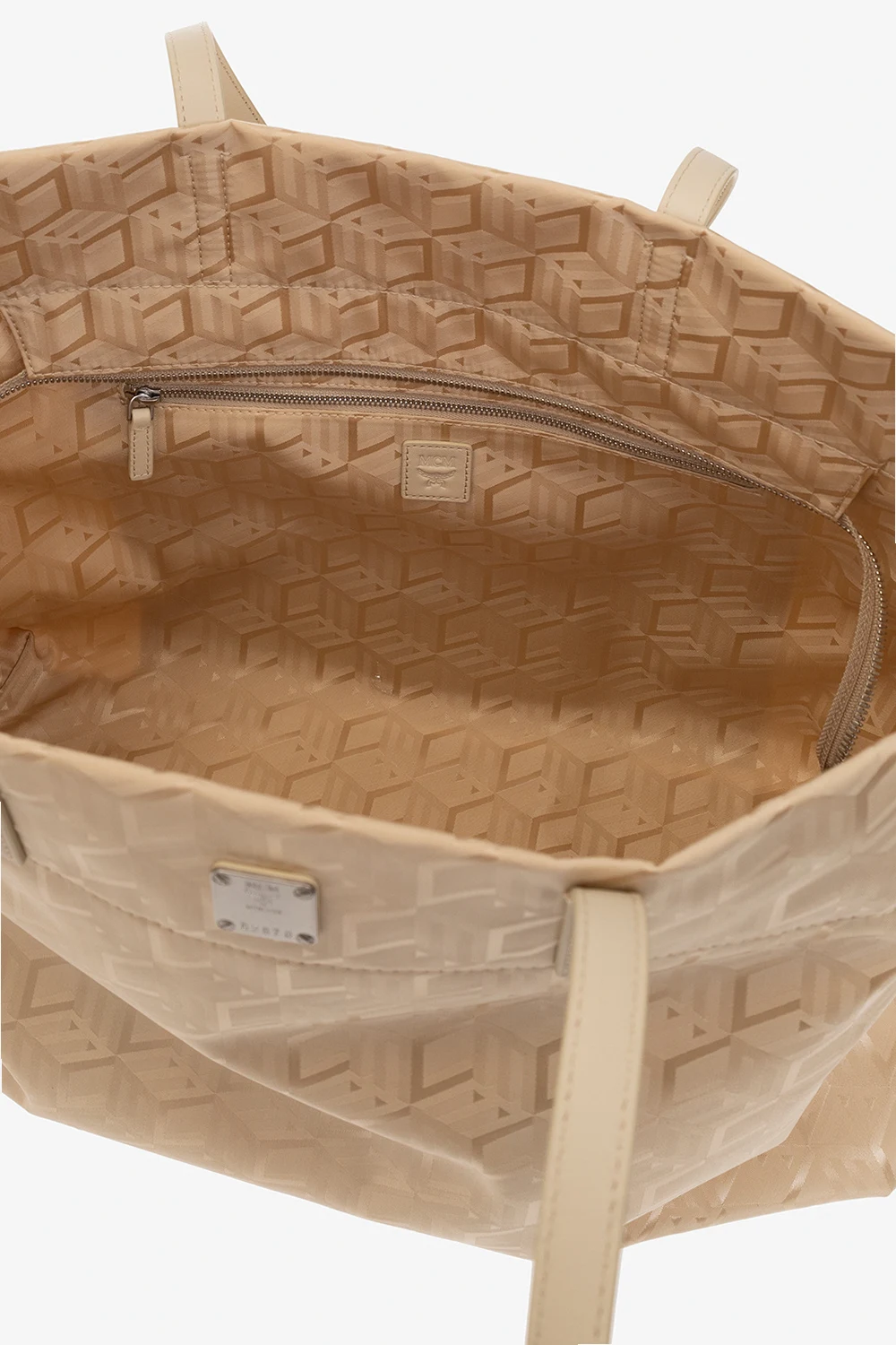 Beige ‘Aren’ shopper bag from MCM. Crafted from fabric with a reflective jacquard Cubic Monogram pattern and leather trims, this model is complete with a two-way zip, metal logo detail in silver-tone, two half-round handles and one internal compartment with one zip pocket.