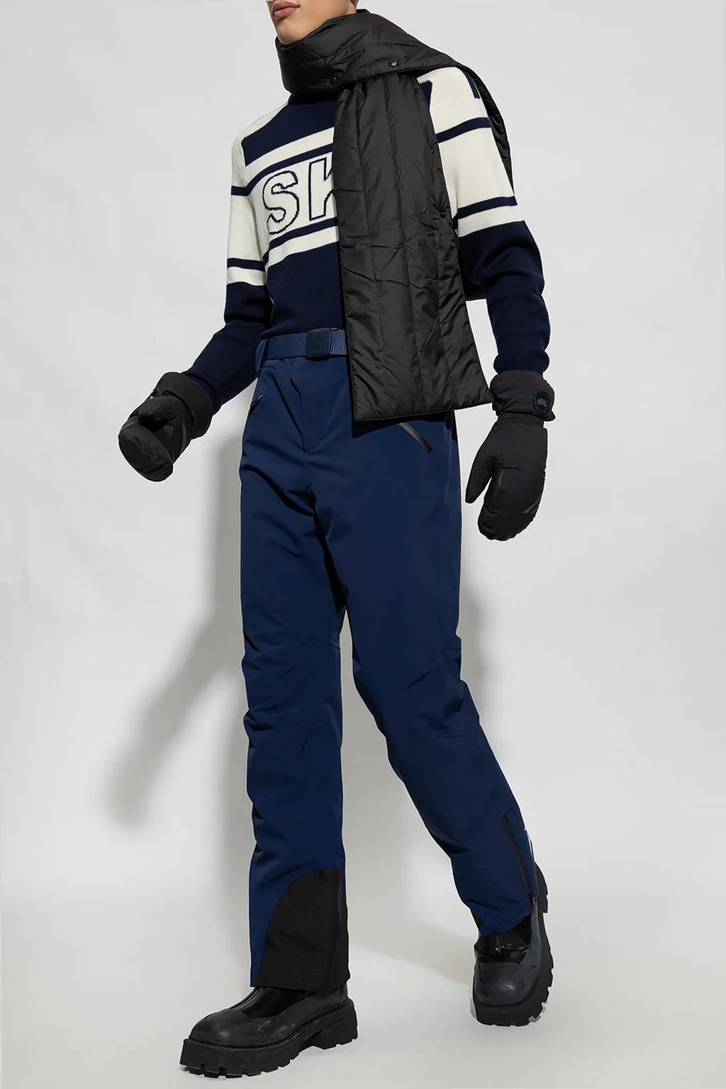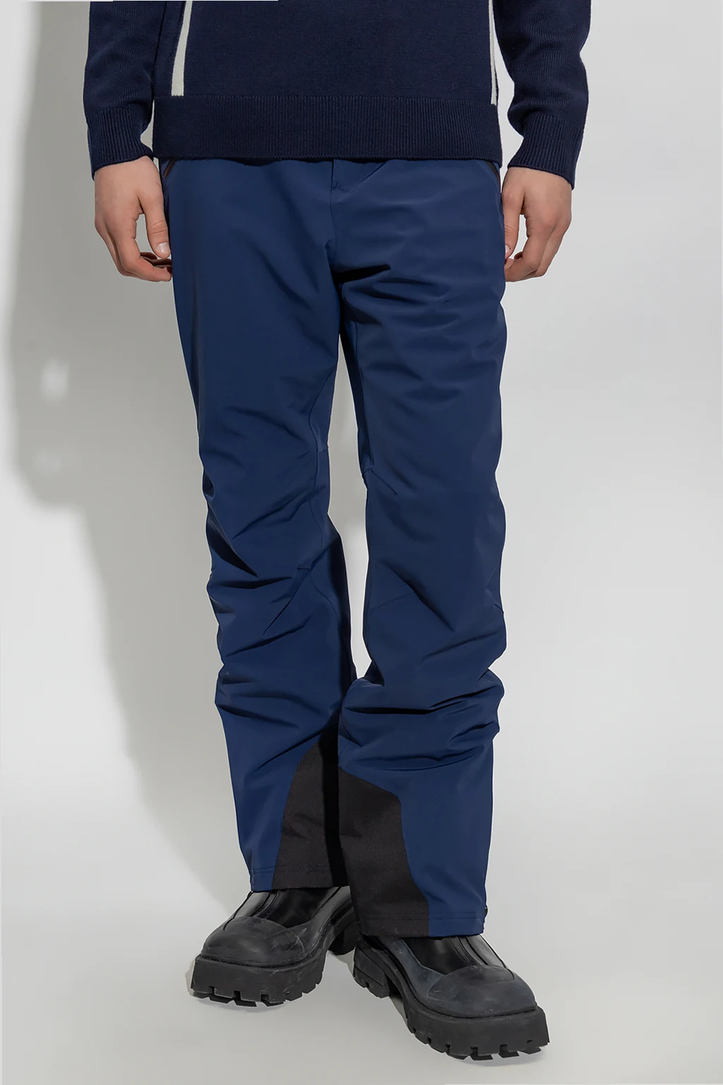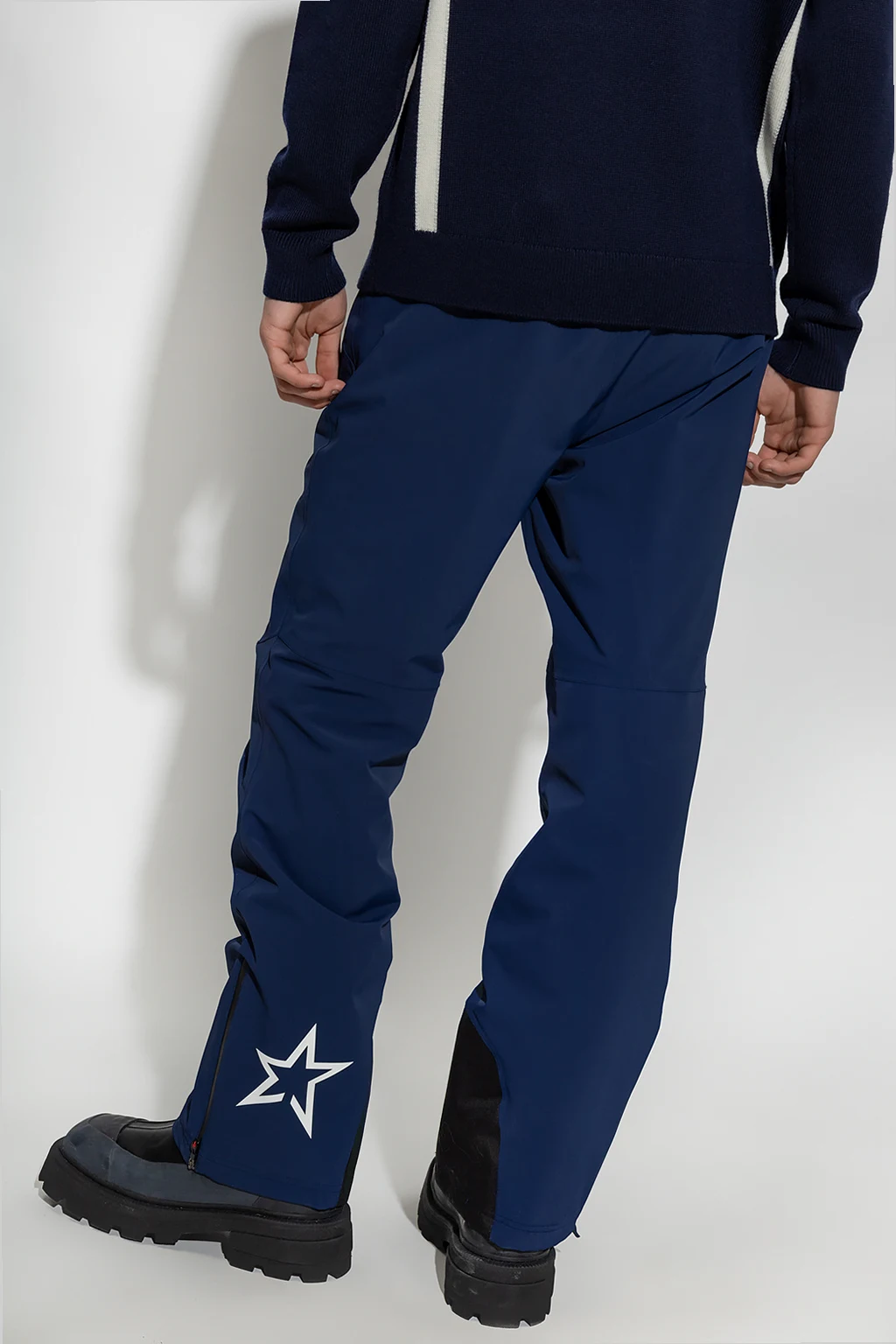 Navy ‘Chamonix’ ski trousers from Perfect Moment. Made of breathable Toray Dermizax™ stretch-shell, which protects against moisture and cold temperatures, insulated with recycled PrimaLoft® faux down. Fastened with a zip, hook and snap buttons, this fitted pair is complete with adjustable velcro straps, logo print, the brand’s signature white star, two front zip pockets and two-layered, flared legs – zipped outer layer and elasticated lining with snap fastenings.