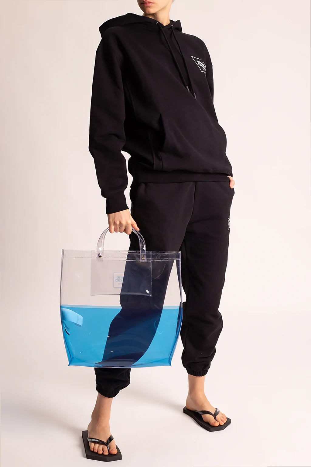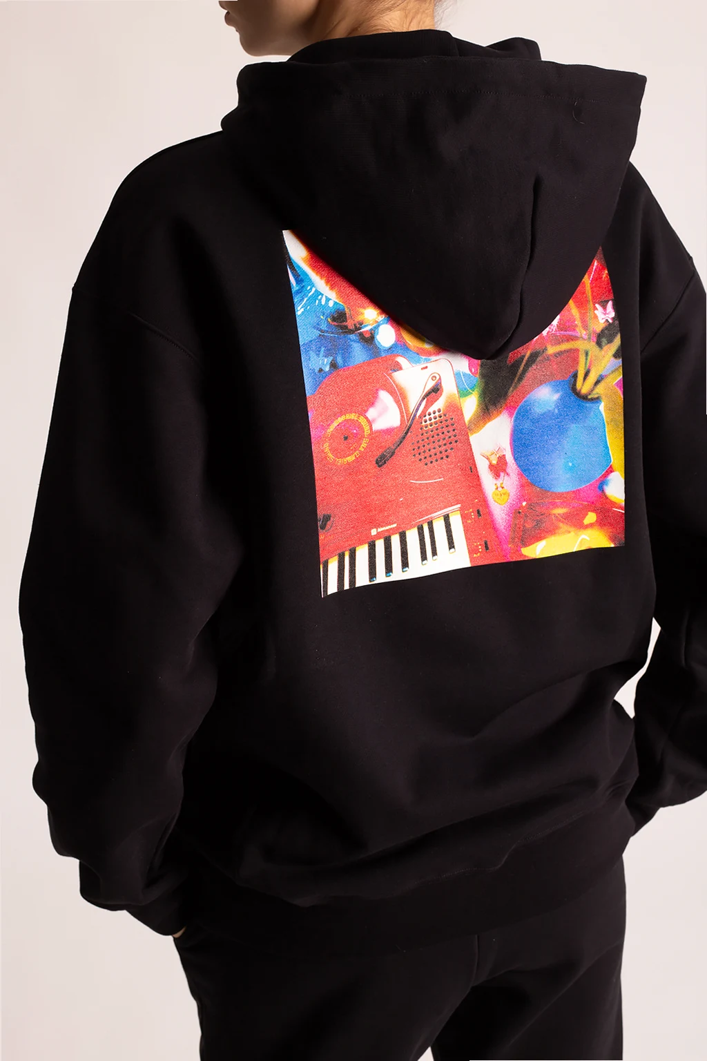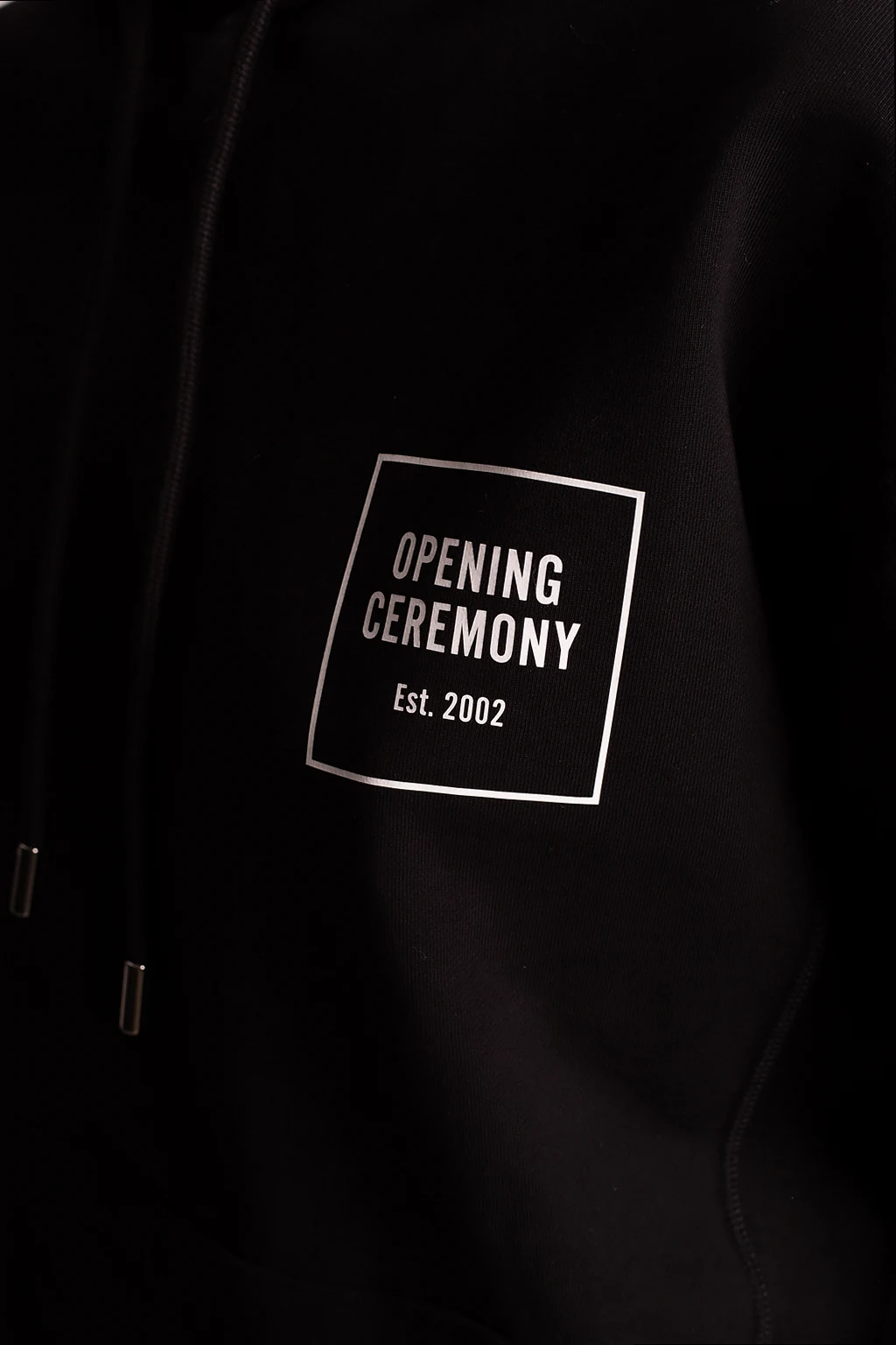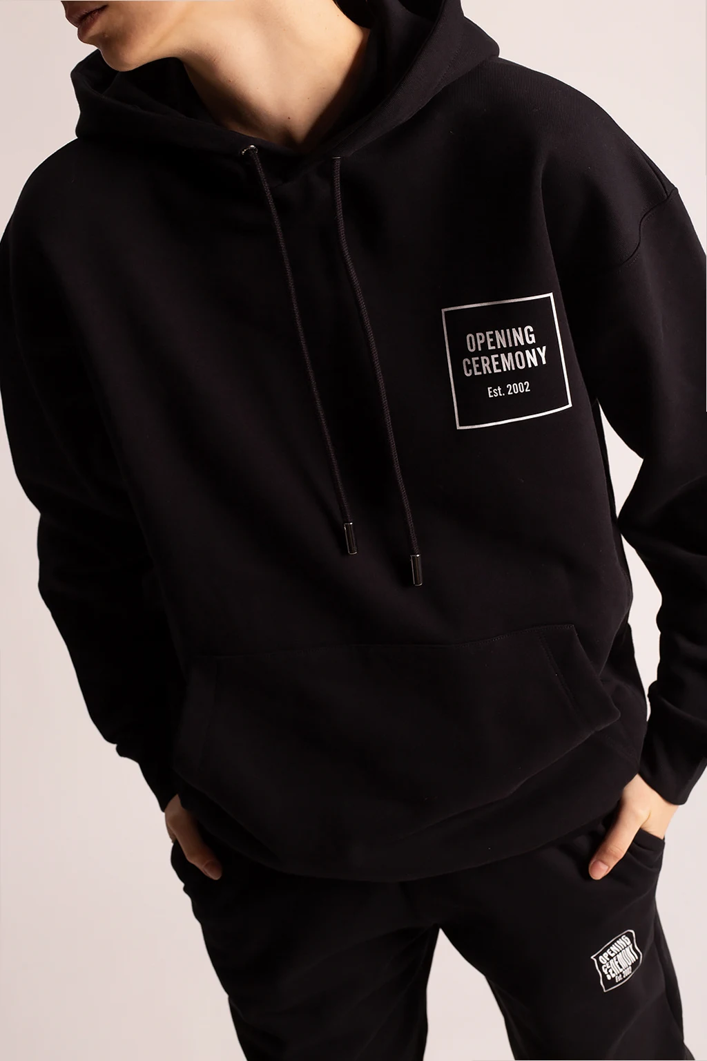 Black sweatshirt with a drawcord-adjustable hood from Opening Ceremony. Crafted from cotton jersey, this hoodie showcases a white print with the brand's logo on the front, a colourful graphic print at the back, a kangaroo pocket and a ribbed bottom hem and cuffs.