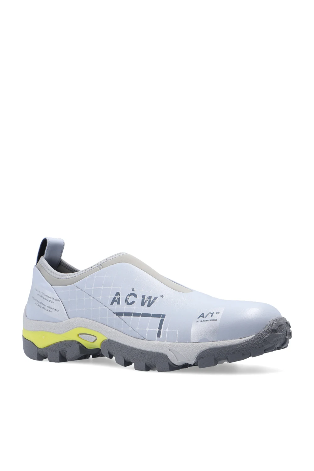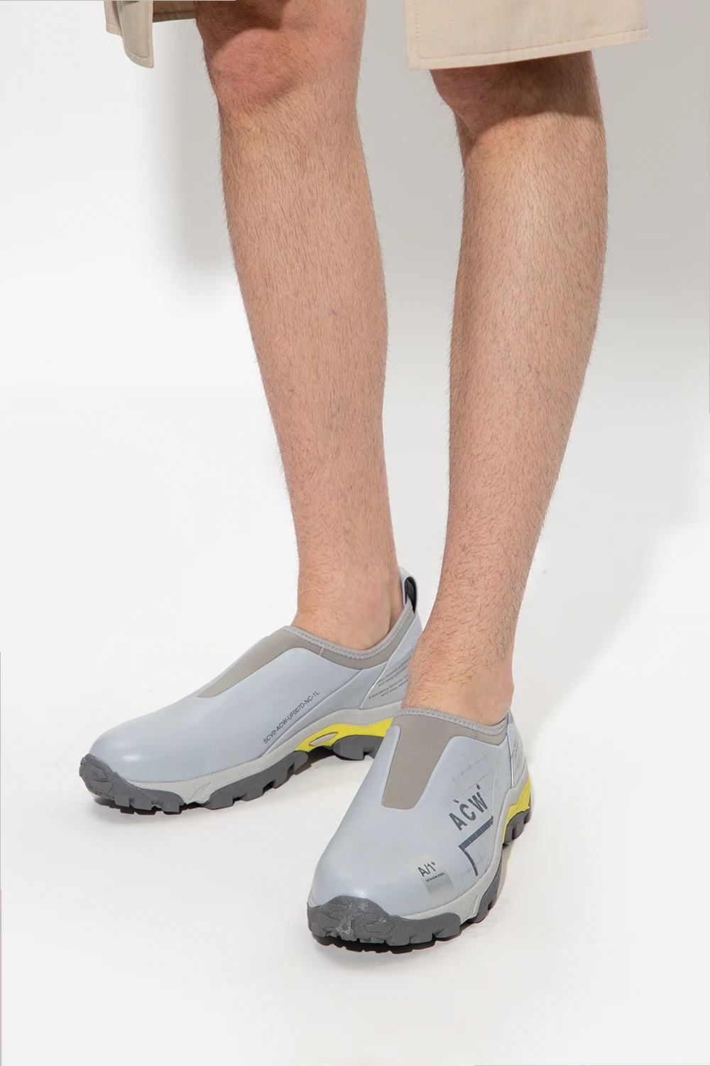 Grey and yellow sneakers from A-COLD-WALL*. Crafted from leather and fabric, this model features a slip-on silhouette, a dark grey graphic motif with the brand's logo and an orange rubber sole.