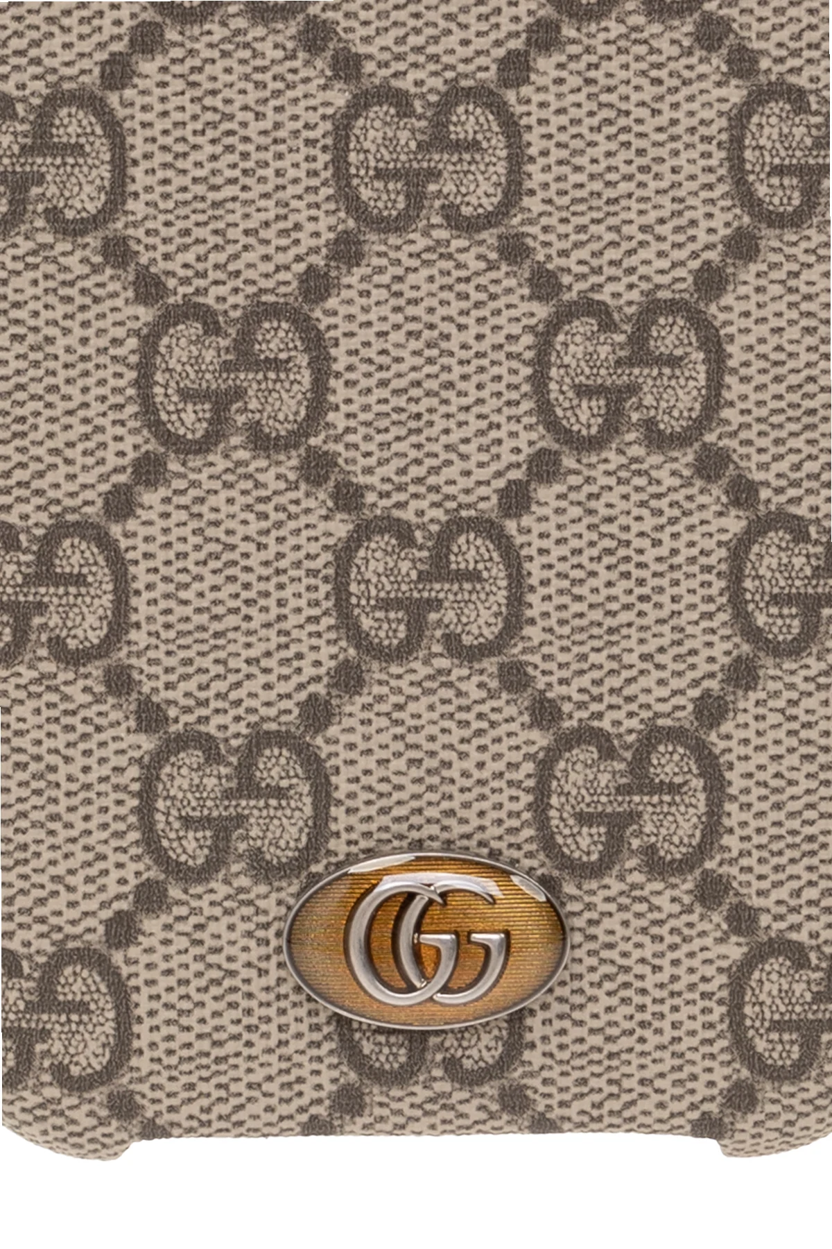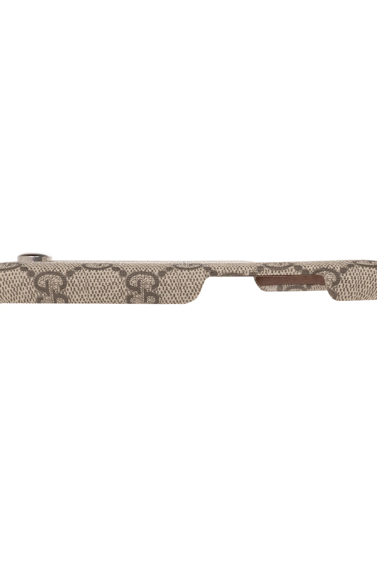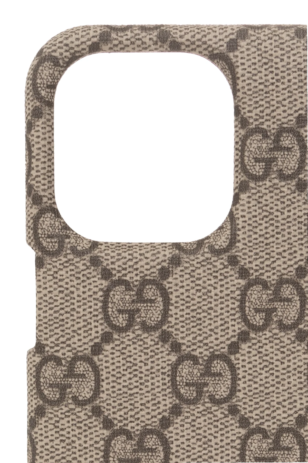 Beige and brown iPhone 14 Pro case from Gucci. Crafted from ‘GG Supreme’ canvas, this item showcases an enamelled logo application.